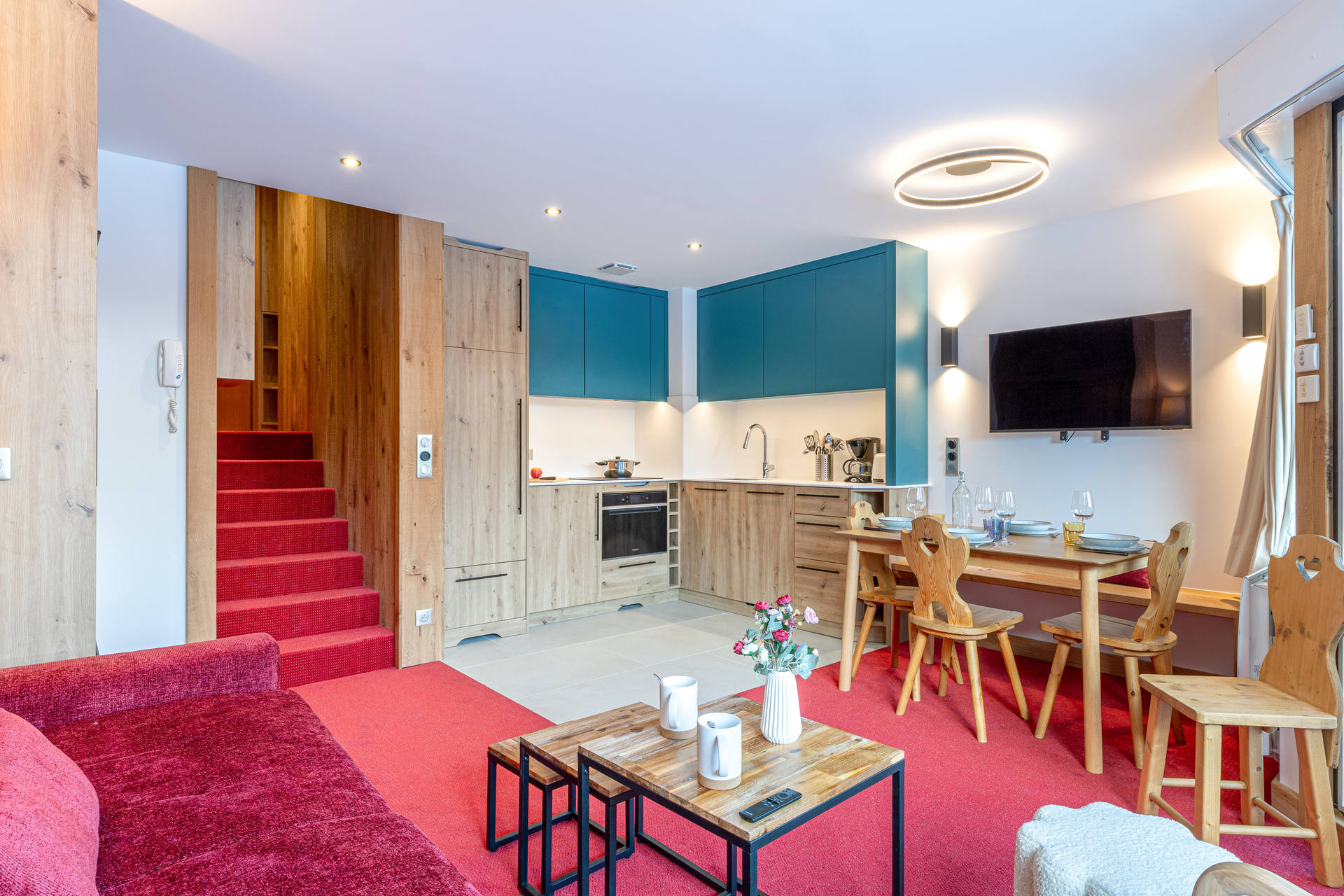 Equipée d'un micro-ondes avec grill, lave-vaisselle, réfrigérateur avec freezer, plaque induction, hotte aspirante et lave linge séchant