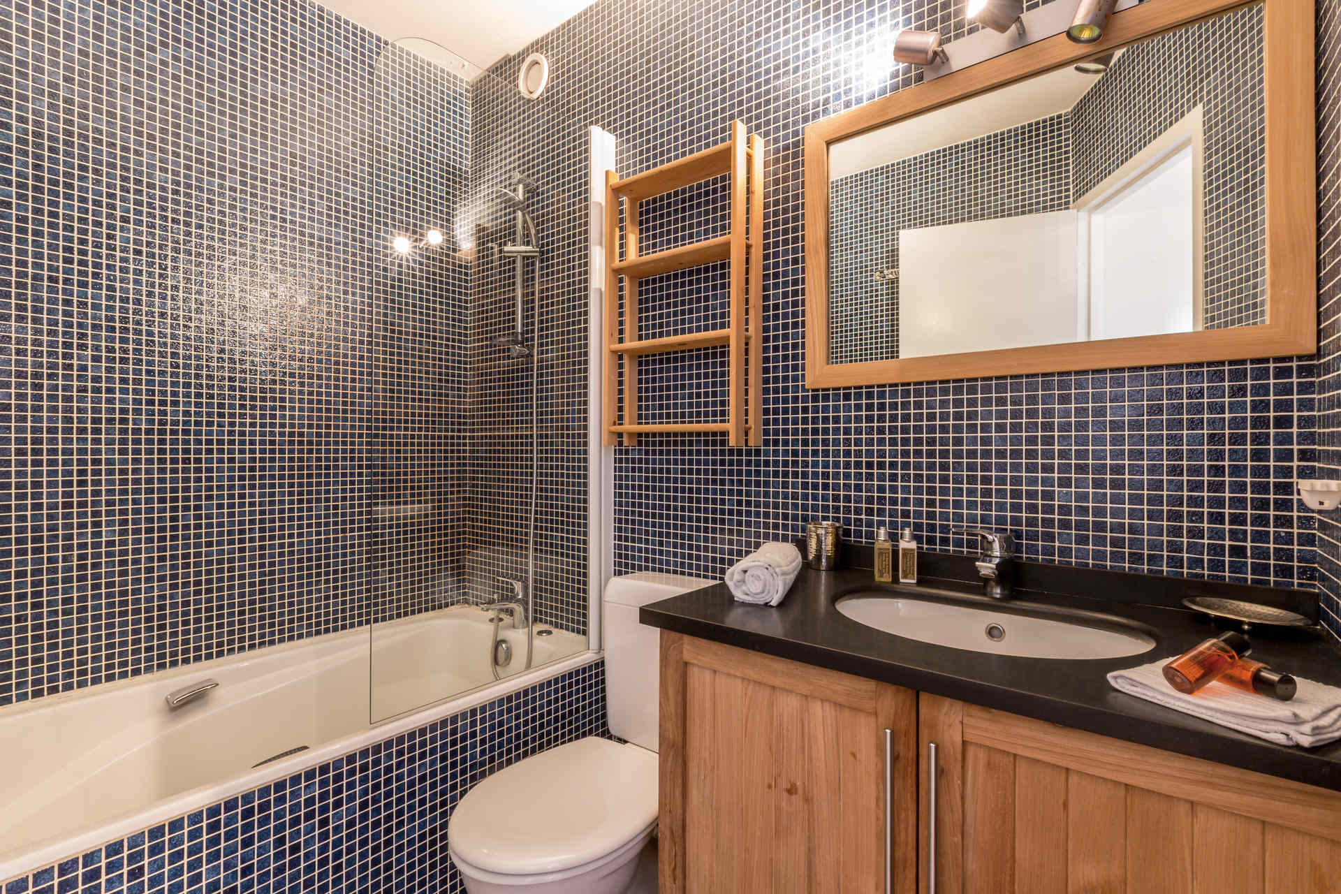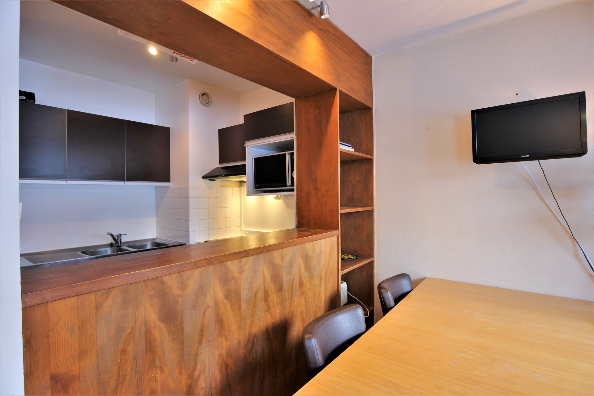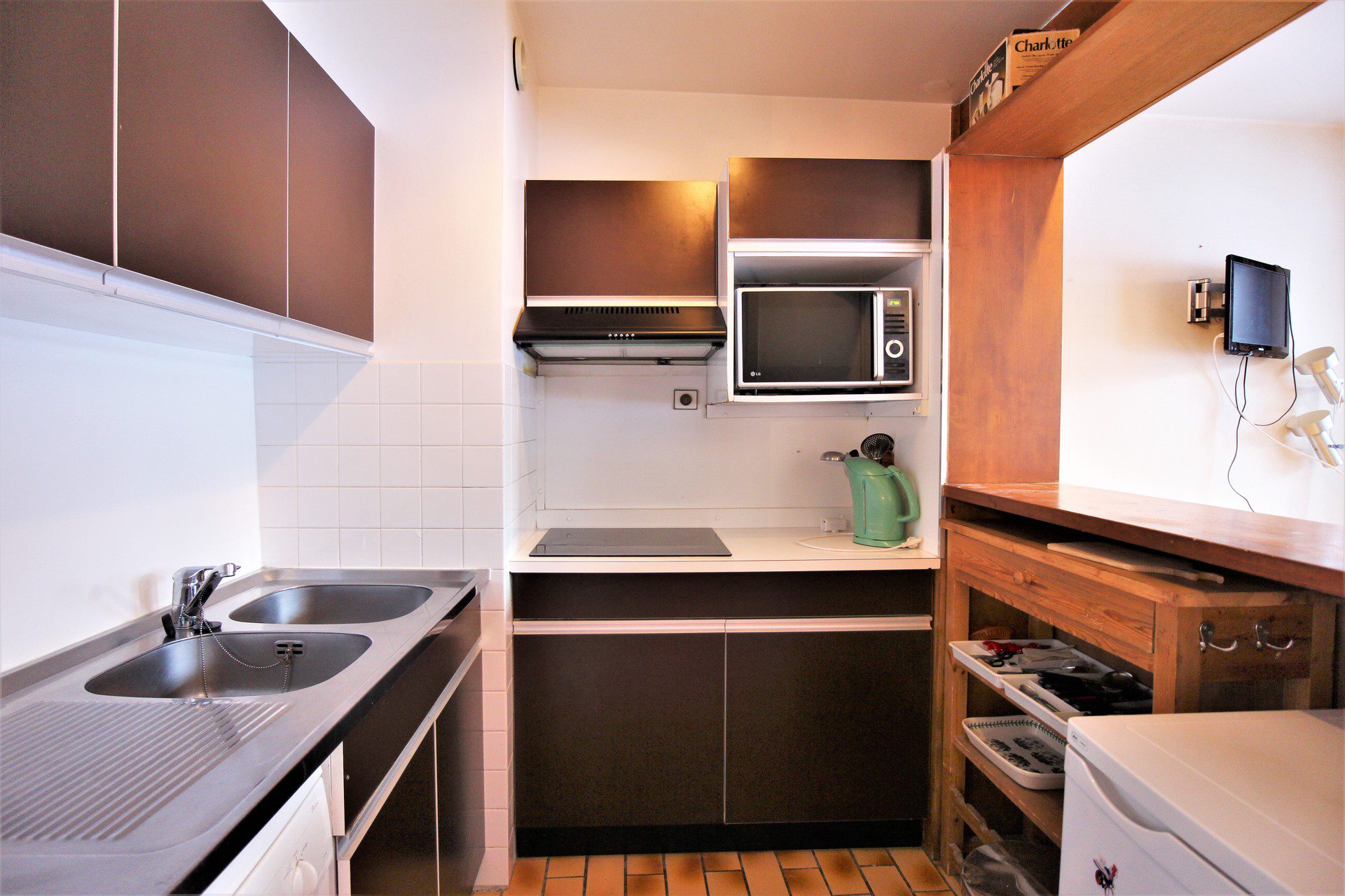 Equipée d'un four micro-ondes avec grill, plaque vitroceramique, hotte aspirante, réfrigérateur avec congélateur et lave-vaisselle.