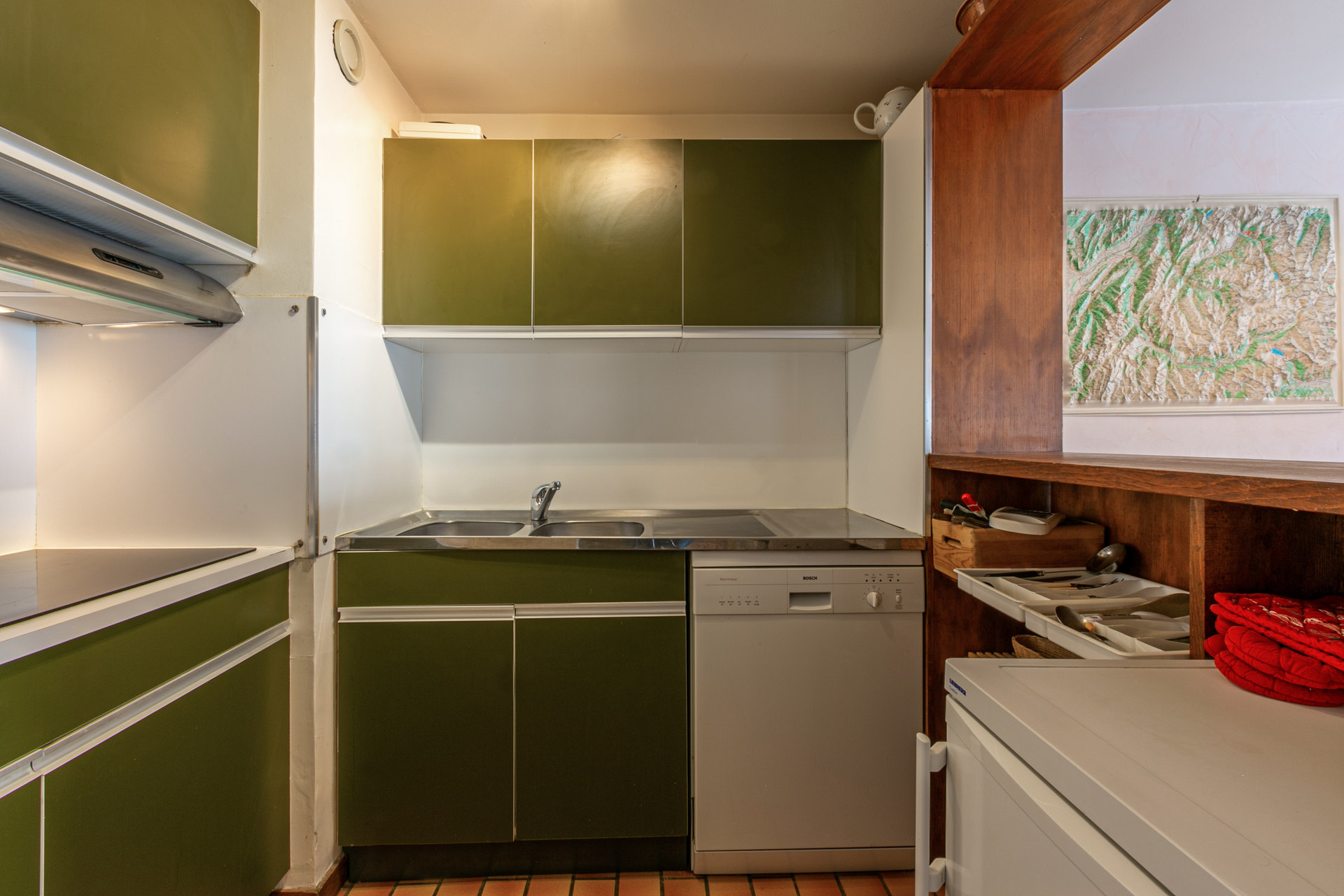 Equipée d'un four micro-ondes avec grill, plaque vitrocéramique, réfrigérateur avec congélateur et d'un lave vaisselle.