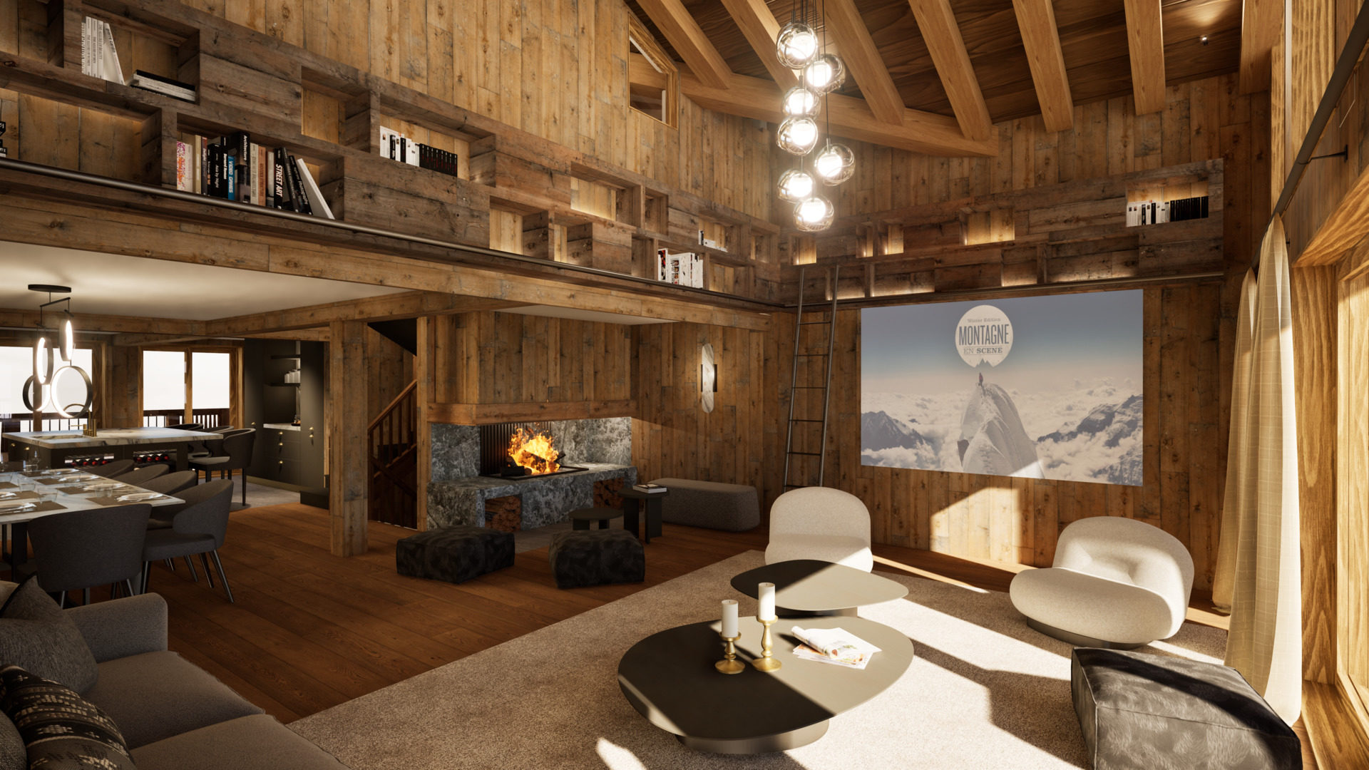 Salon lumineux avec grandes baies vitrées et cheminée, avec charpente apparente