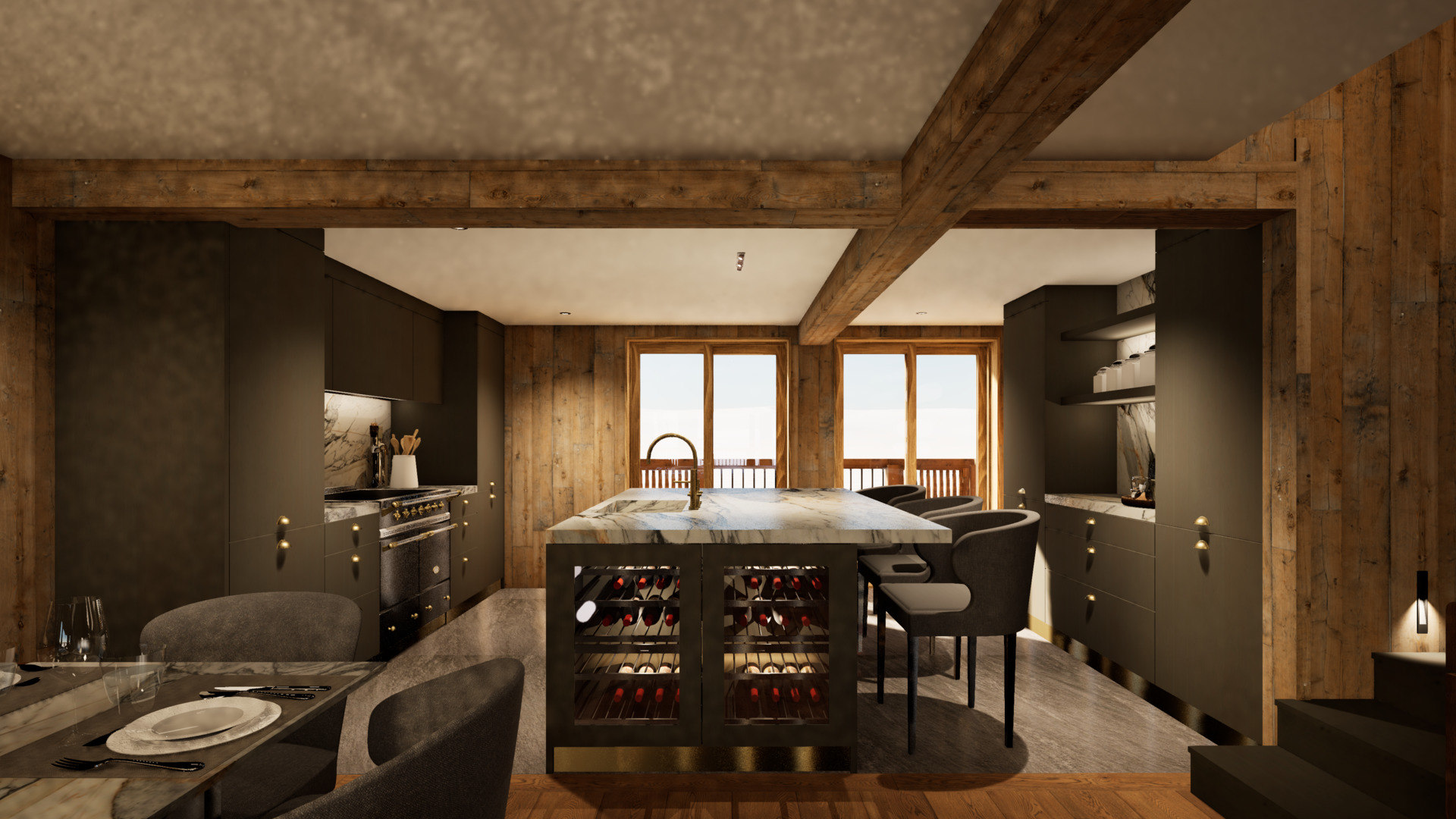 Cuisine ouverte: plaque induction, lave-vaisselle, réfrigérateur, congélateur, hotte aspirante, four, Micro-ondes, cave à vin, table bar avec chaises hautes.