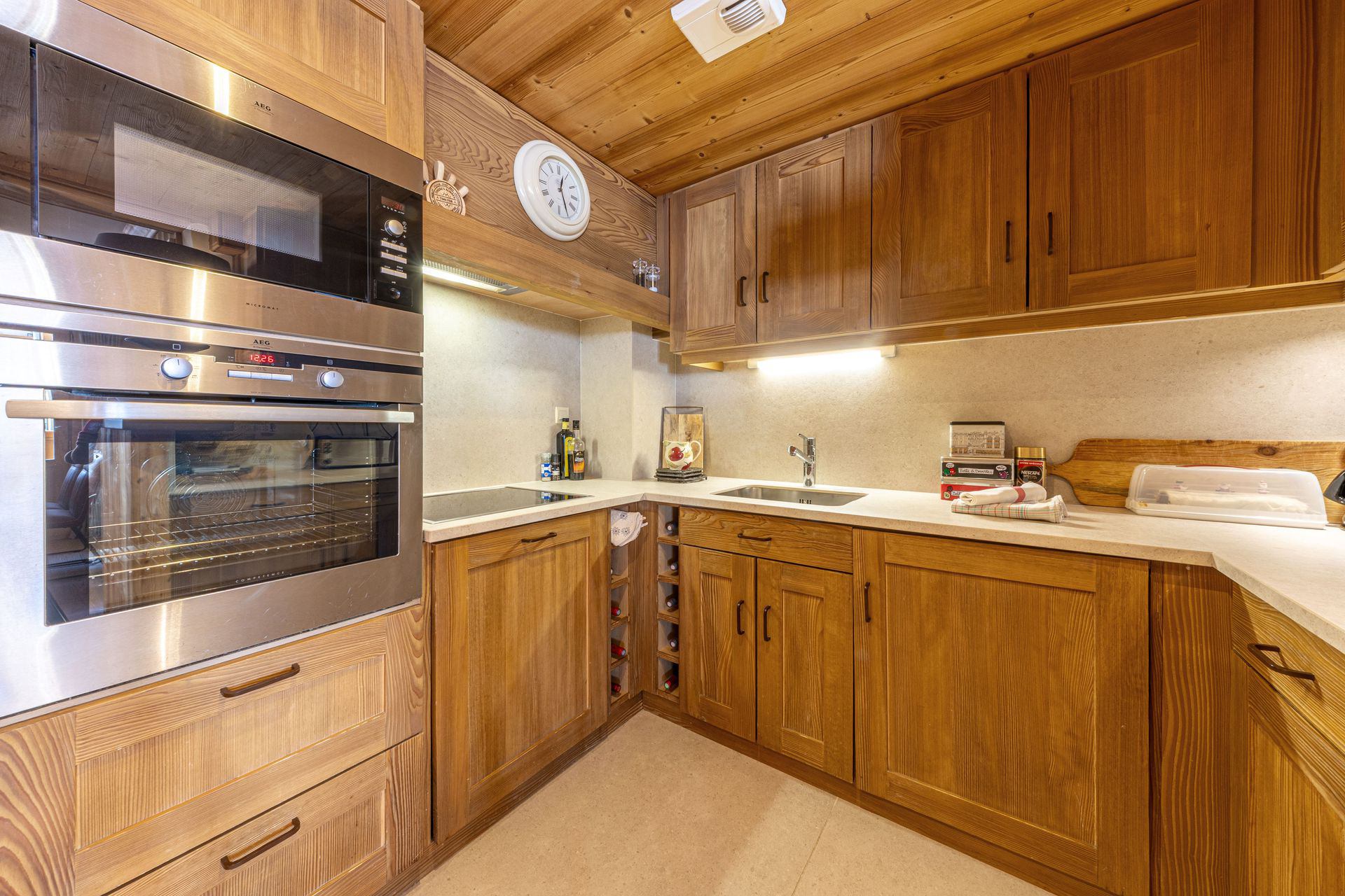 Cuisine américaine équipée avec four, lave-vaisselle, four micro-ondes, lave-linge avec sèche-linge, grand réfrigérateur avec congélateur, plaque vitrocéramique et hotte aspirante.