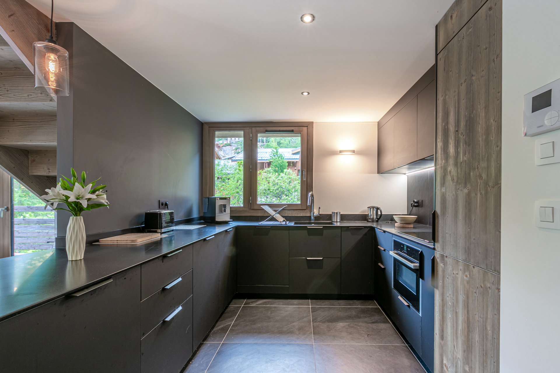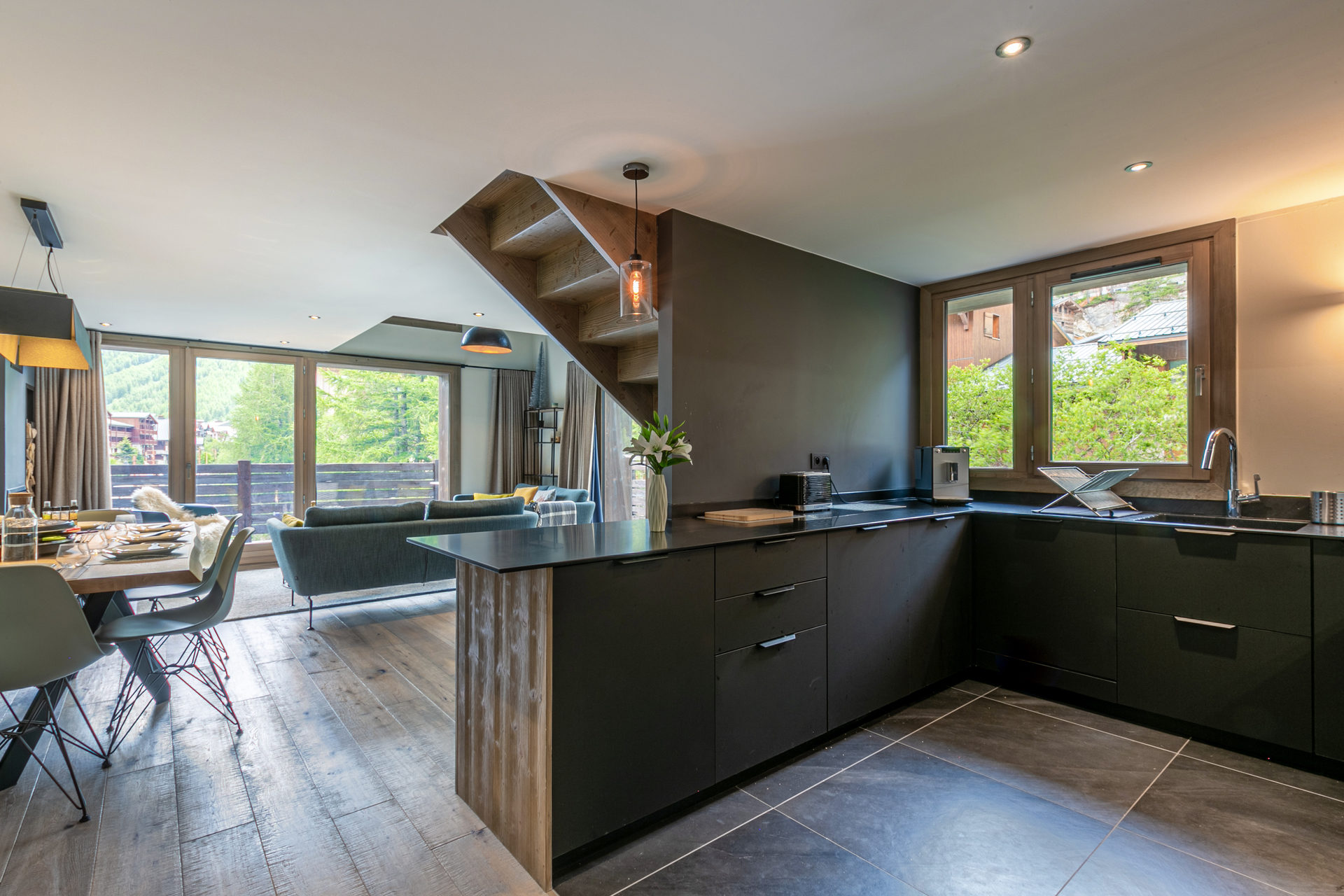 Cuisine américaine équipée d'un lave-vaisselle, combi four/micro-ondes, grand réfrigérateur avec congélateur, hotte aspirante, plaque induction et lave-linge avec sèche-linge