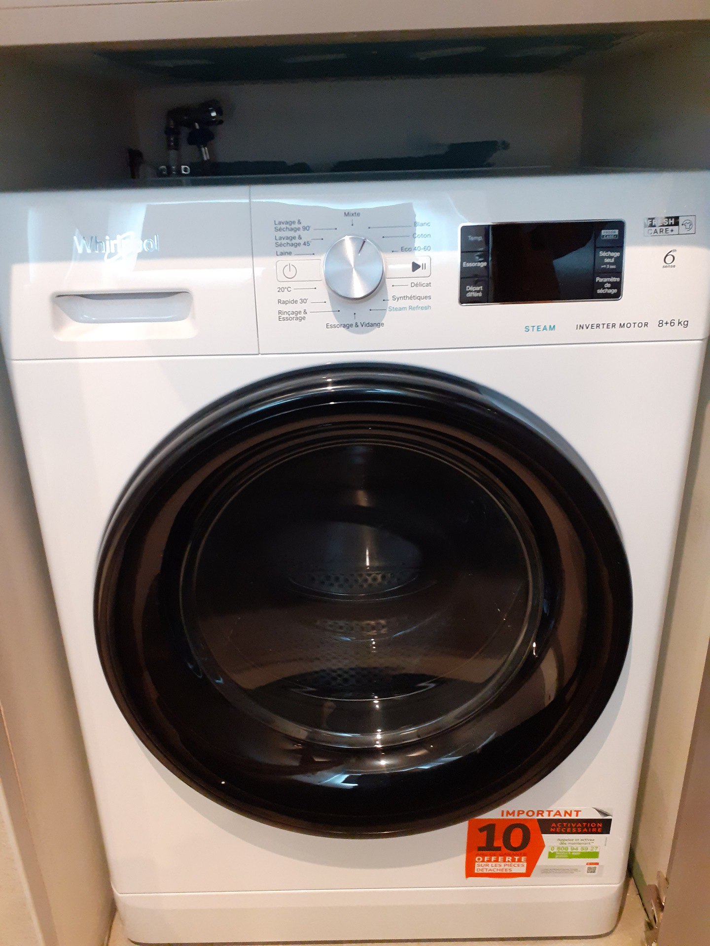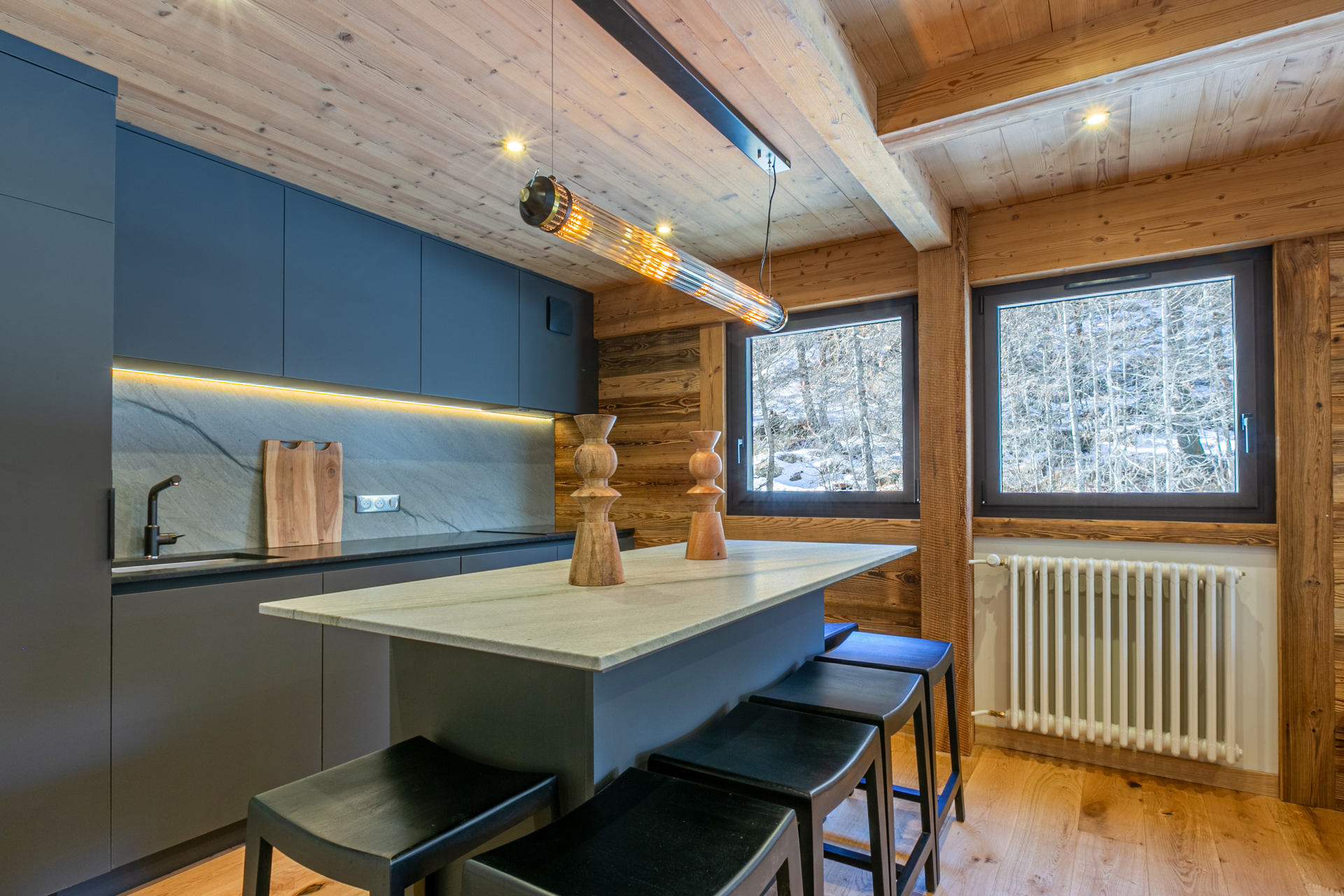Equipée d'un four combi micro-onde, plaque induction, hotte aspirante, réfrigerateur avec congélateur, lave-vaisselle.