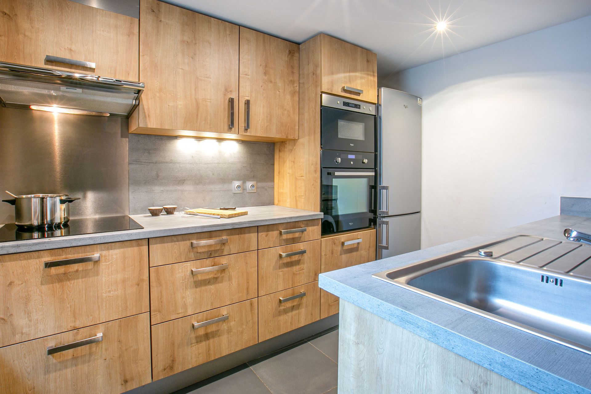 Equipée d'un four, lave-vaisselle, hotte aspirante, plaque induction, four micro-ondes, lave-linge, grand réfrigérateur, congélateur