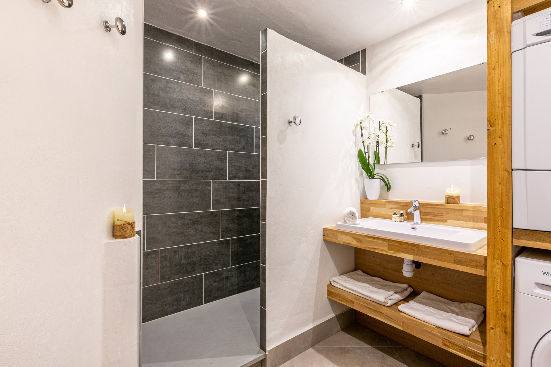 Salle de douche italiennne avec lave-linge et sèche-linge, sèche-serviette