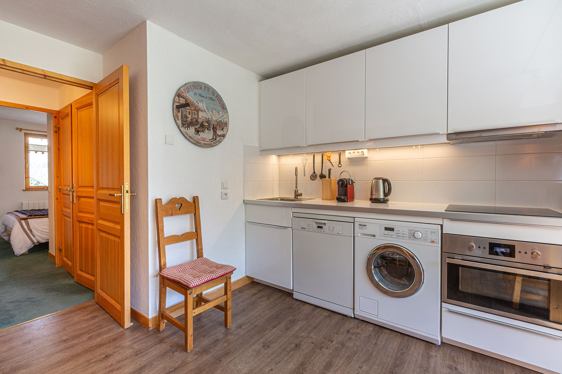 Equipée d'un combiné four micro-ondes multi-fonctions, plaque vitrocéramique, lave-vaisselle, grand réfrigérateur, hotte aspirante et lave-linge avec sèche-linge.