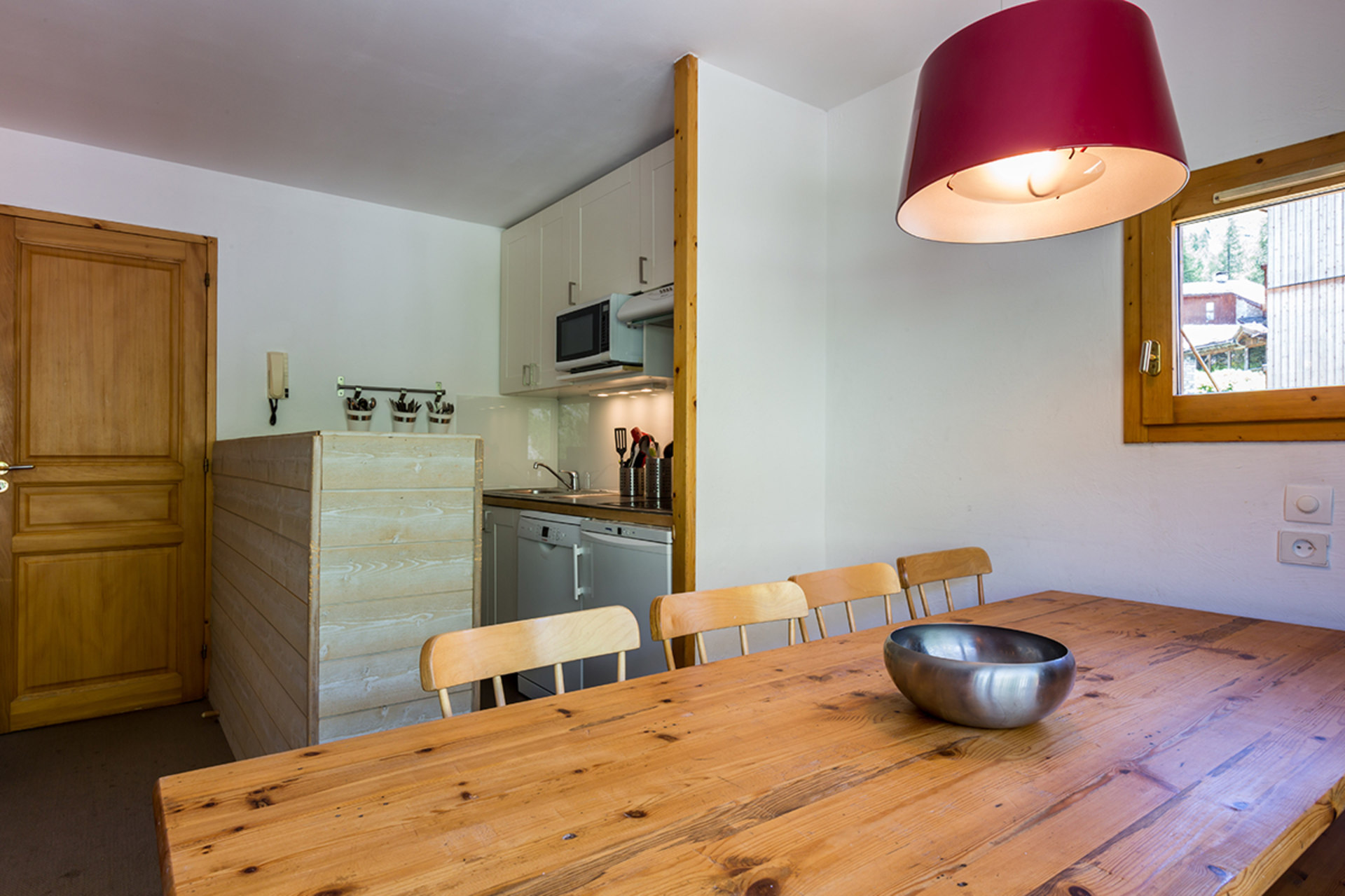 Cuisine américaine équipée d'un lave-vaisselle, réfrigérateur, hotte aspirante, plaque vitrocéramique et four micro-ondes