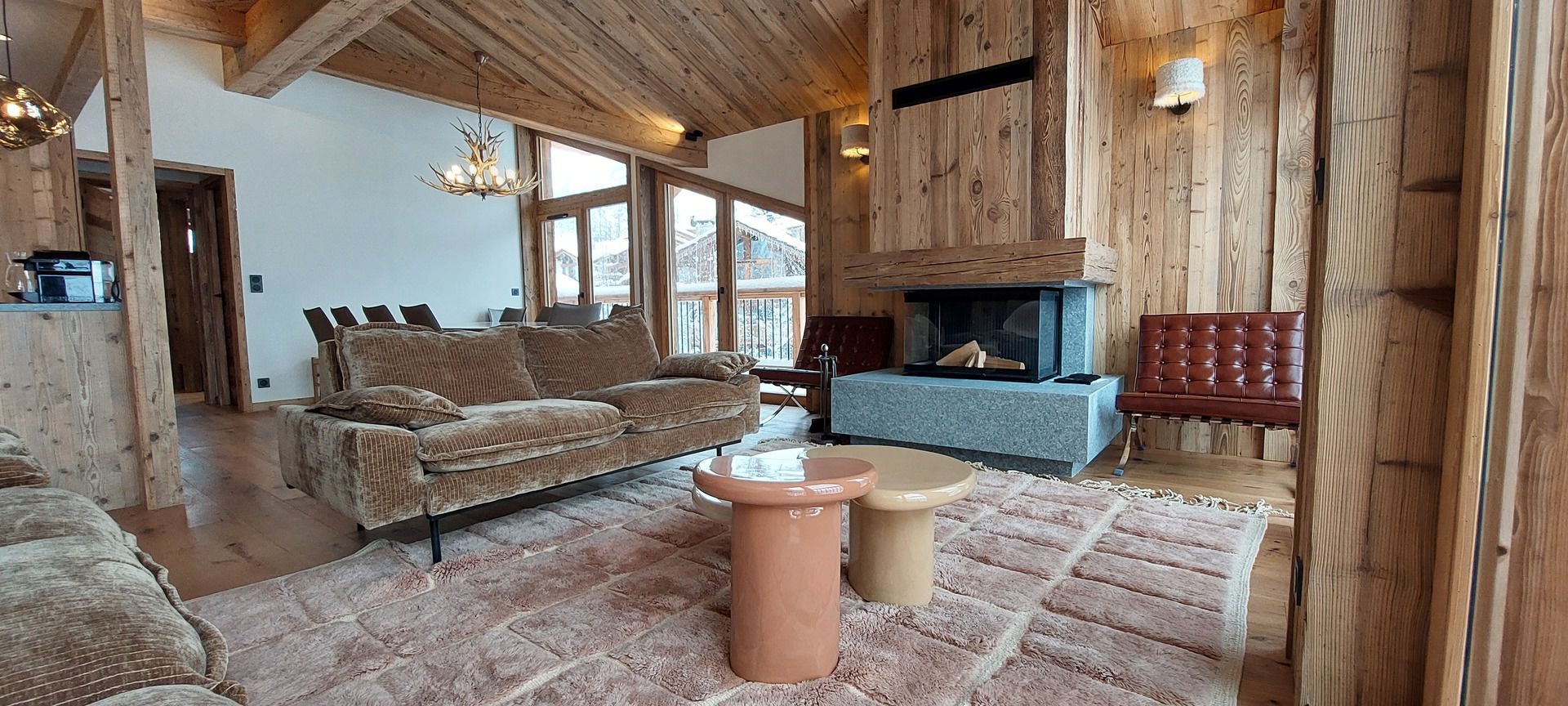Salon lumineux avec grandes baies vitrées et cheminée, avec charpente apparente