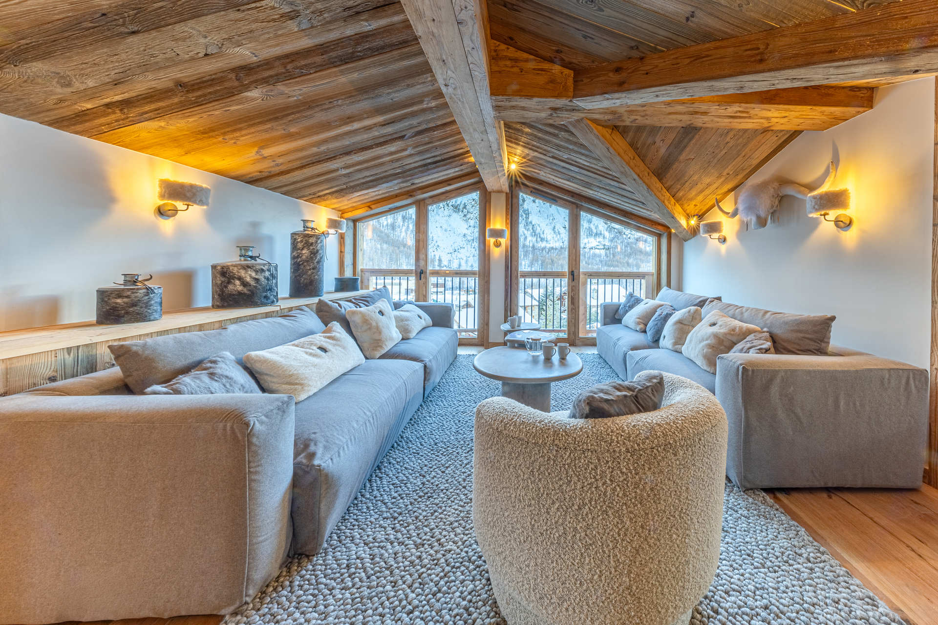 Salon lumineux avec grandes baies vitrées et charpente apparente