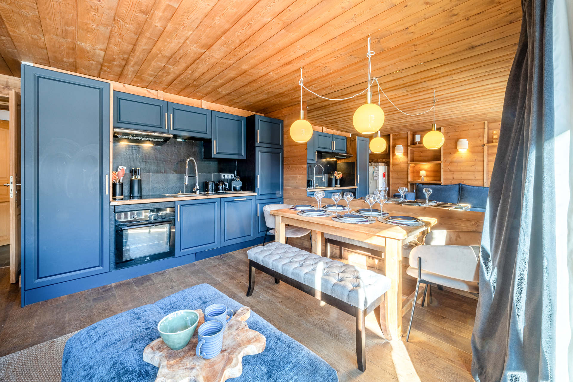 Equipée d'un lave-vaisselle, four, plaque vitrocéramique, réfrigérateur, hotte aspirante et four micro-ondes avec grill.