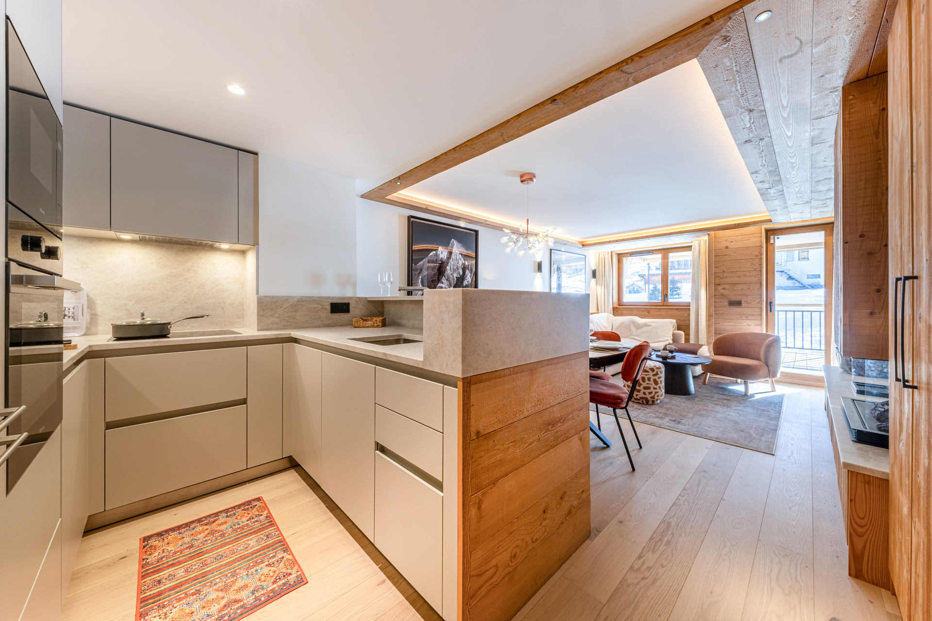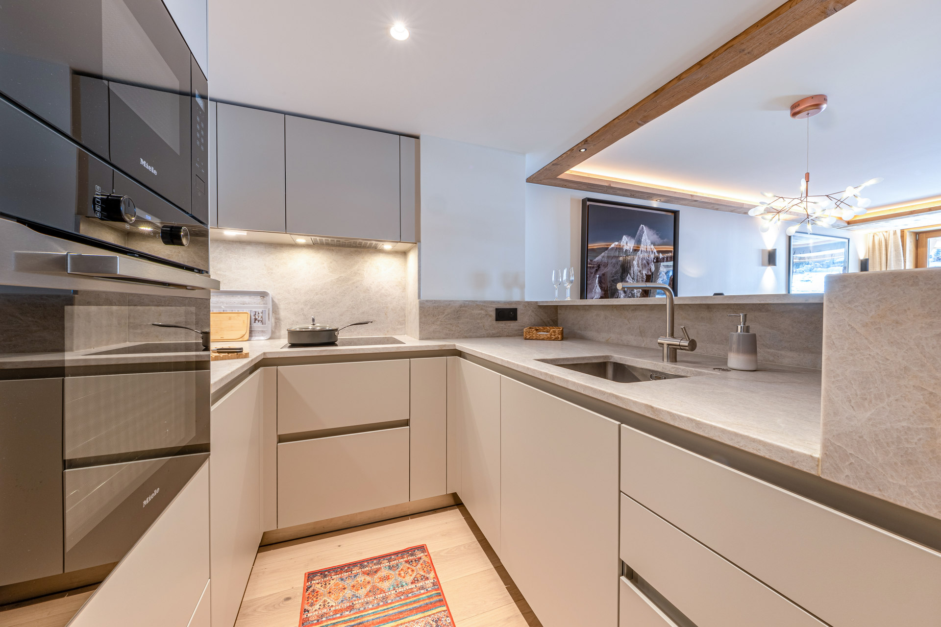 Equipée d'un lave-vaisselle, four, plaque à induction, hotte aspirante, four micro-ondes, réfrigérateur avec congélateur