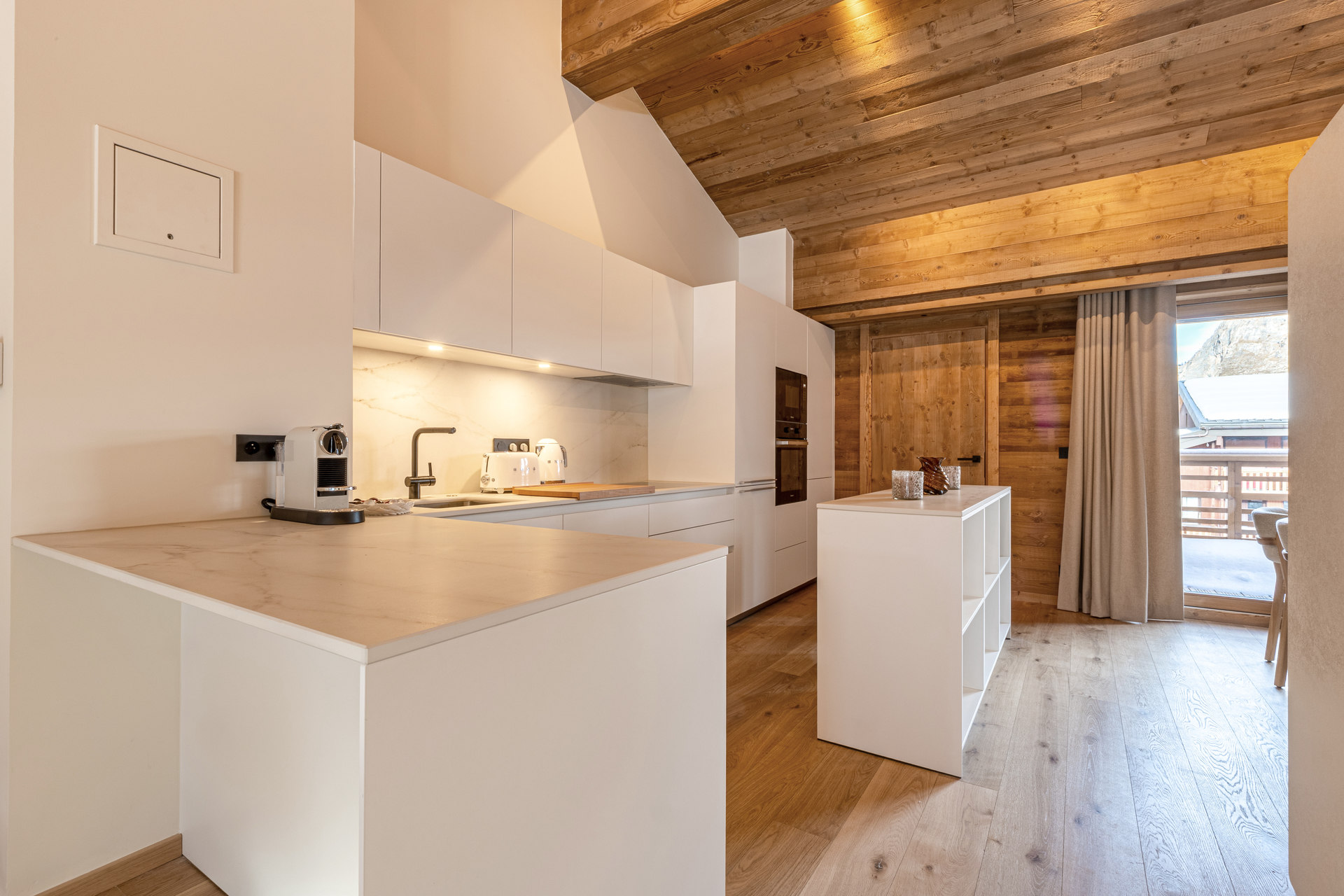 Equipée d'un lave-vaisselle, four, plaque à induction, hotte aspirante, four micro-ondes, réfrigérateur avec congélateur