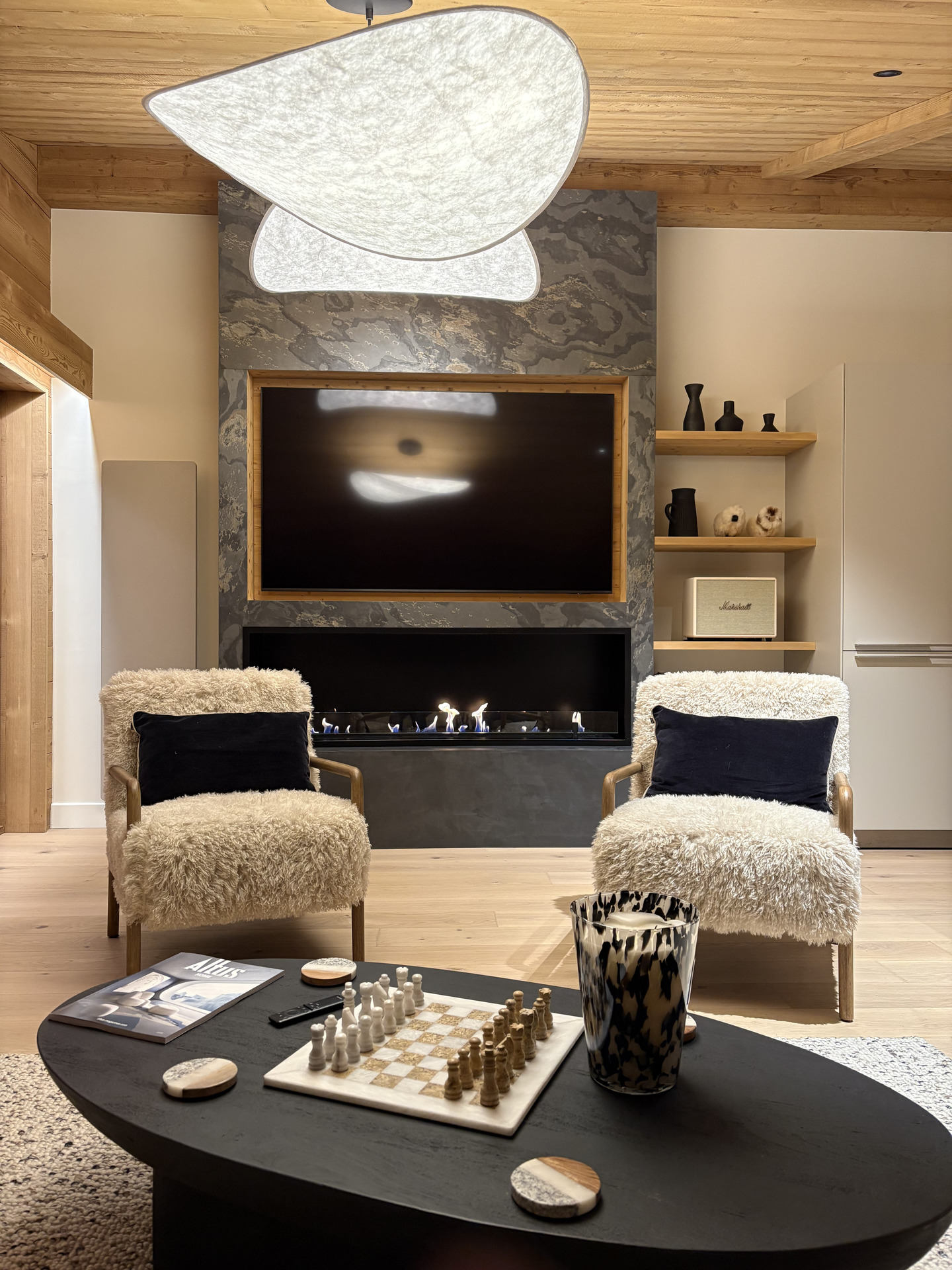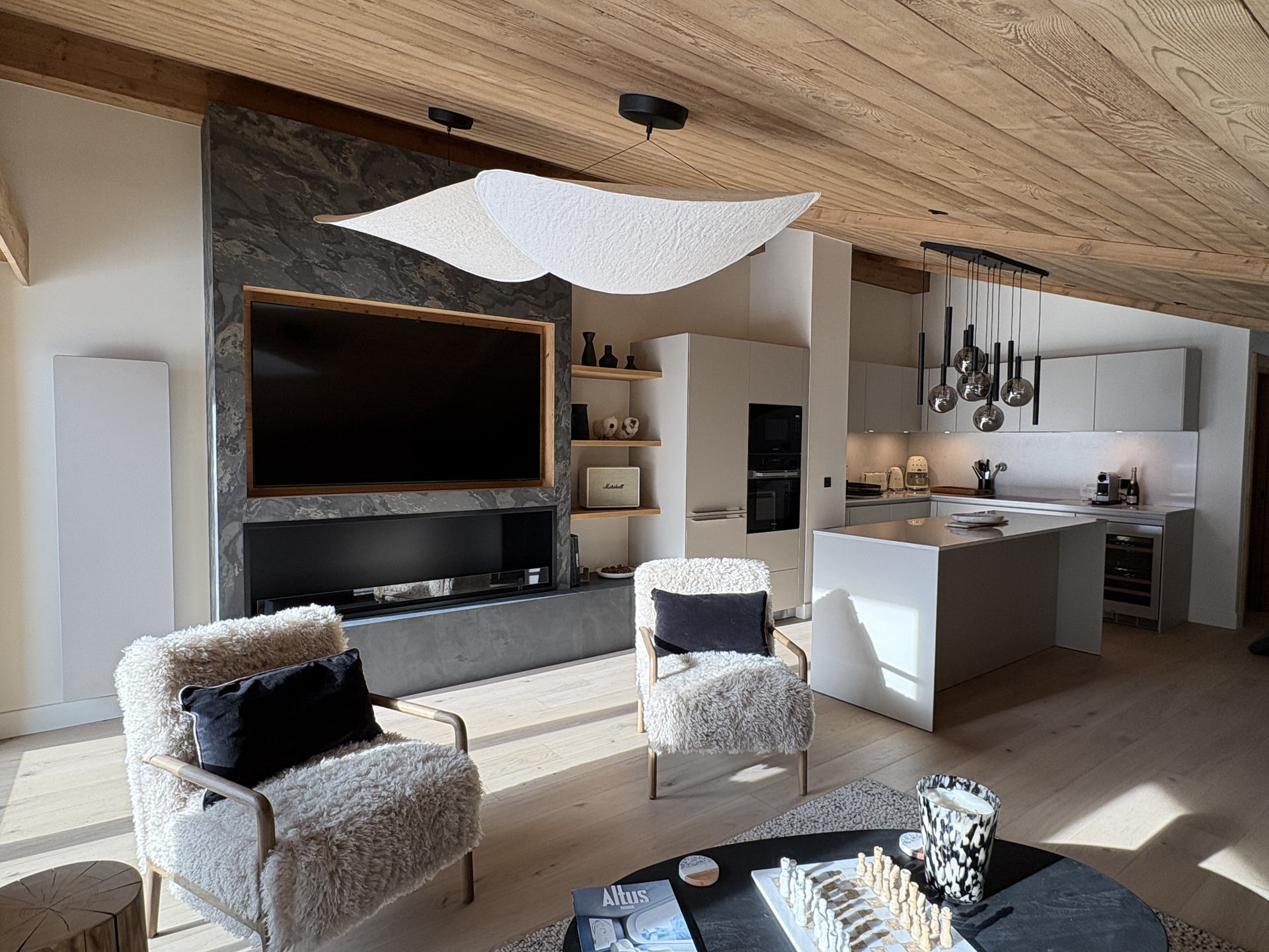 Grand salon avec balcon vue montagne avec cheminée éthanol, télévision écran plat et belle hauteur sous plafond