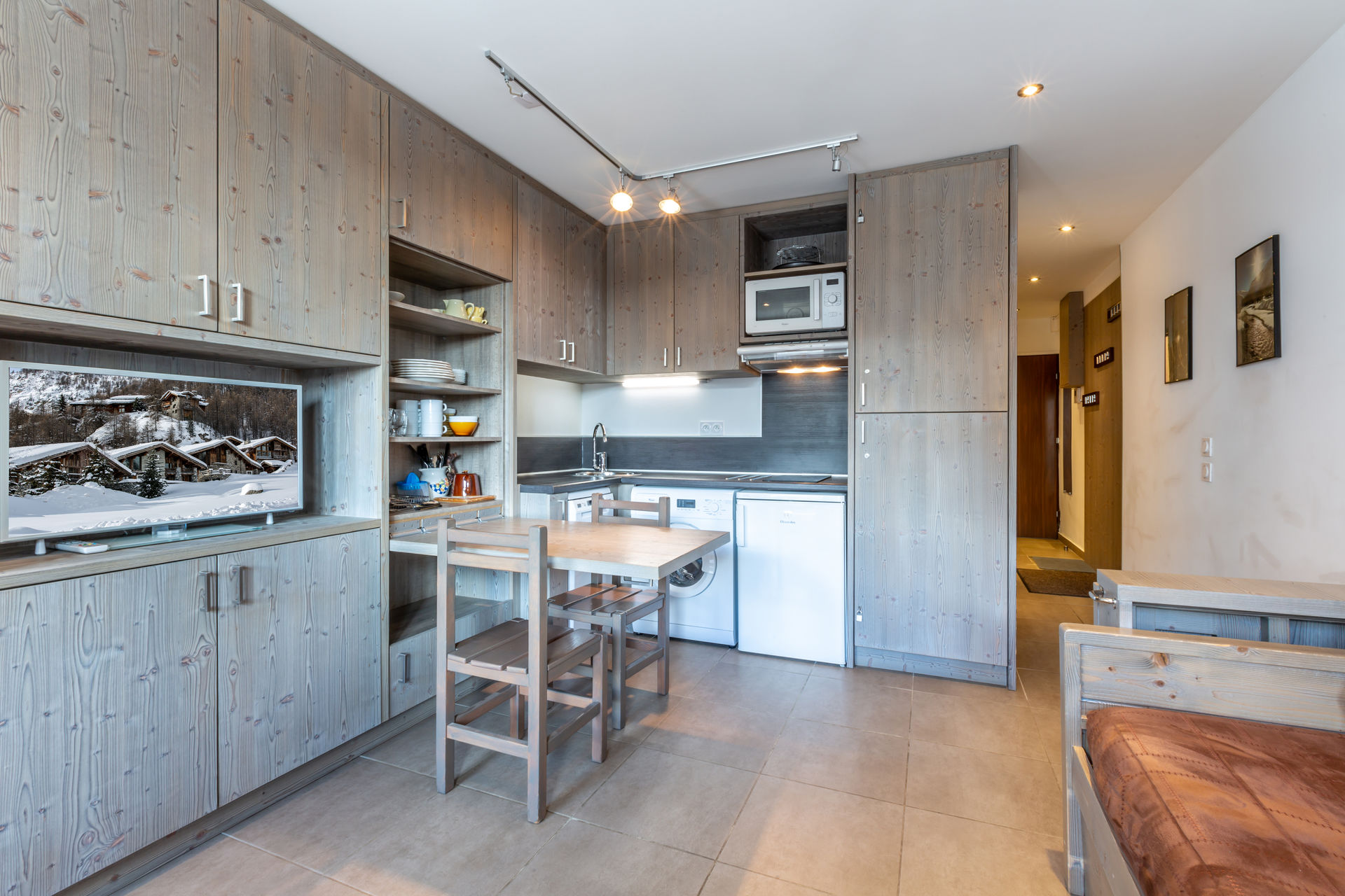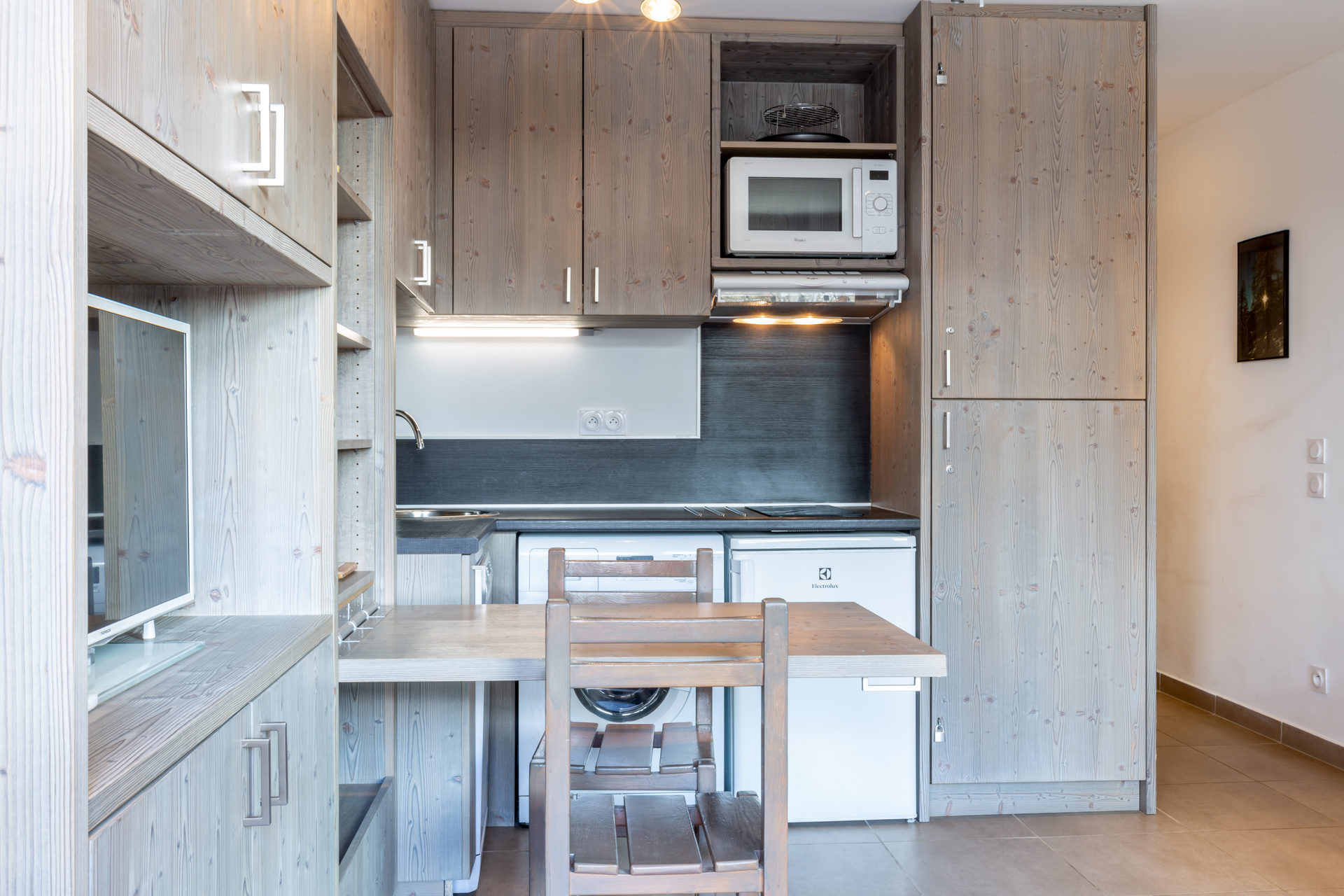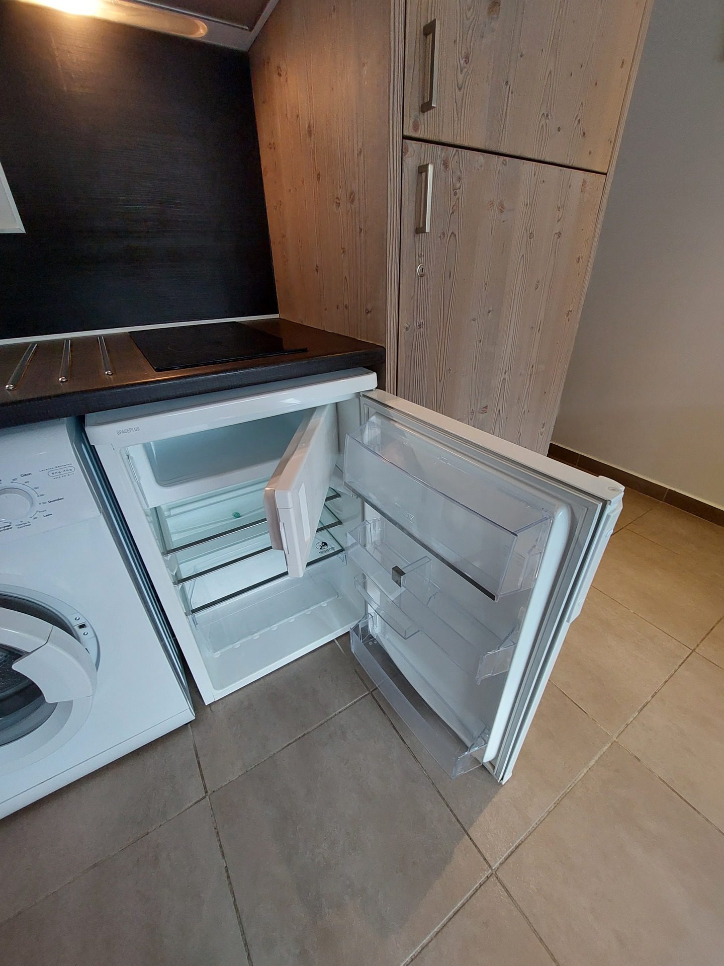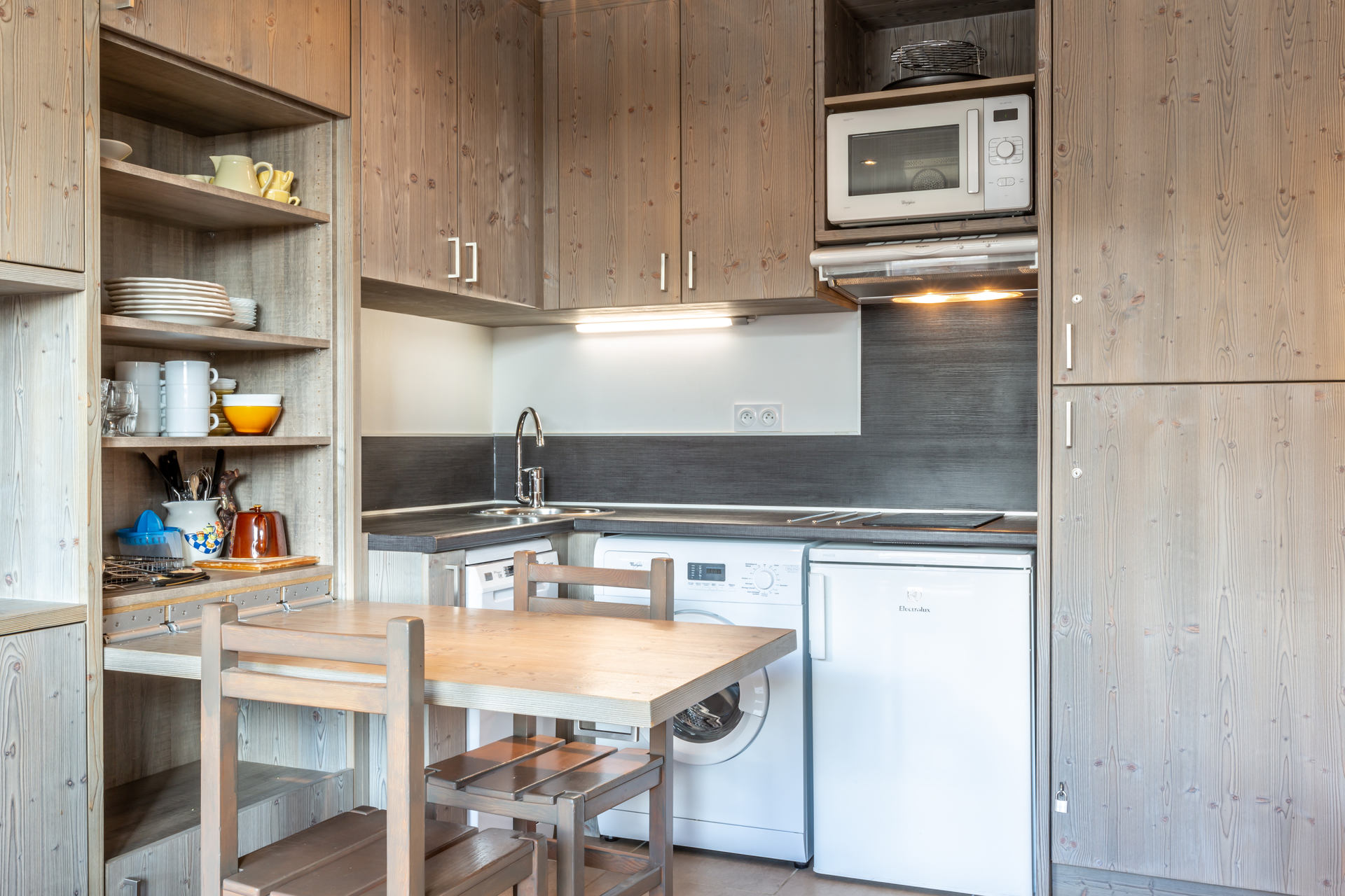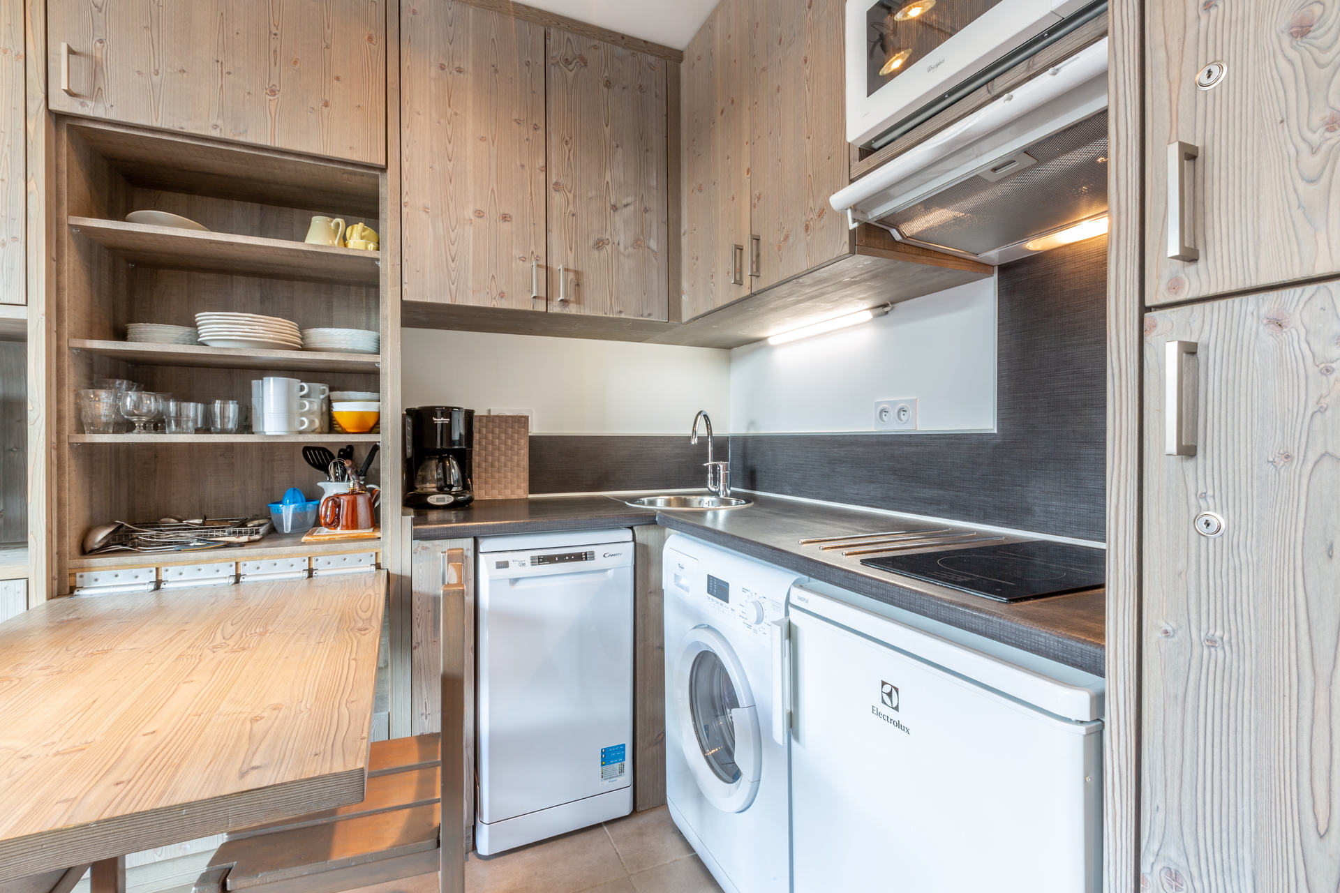 Equipée d'un lave-vaisselle, four micro-ondes avec grill, plaque induction, hotte aspirante, réfrigerateur et lave-linge