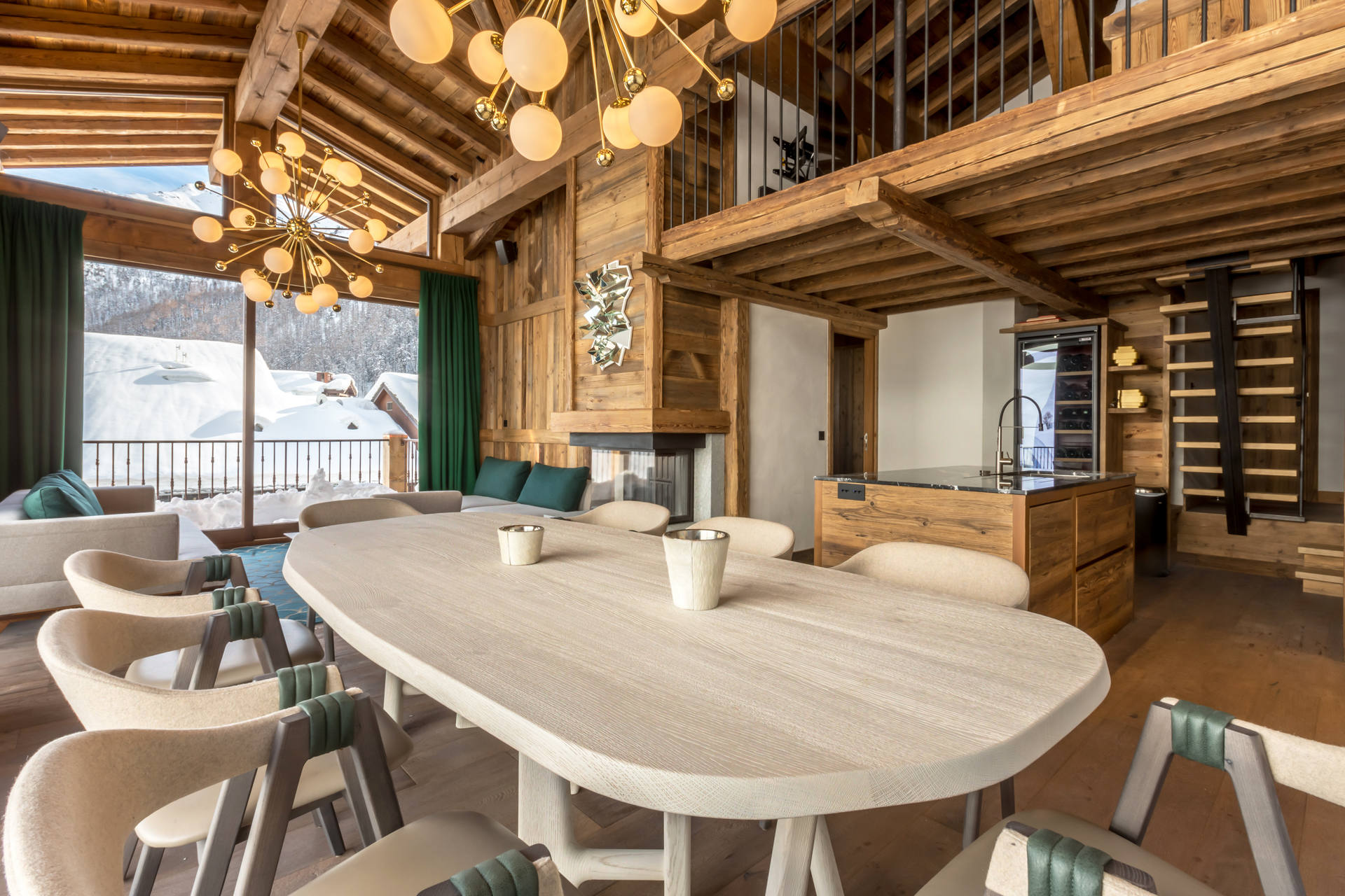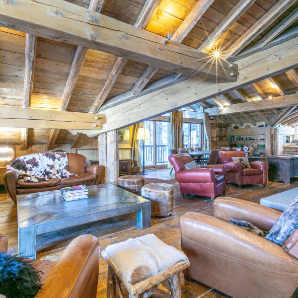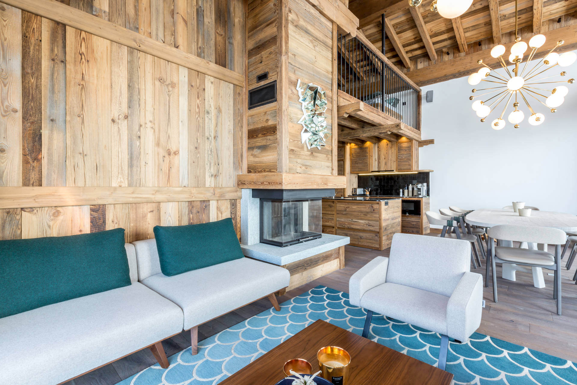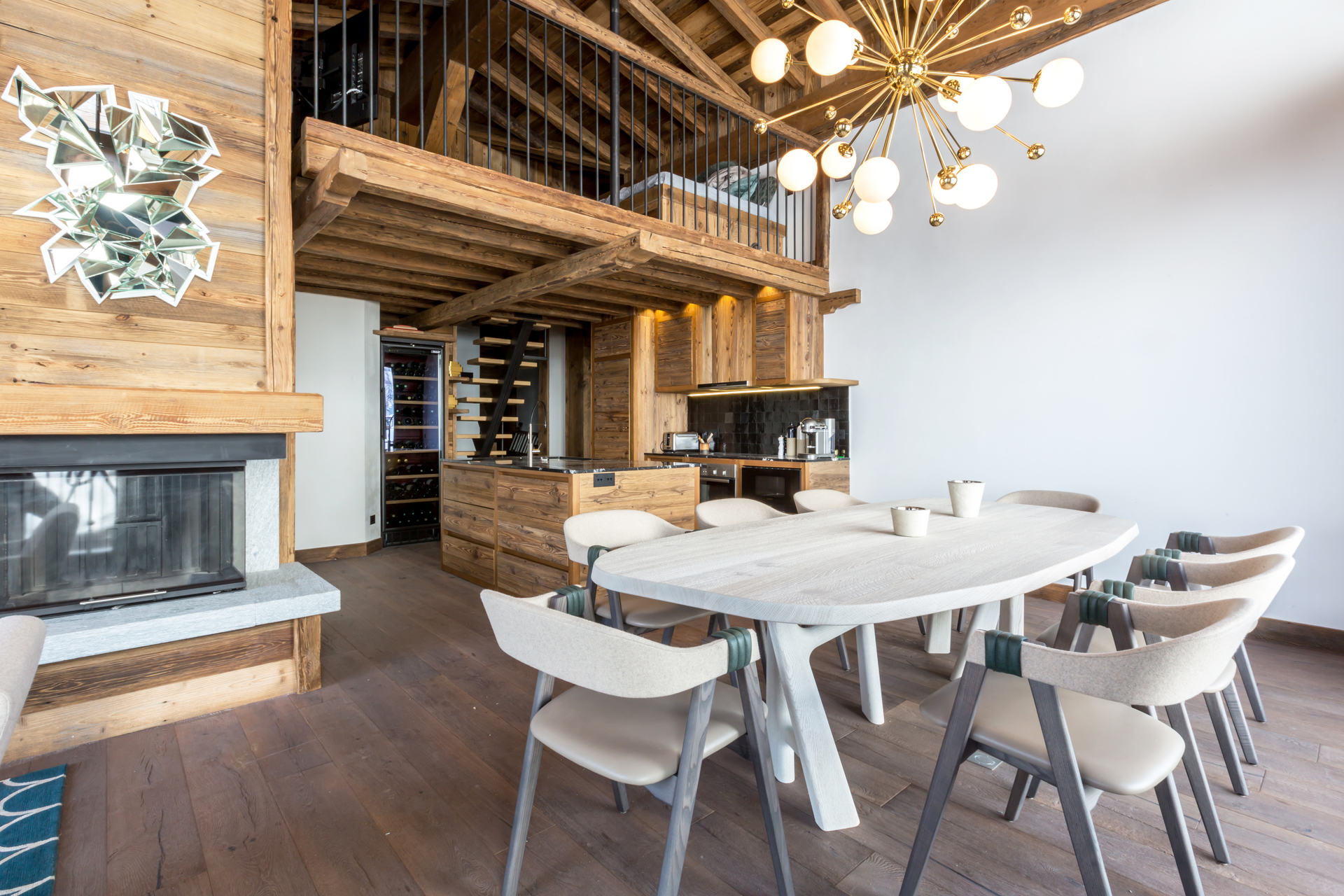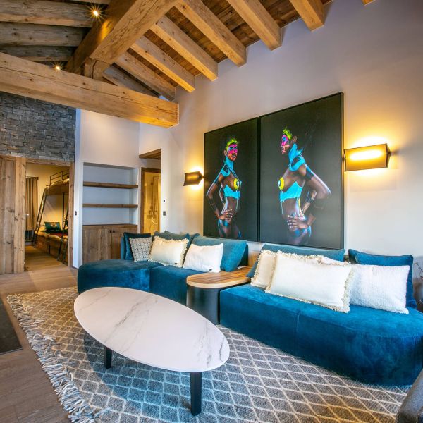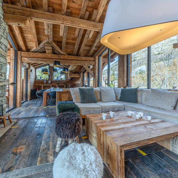 Intérieur de caractère alliant décoration contemporaine et architecture savoyarde authentique et chaleureuse faite de bois et pierre