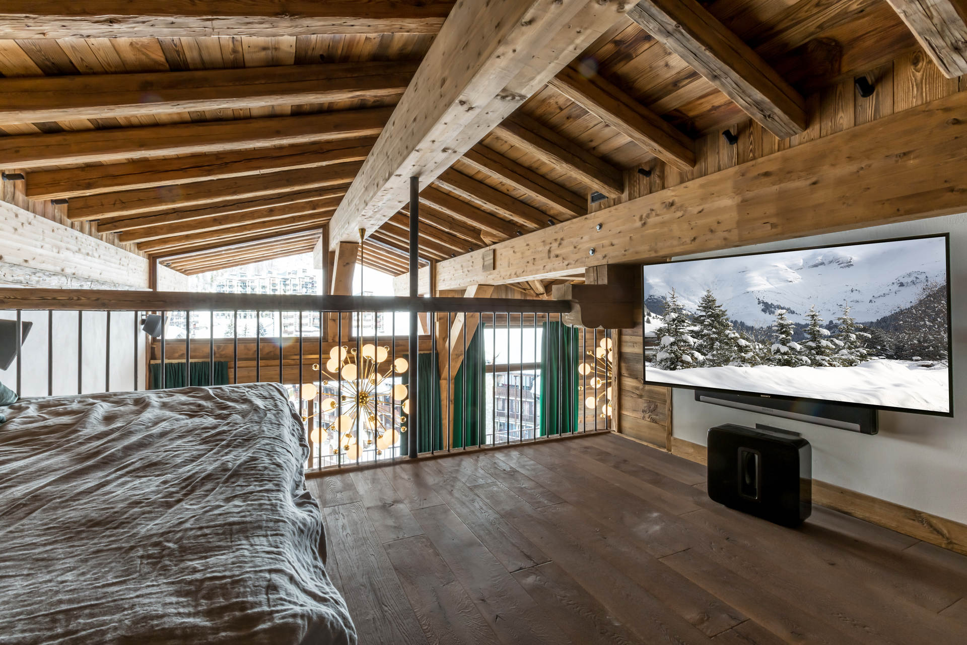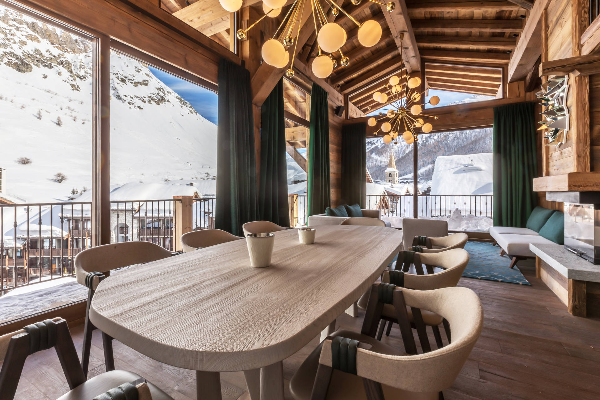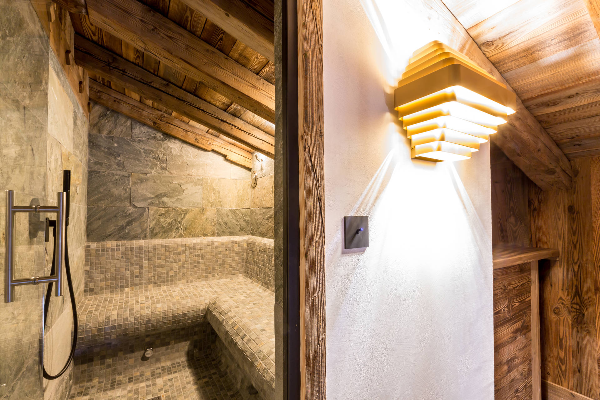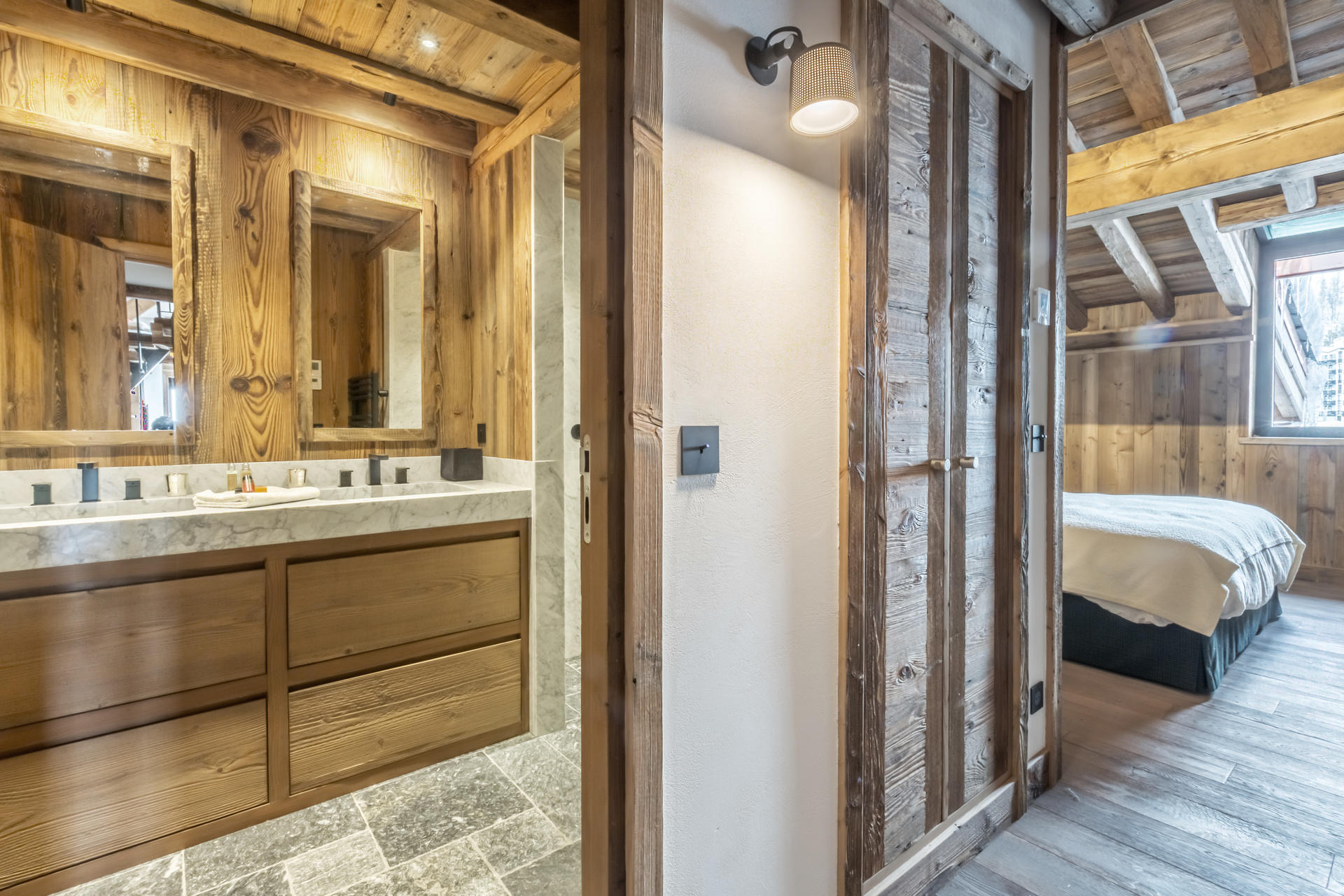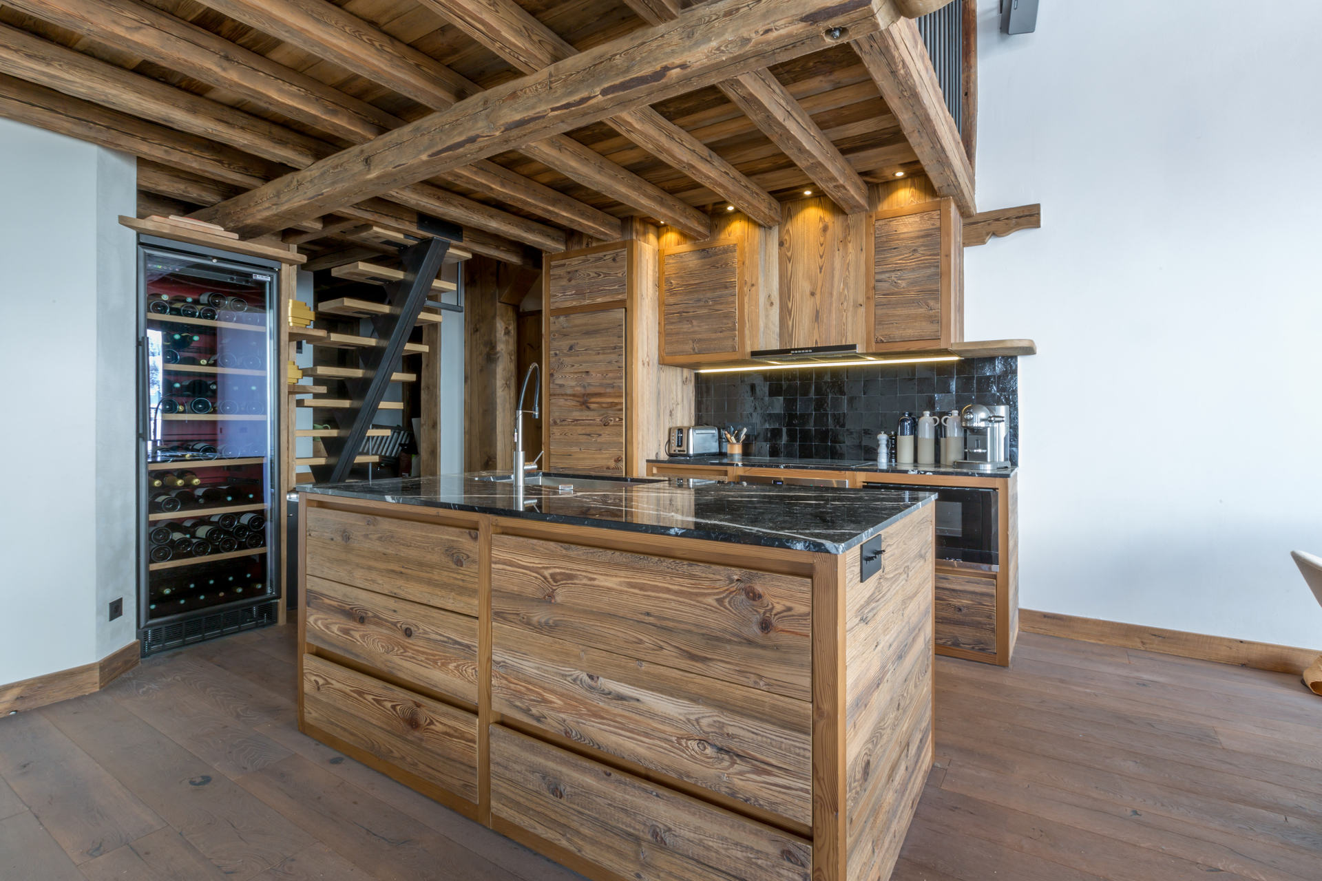 Intérieur de caractère alliant décoration contemporaine et architecture savoyarde authentique et chaleureuse faite de bois et pierre