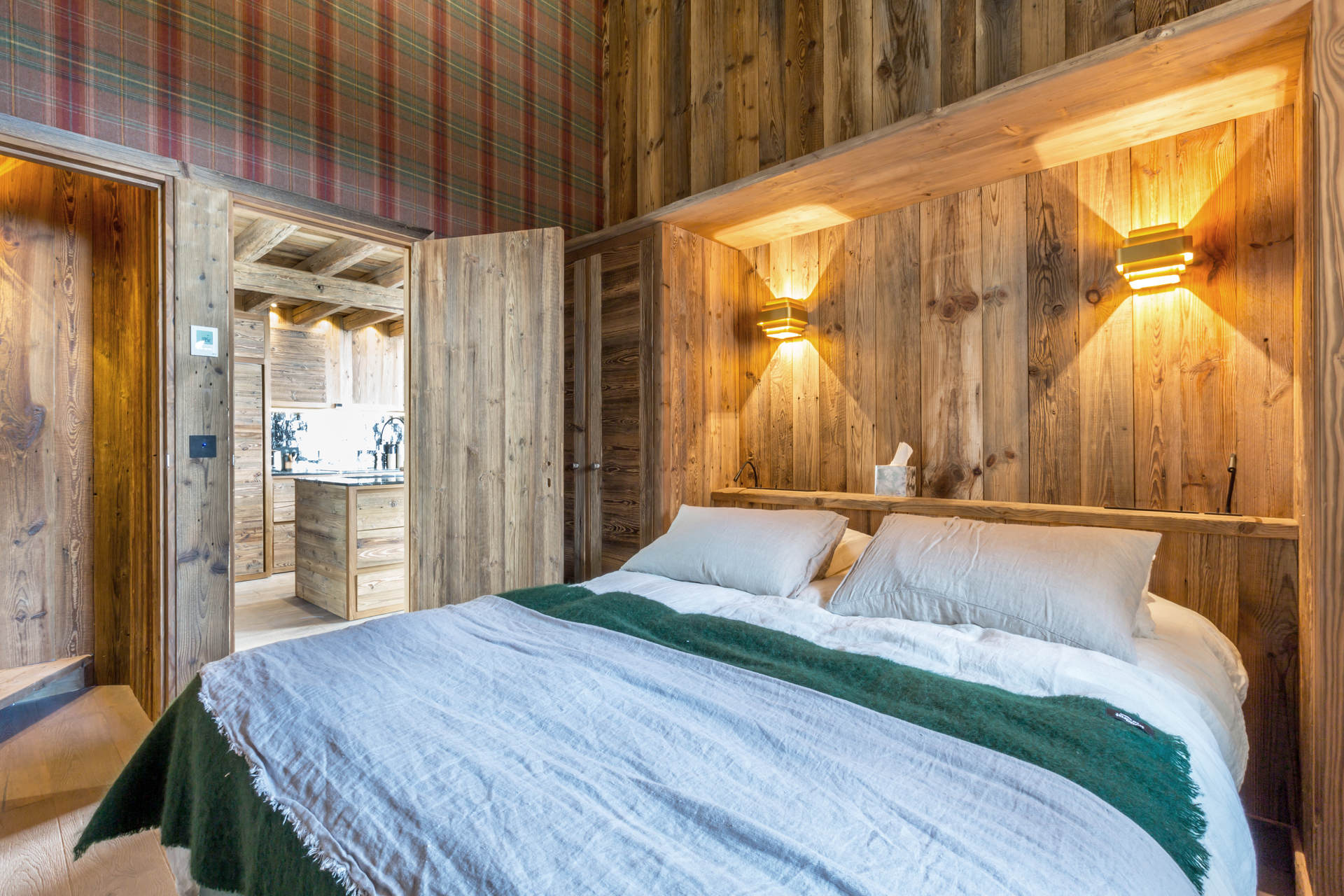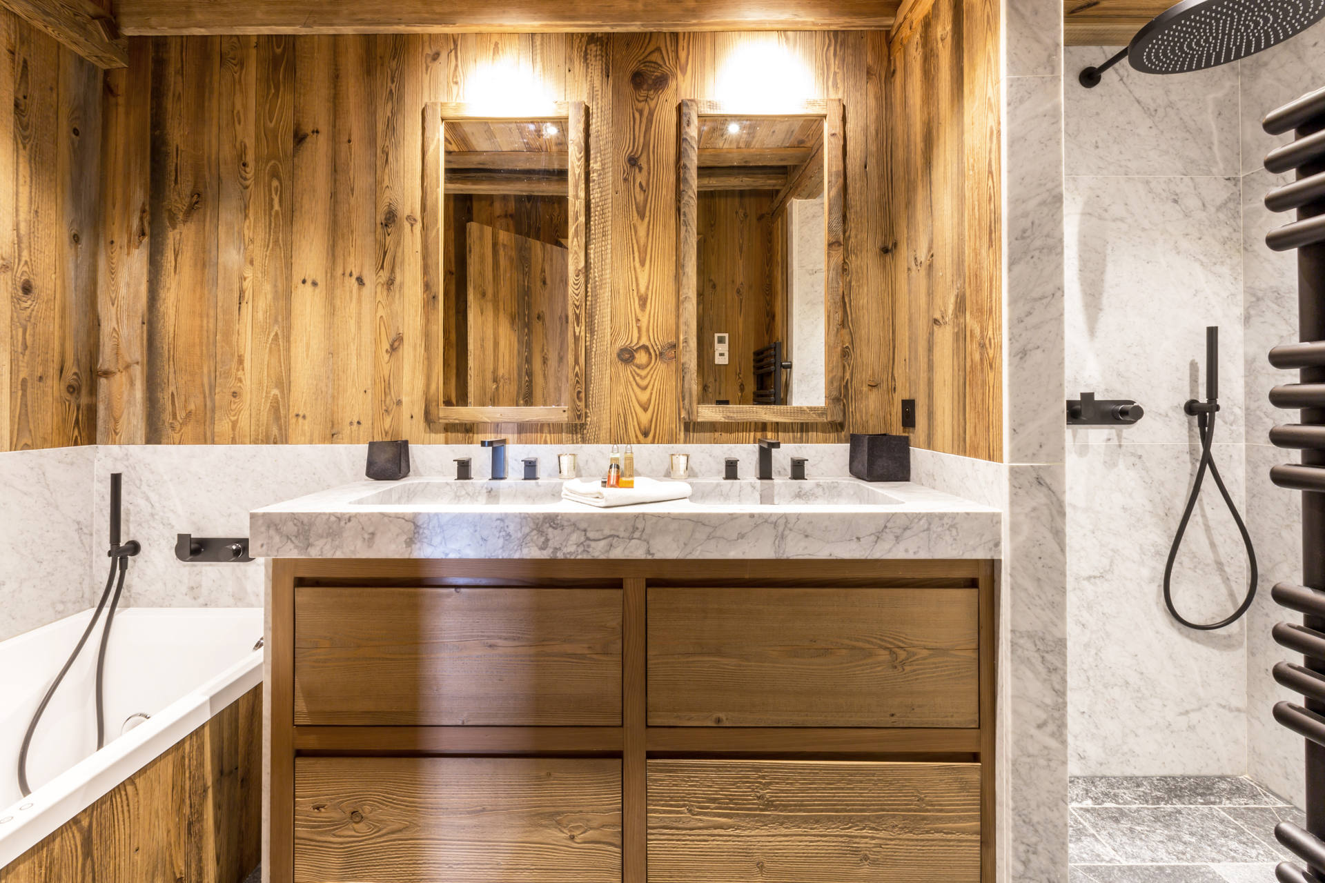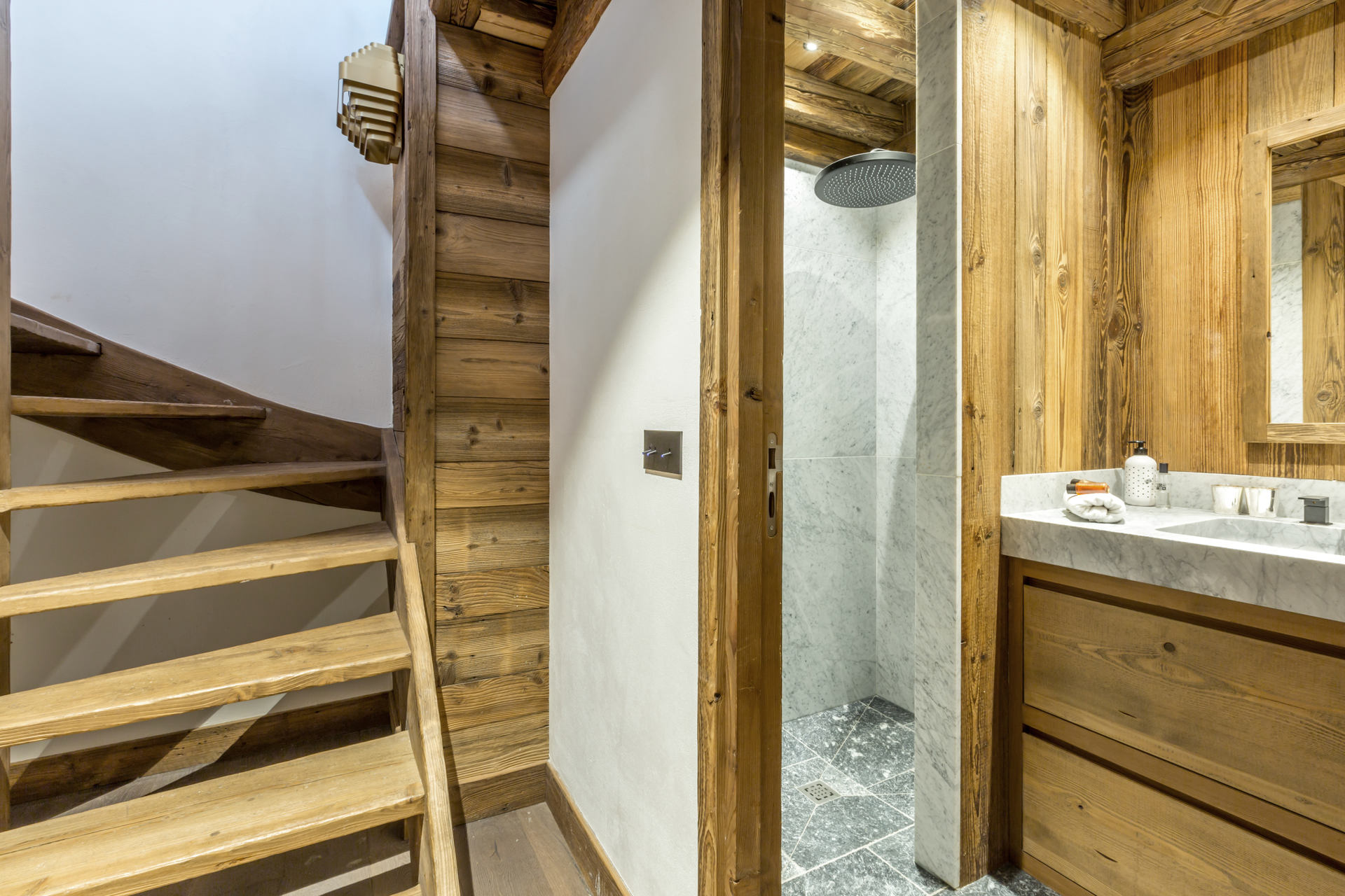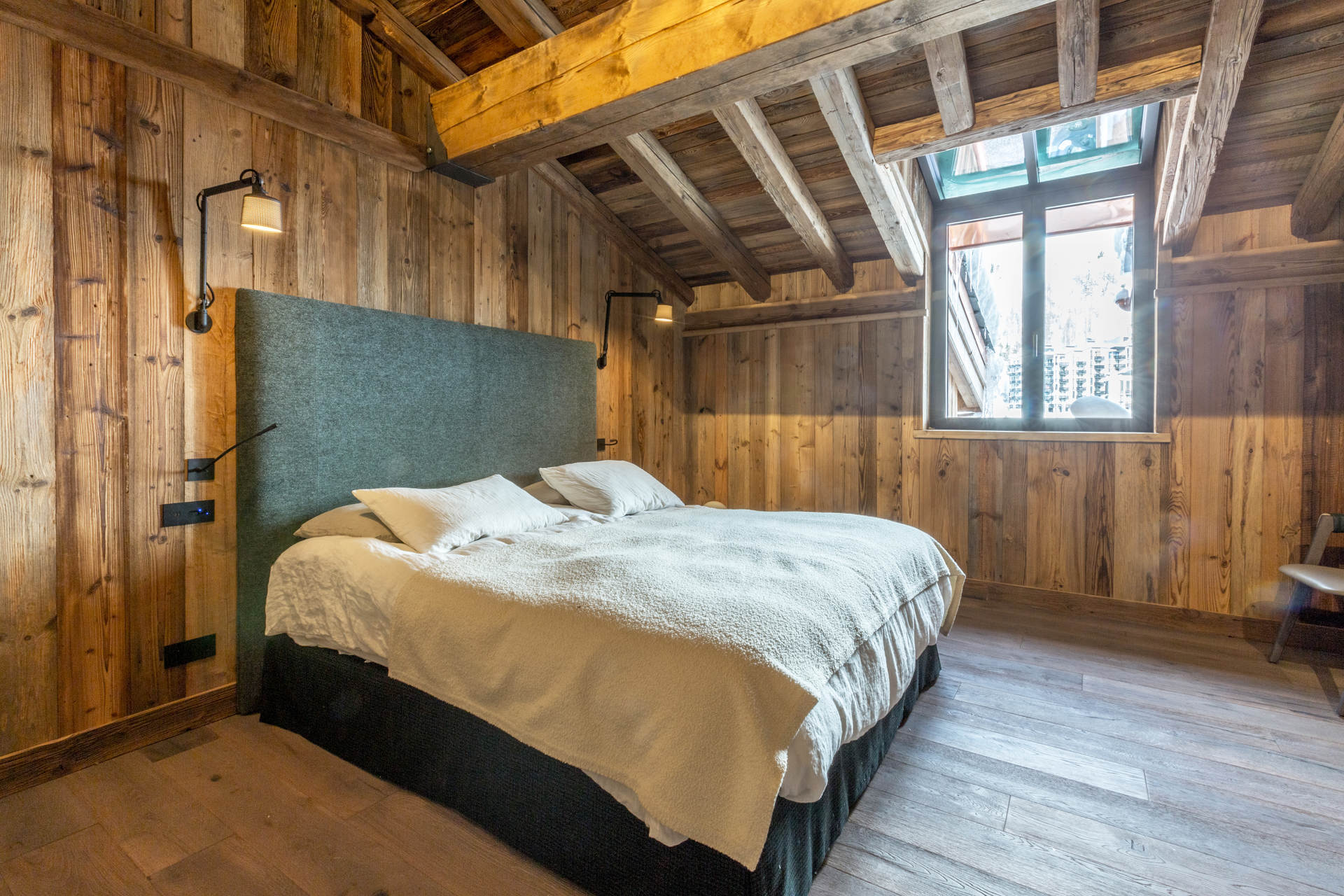 Intérieur de caractère alliant décoration contemporaine et architecture savoyarde authentique et chaleureuse faite de bois et pierre