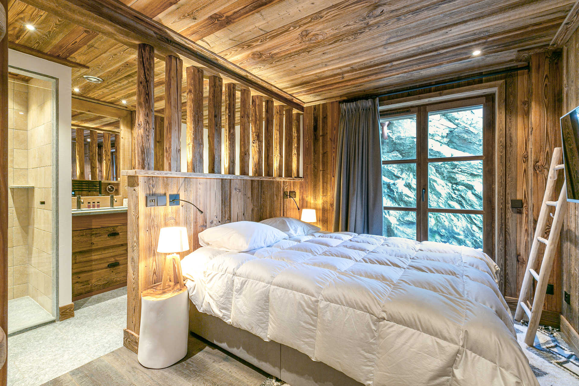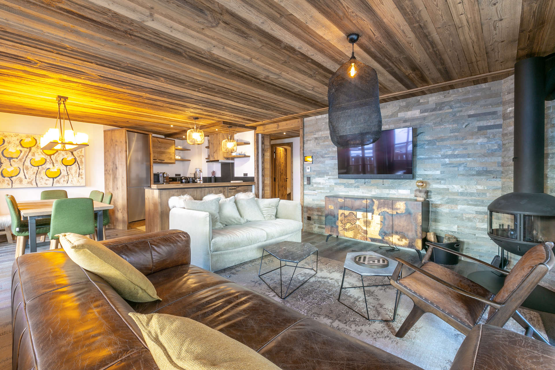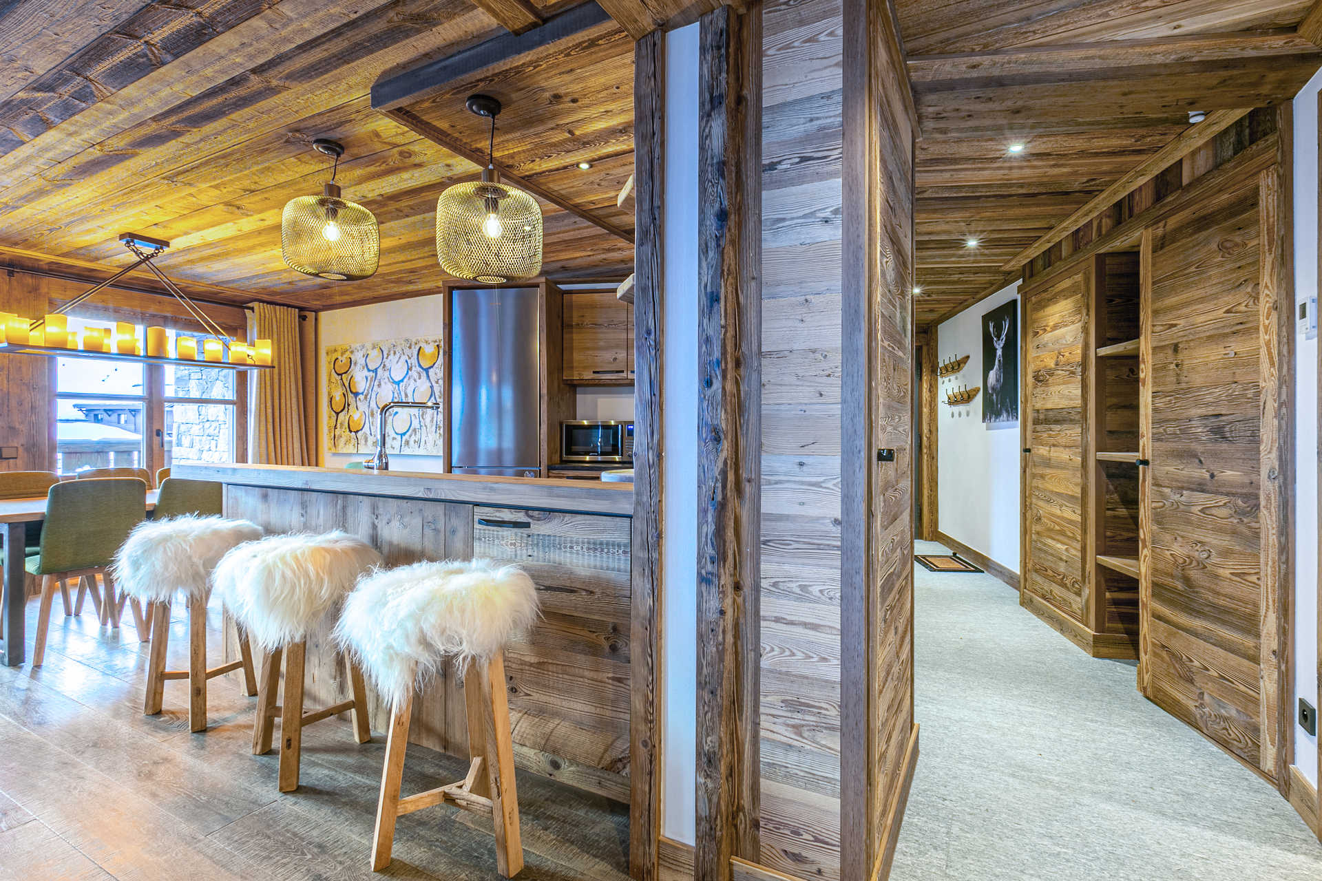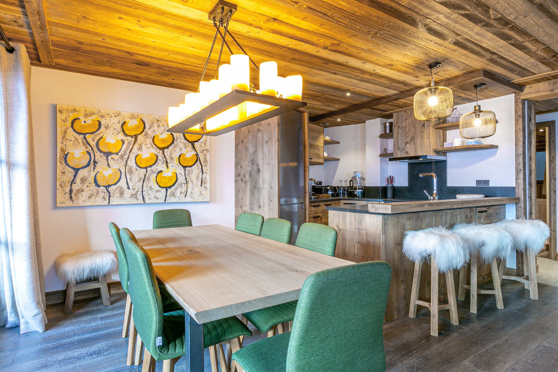 Intérieur de caractère alliant décoration contemporaine et architecture savoyarde authentique et chaleureuse faite de bois et pierre.