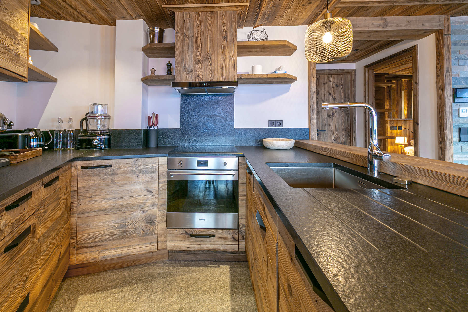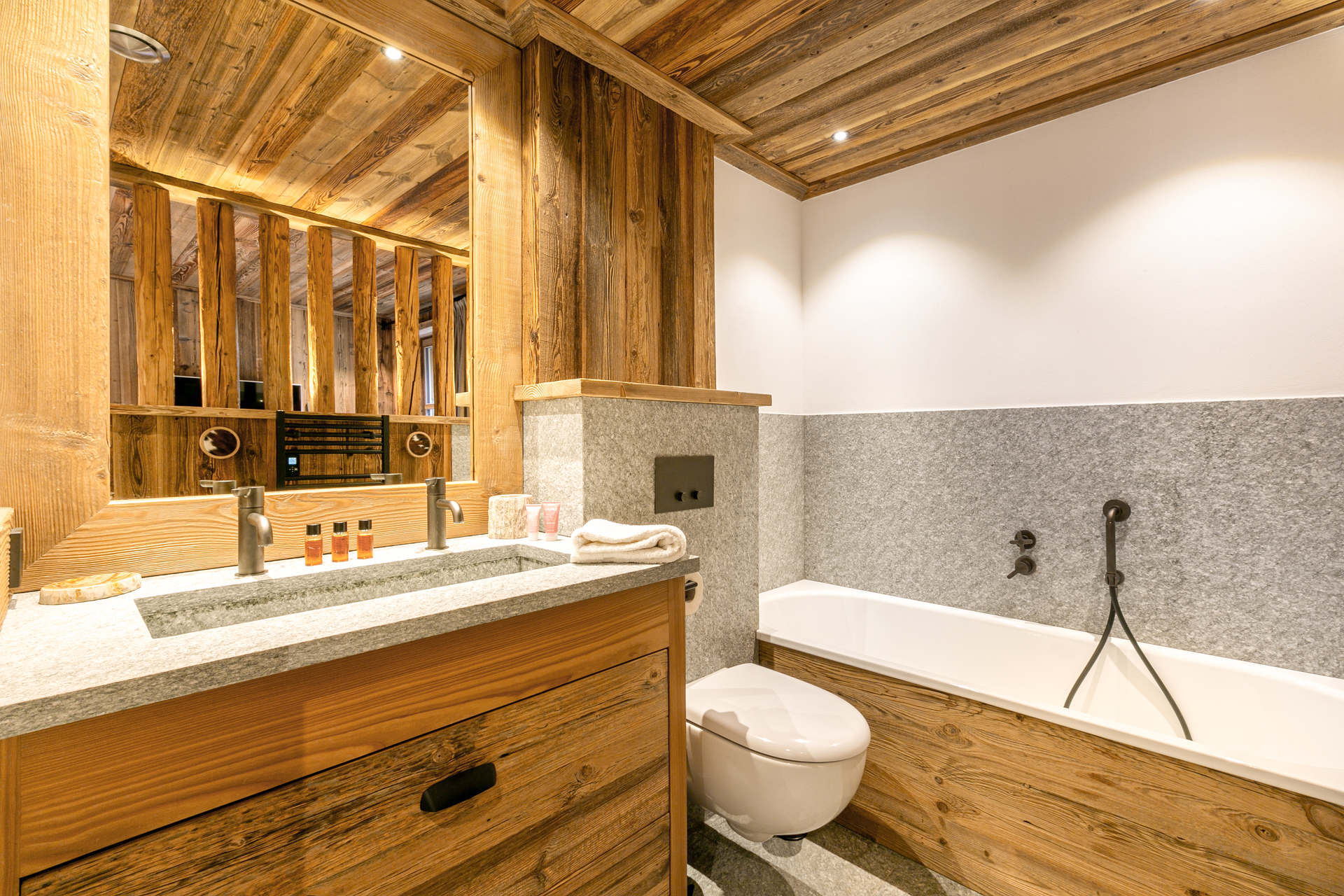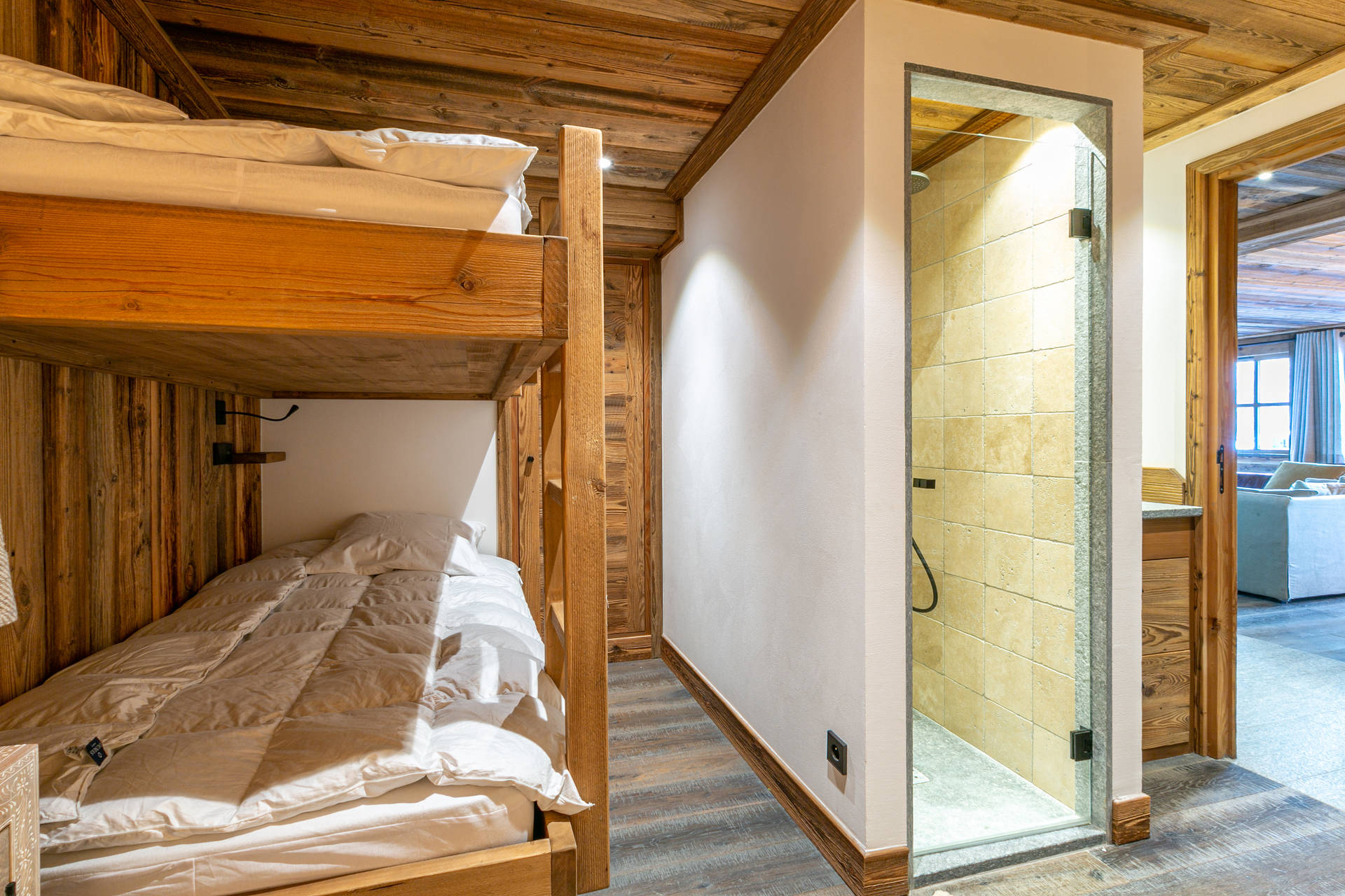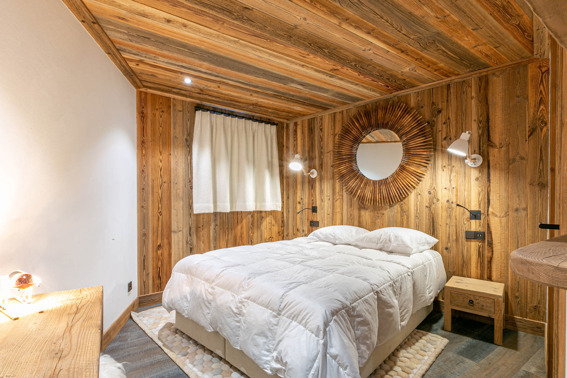 Intérieur de caractère alliant décoration contemporaine et architecture savoyarde authentique et chaleureuse faite de bois et pierre.