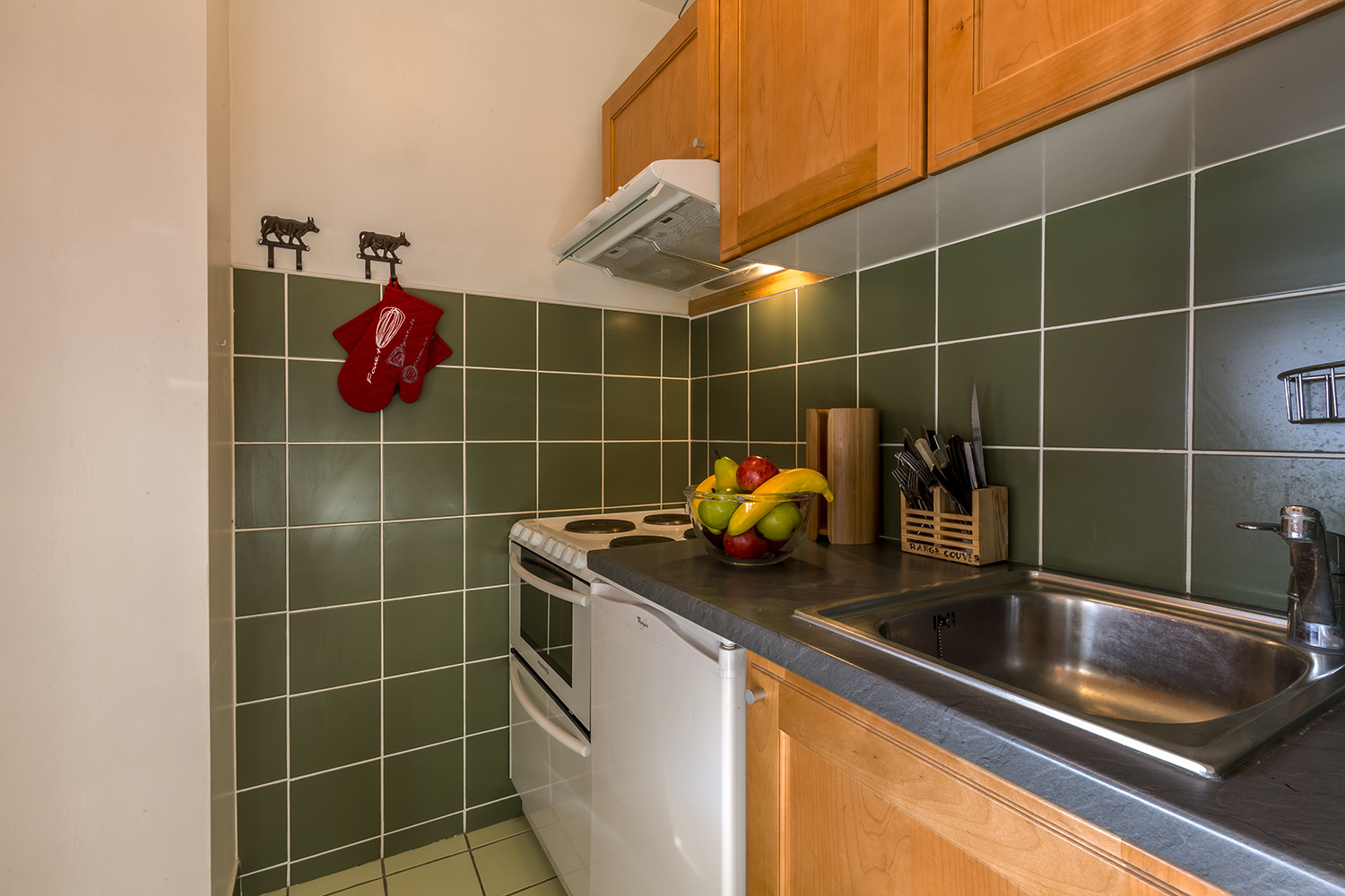 Equipée d'un four, four micro-ondes, lave-vaisselle, hotte aspirante, réfrigérateur, plaque électrique