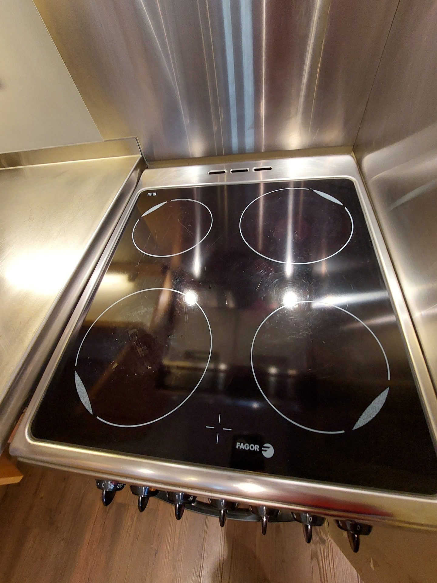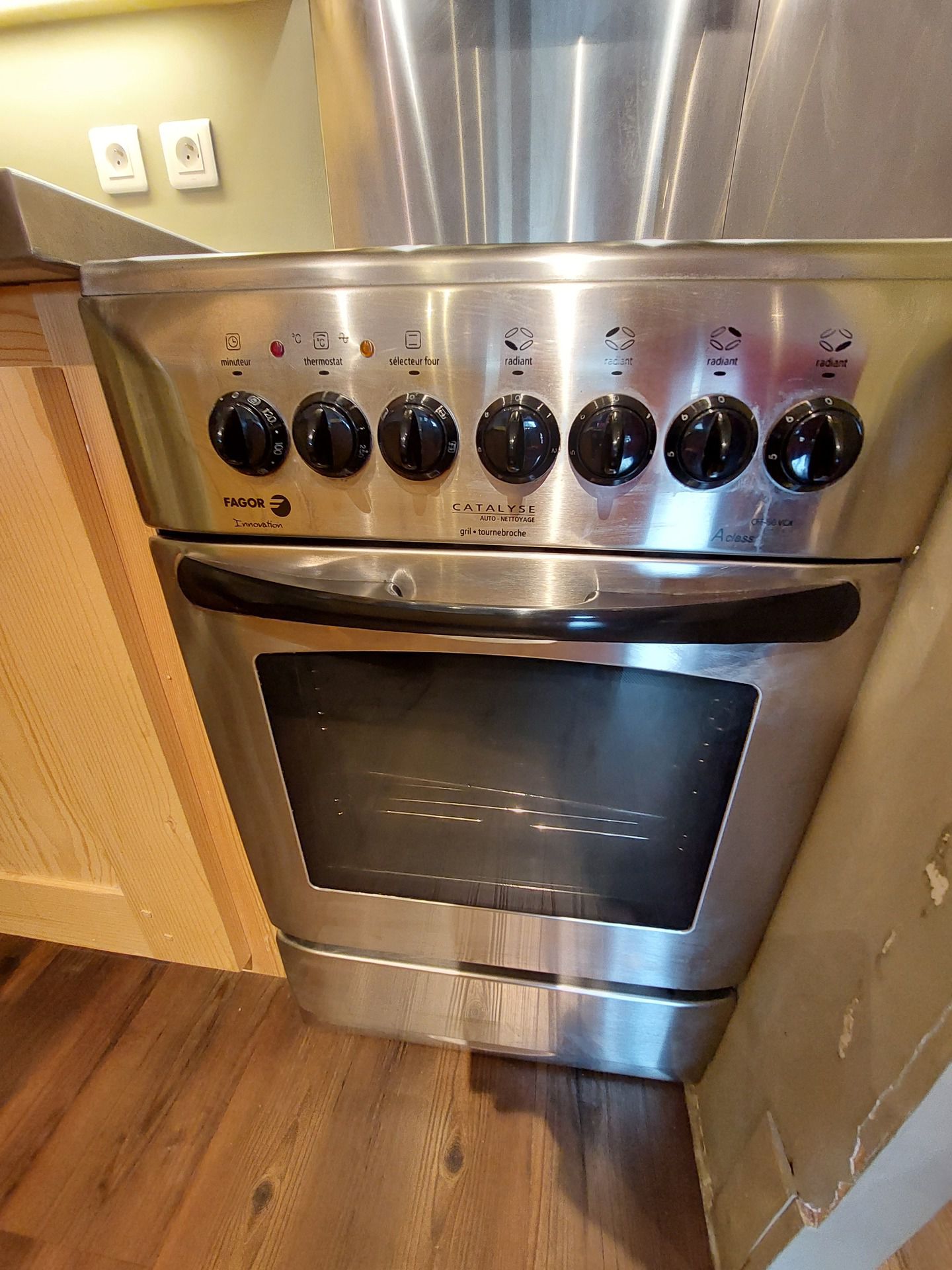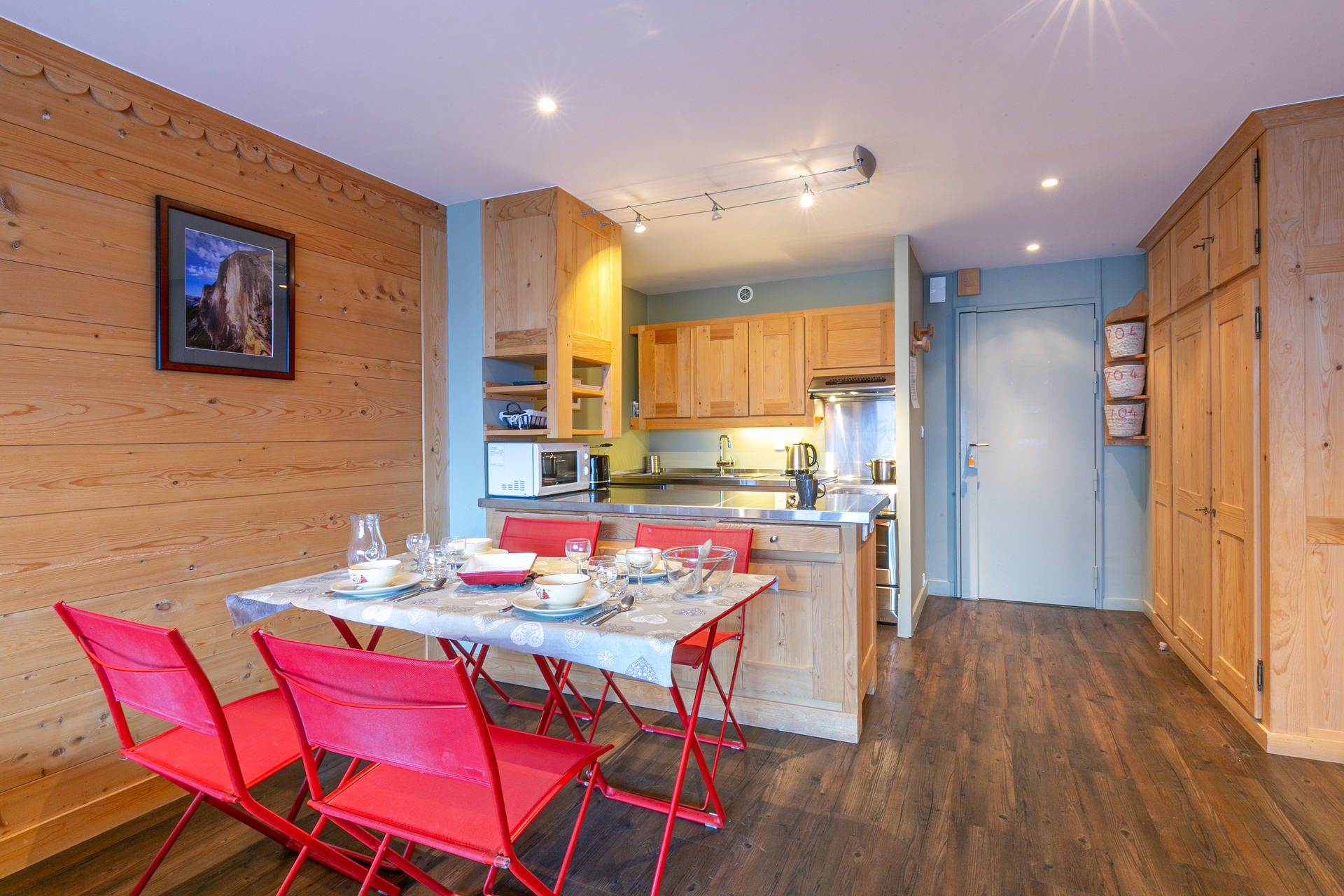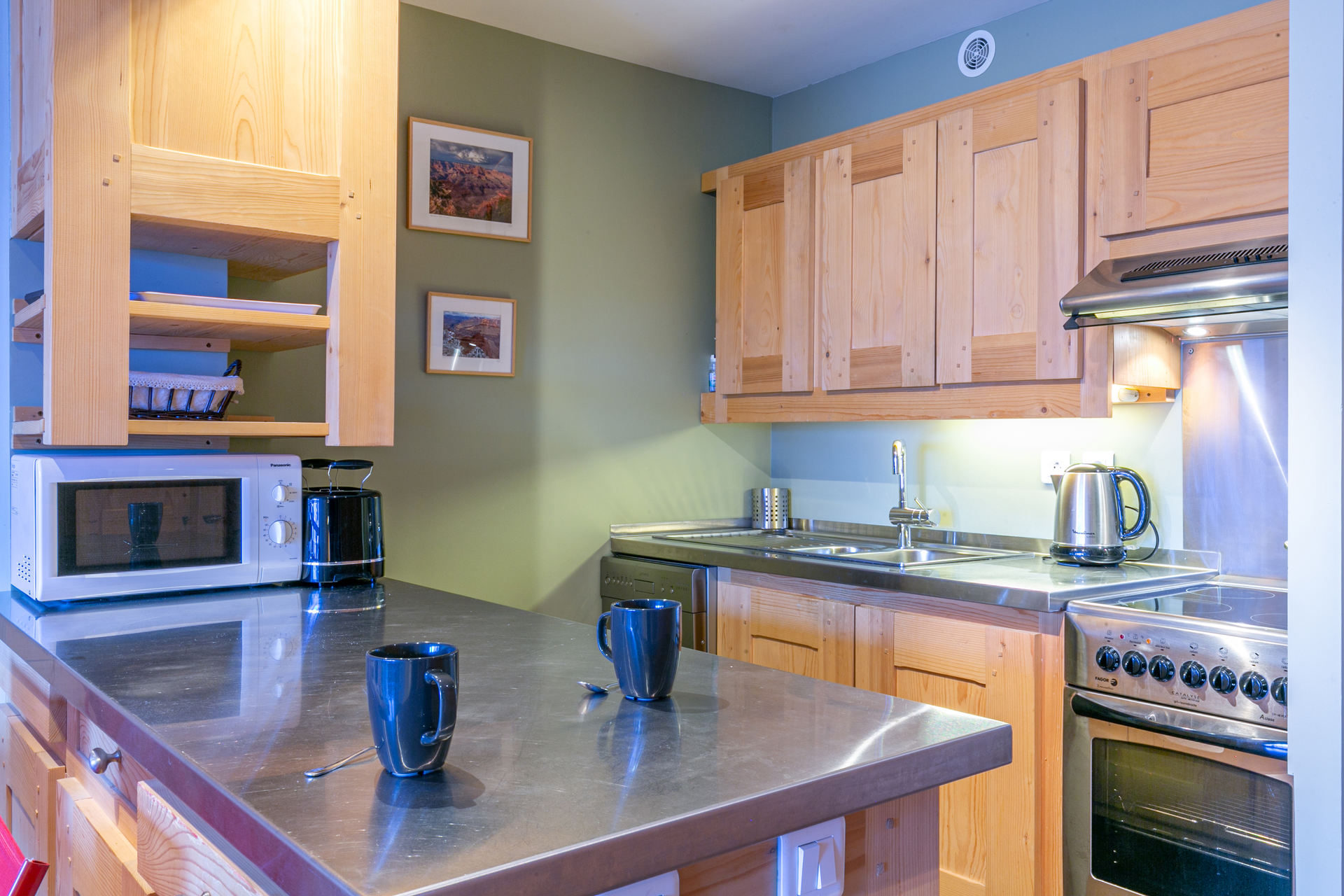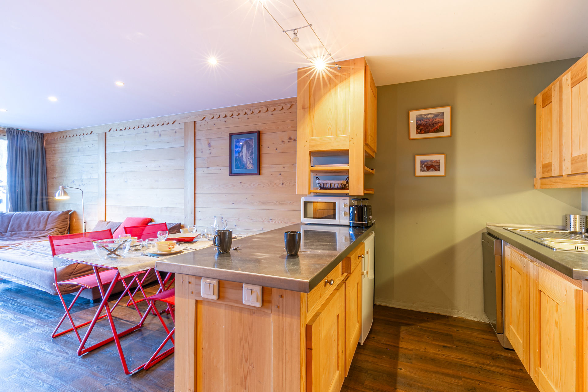 Equipée d'un lave-vaisselle, cuisinière avec four et plaque vitroceramique, four micro-ondes, hotte aspirante, réfrigérateur