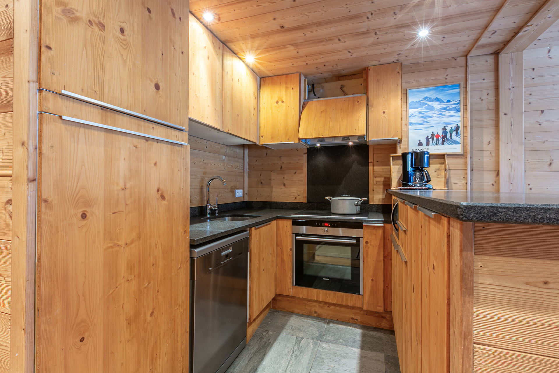Cuisine américaine équipée d'un lave-vaisselle, hotte aspirante, plaque vitroceramique, frigo, four, four micro-ondes