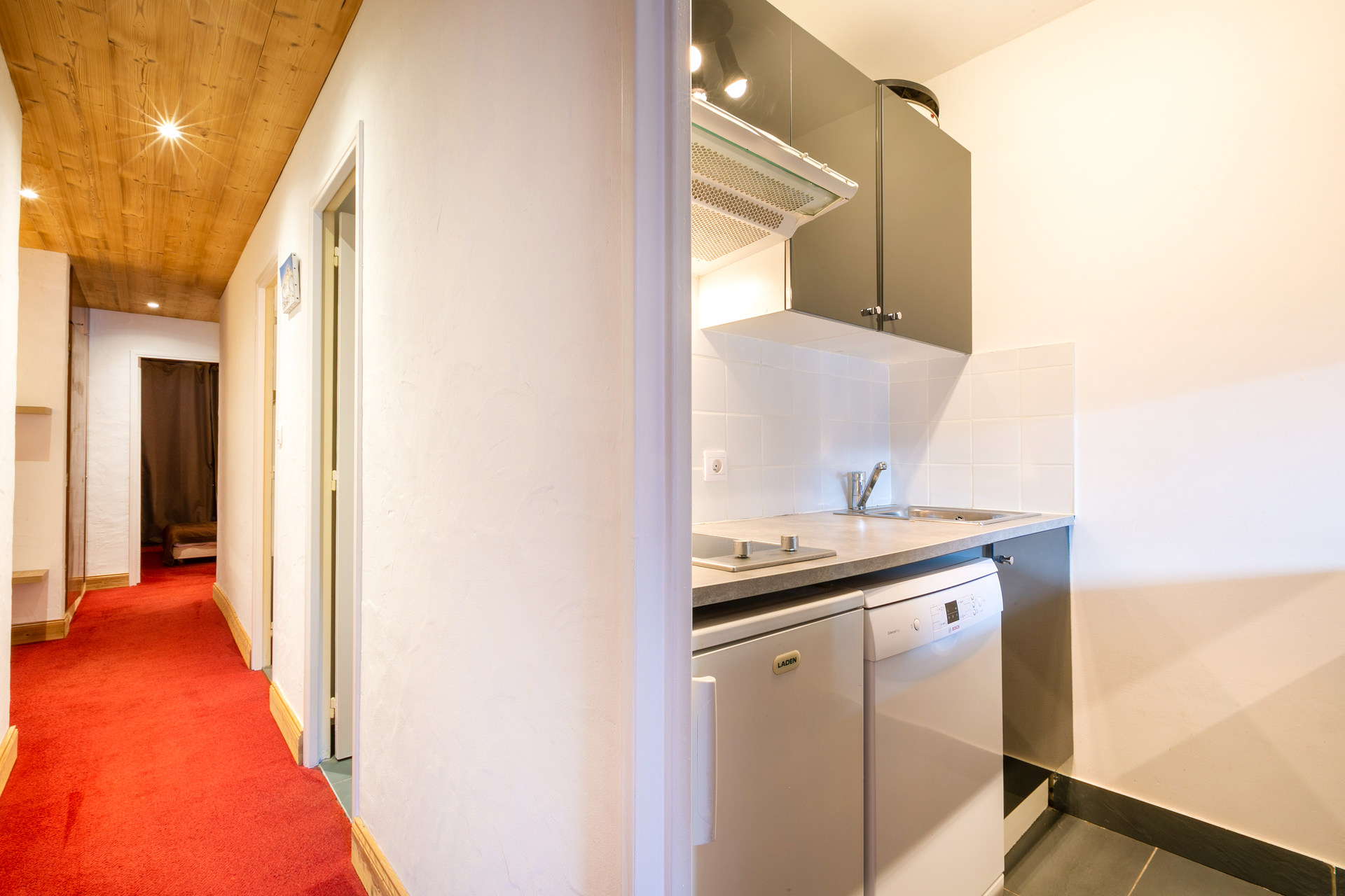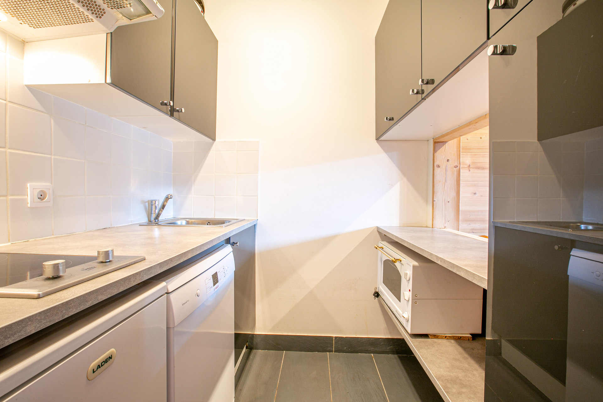 Cuisine Equipée d'un lave-vaisselle, plaque vitrocéramique, hotte aspirante, four, réfrigérateur Petit électroménager: cafetière électrique, bouilloire électrique, grille-pain, appareil à raclette