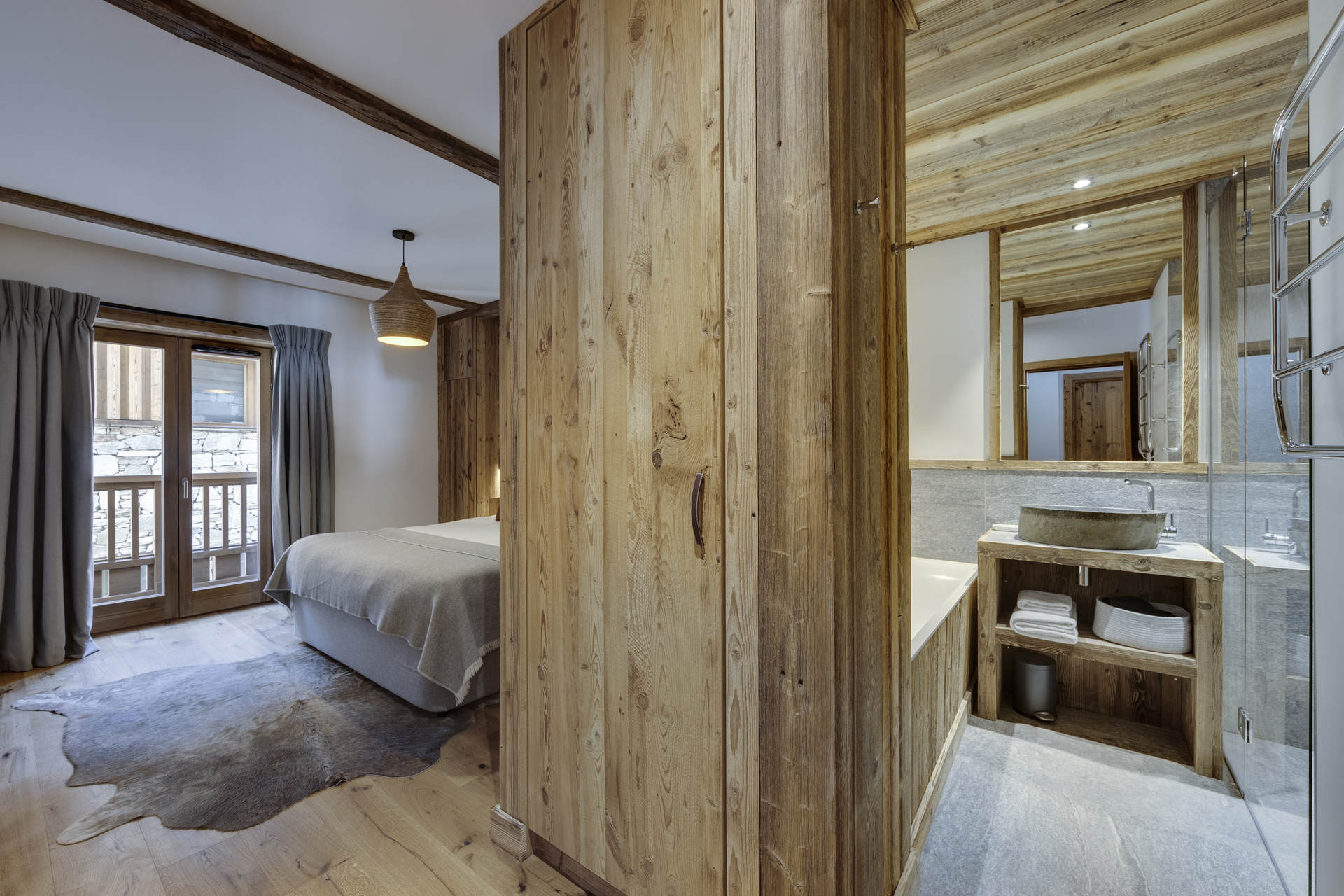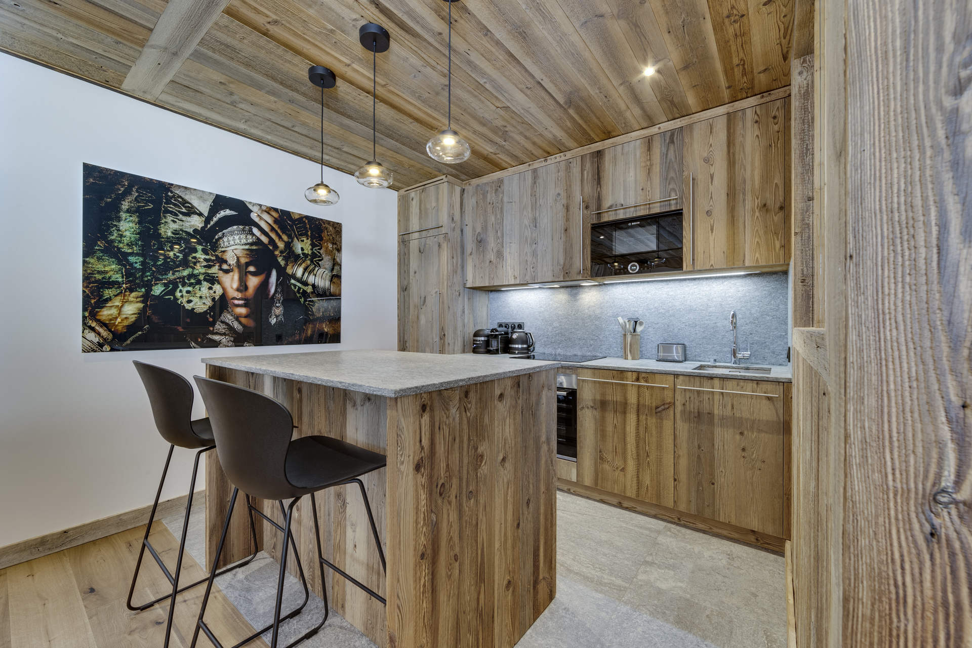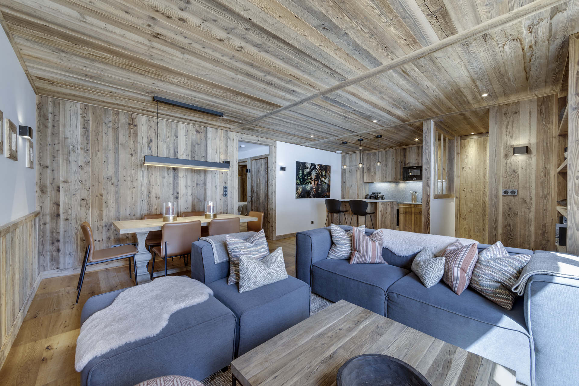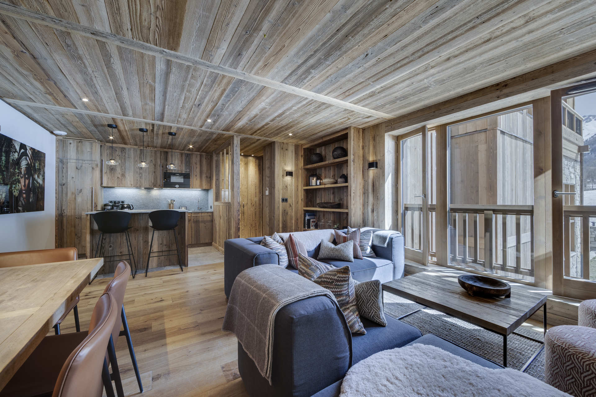 Intérieur de caractère alliant décoration contemporaine et architecture savoyarde authentique et chaleureuse faite de bois et pierre.