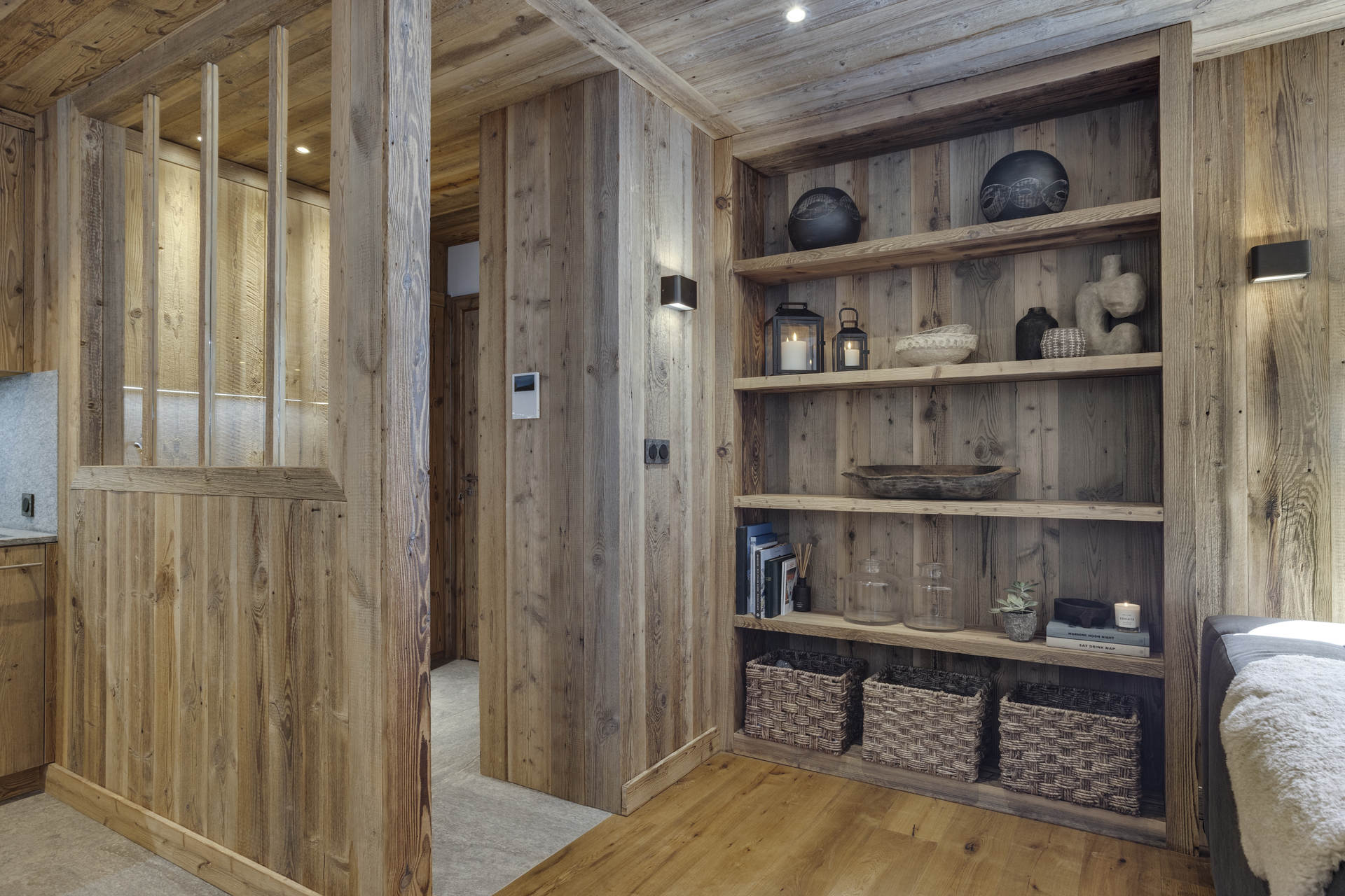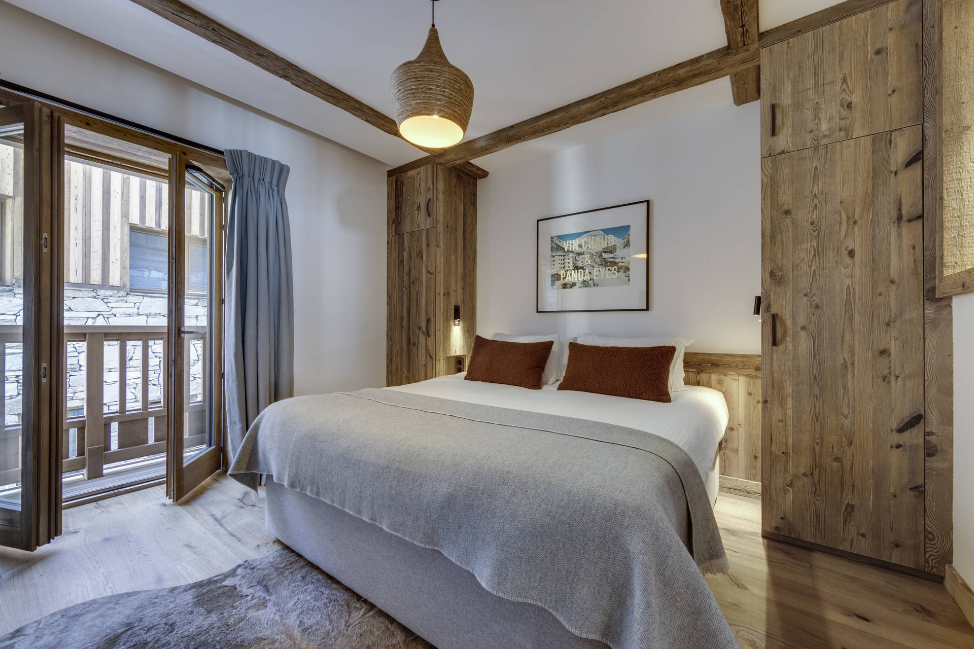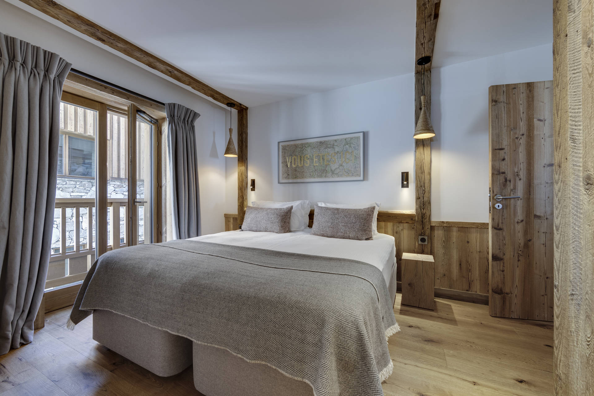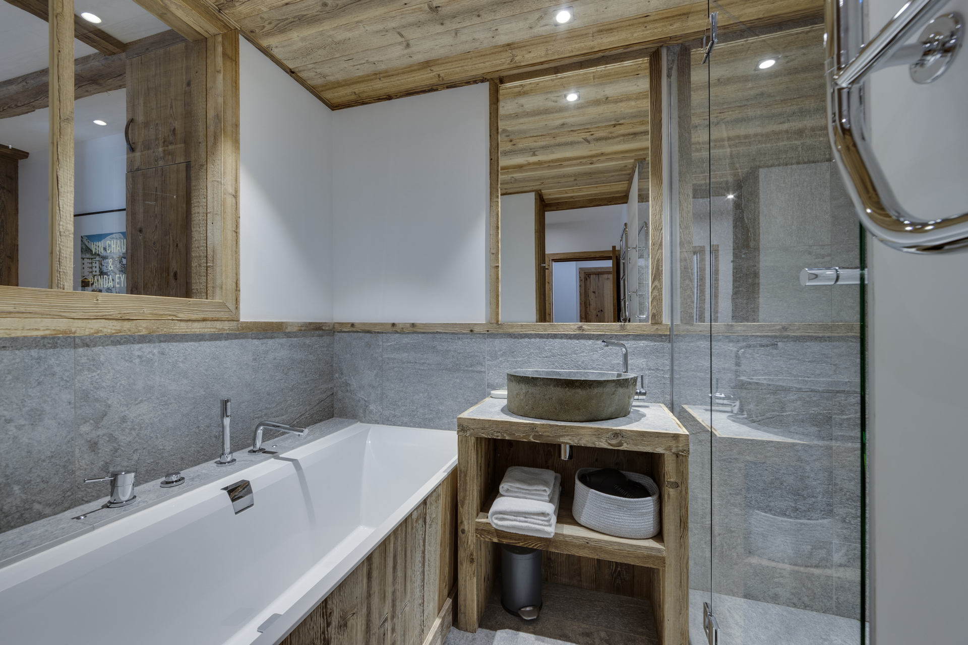 Intérieur de caractère alliant décoration contemporaine et architecture savoyarde authentique et chaleureuse faite de bois et pierre.