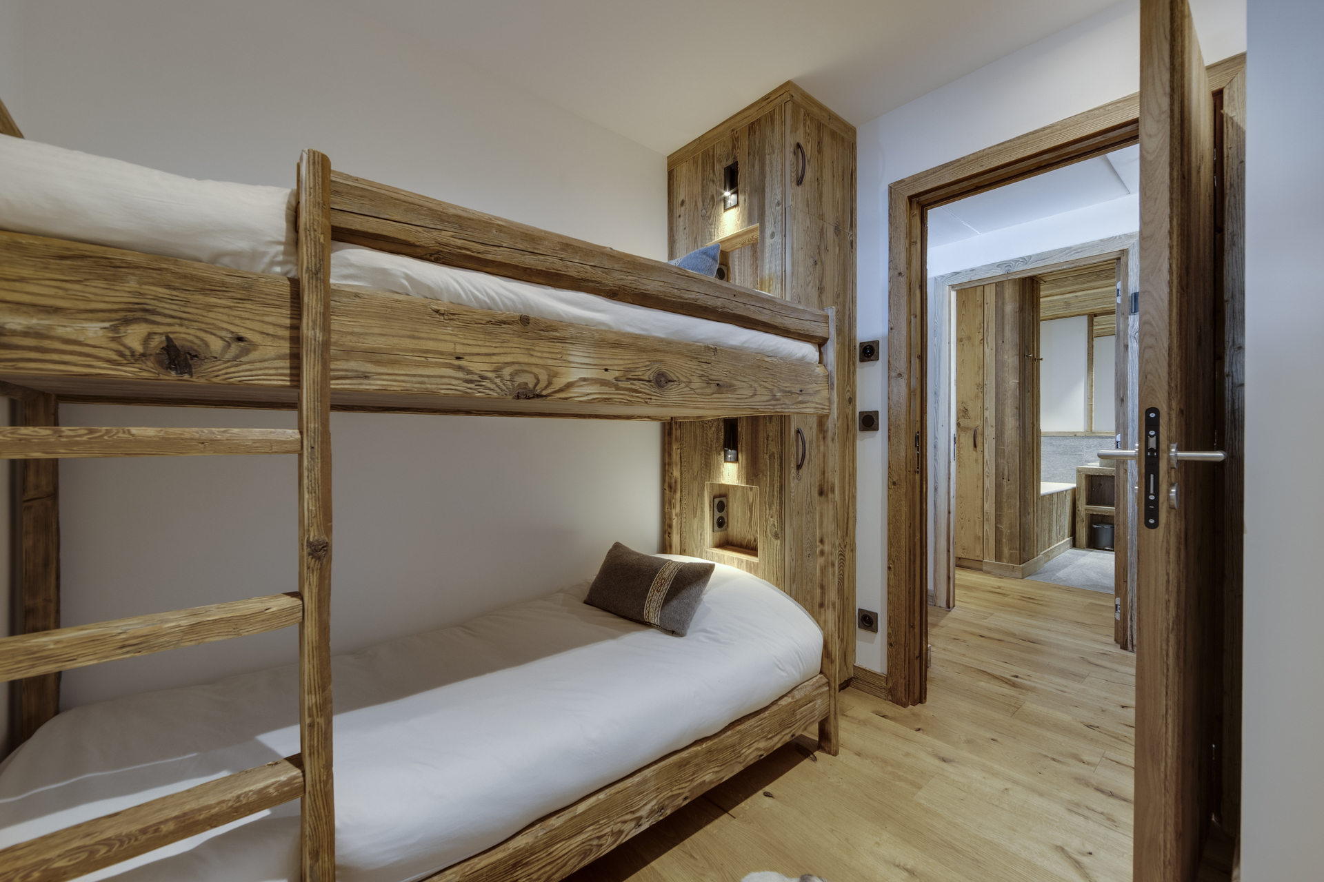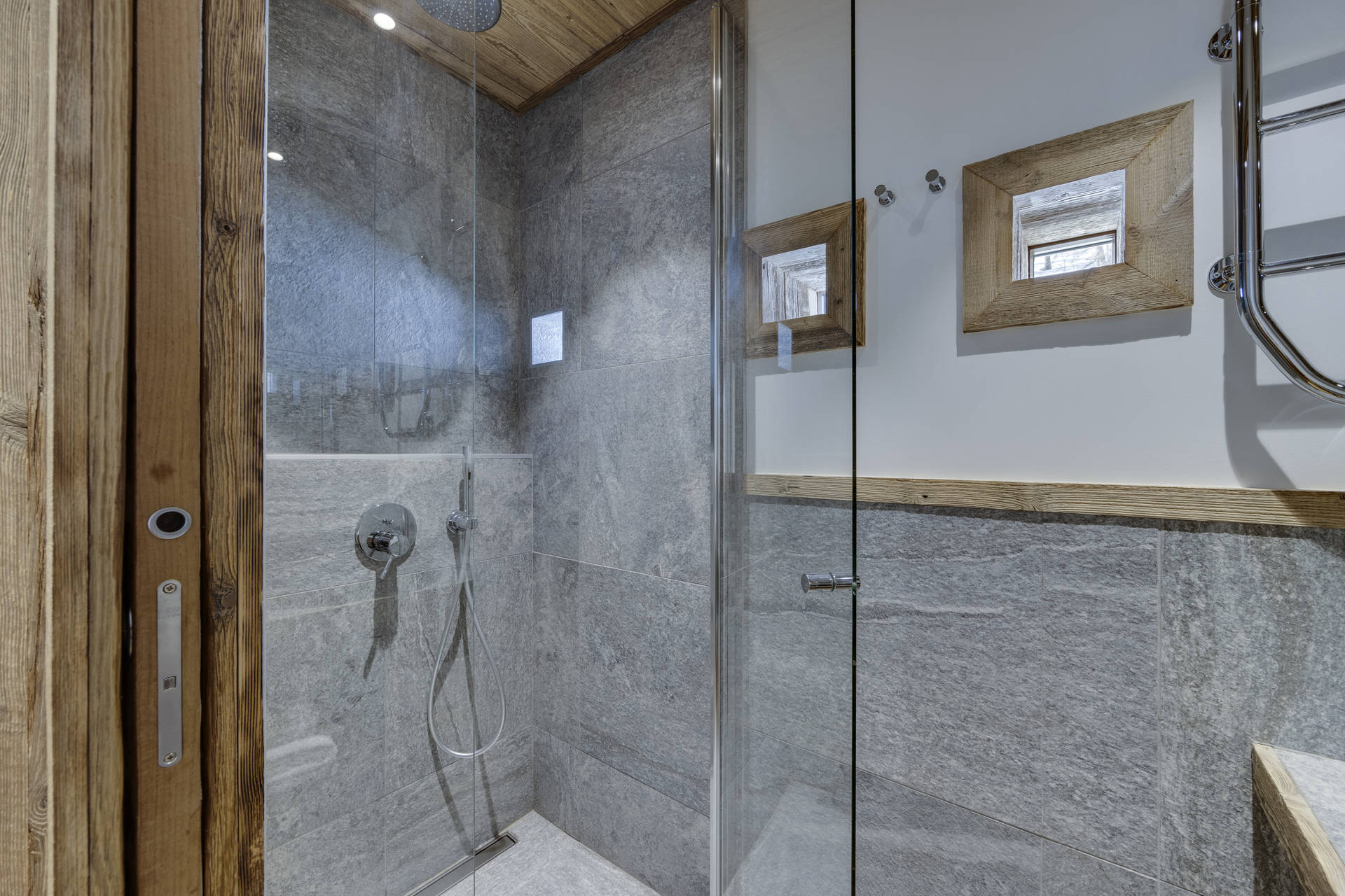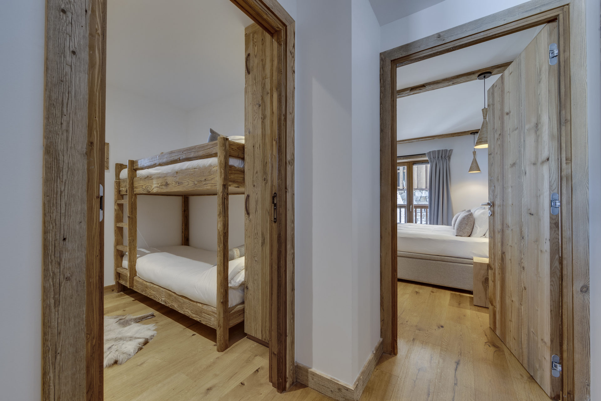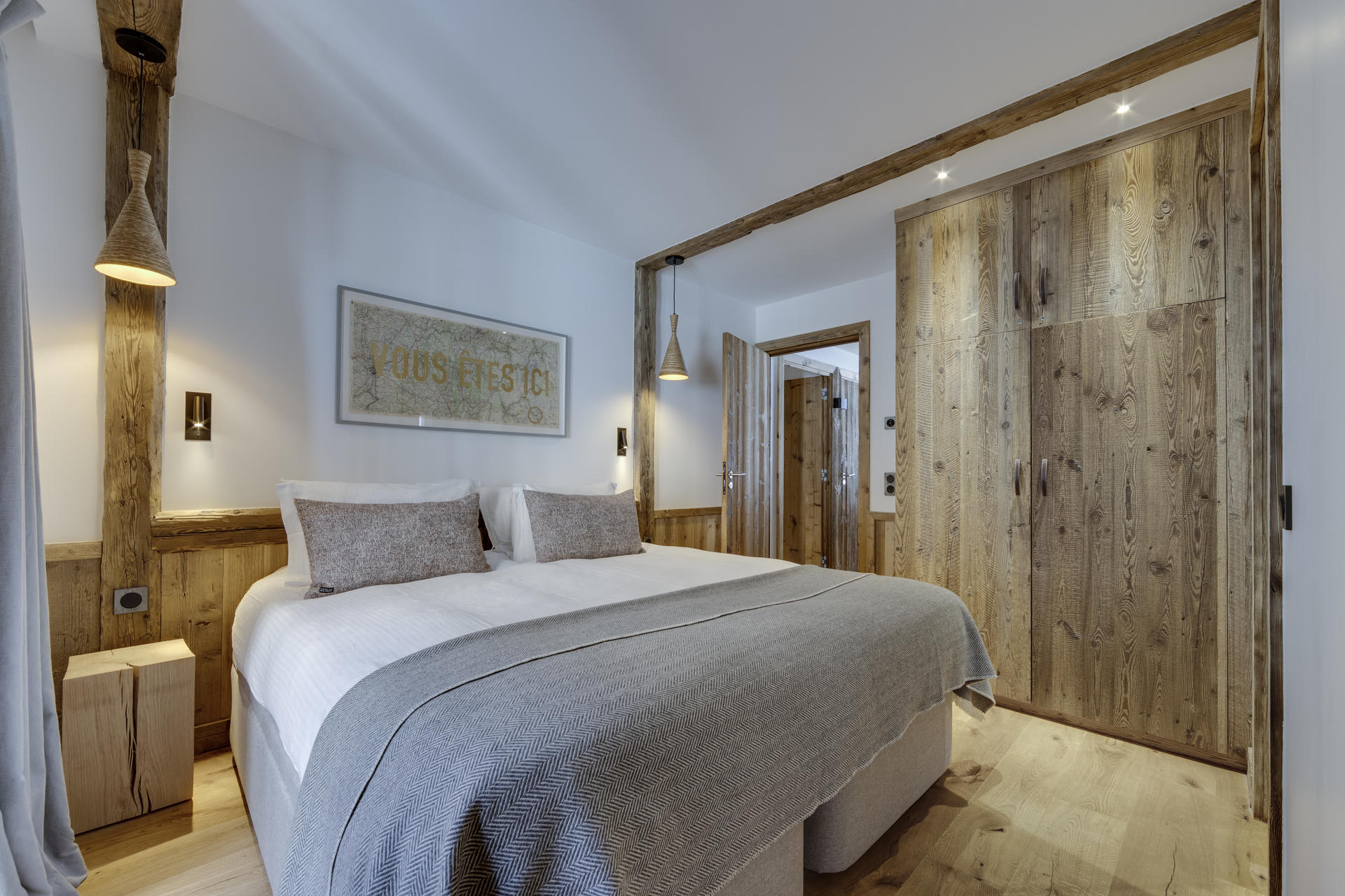 Intérieur de caractère alliant décoration contemporaine et architecture savoyarde authentique et chaleureuse faite de bois et pierre.
