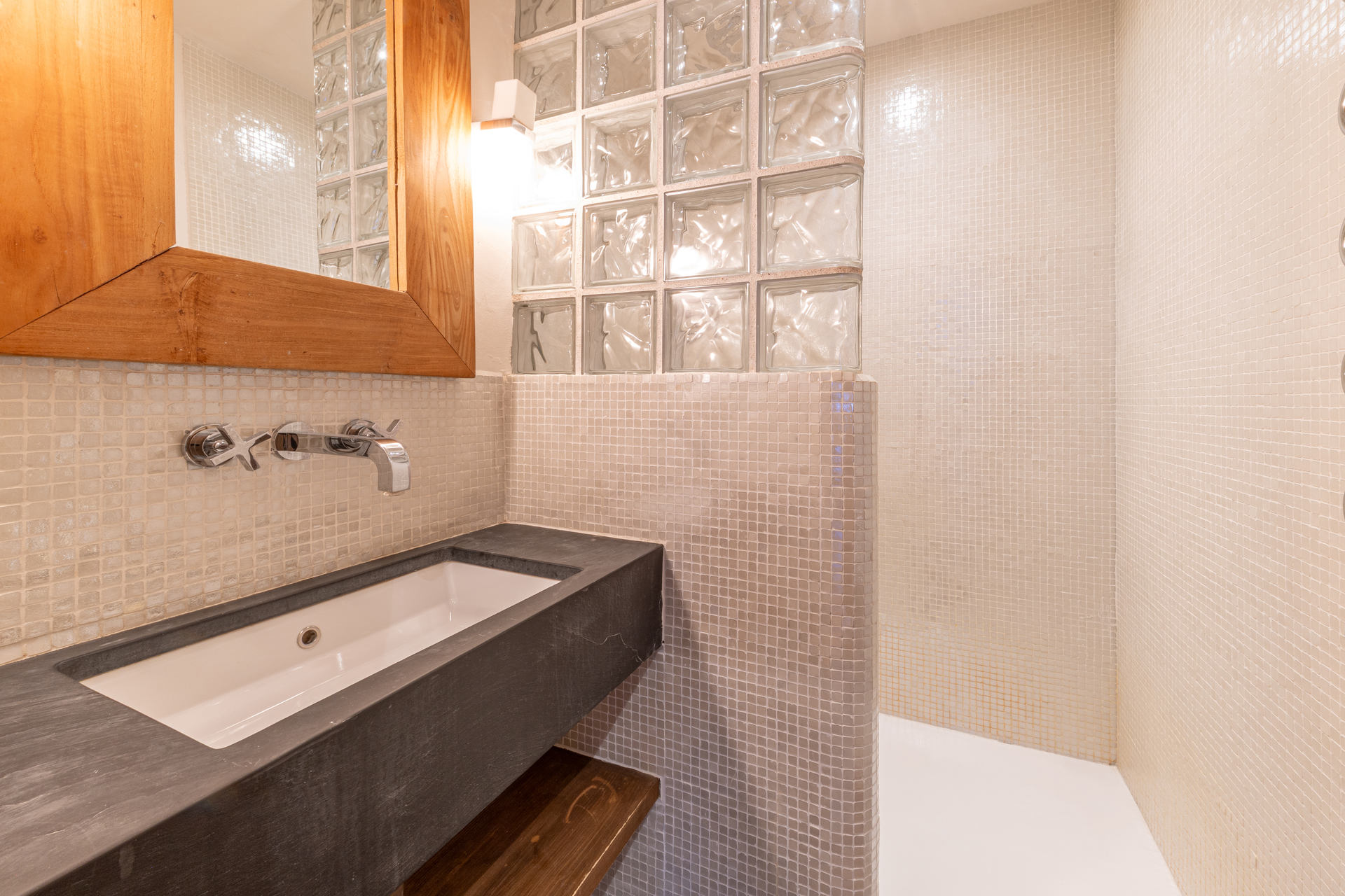 Salle de bain avec douche et lavabo