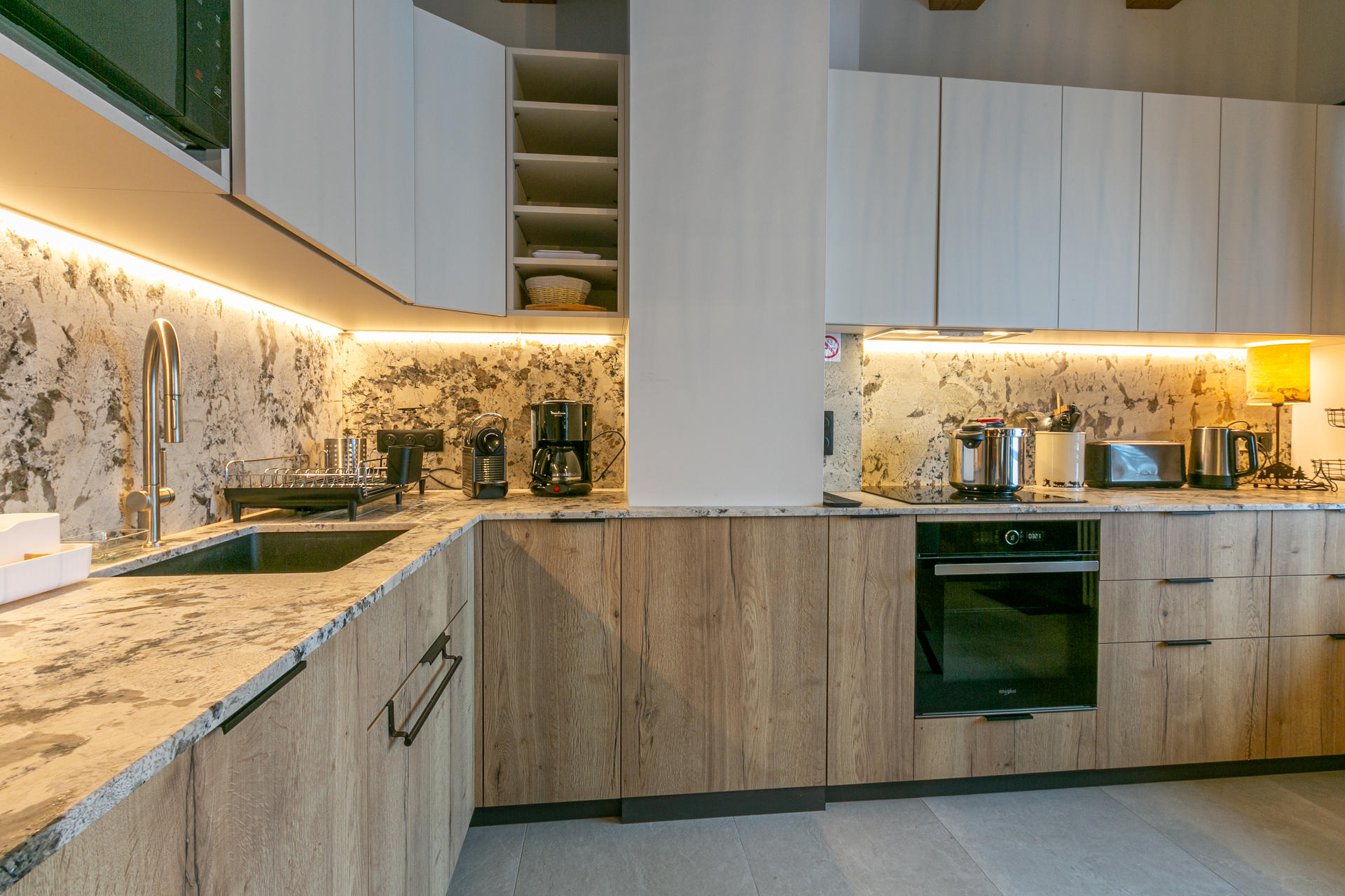 Equipée d'un four, four micro-ondes, plaque induction, lave-vaisselle, réfrigérateur avec congélateur, hotte aspirante.