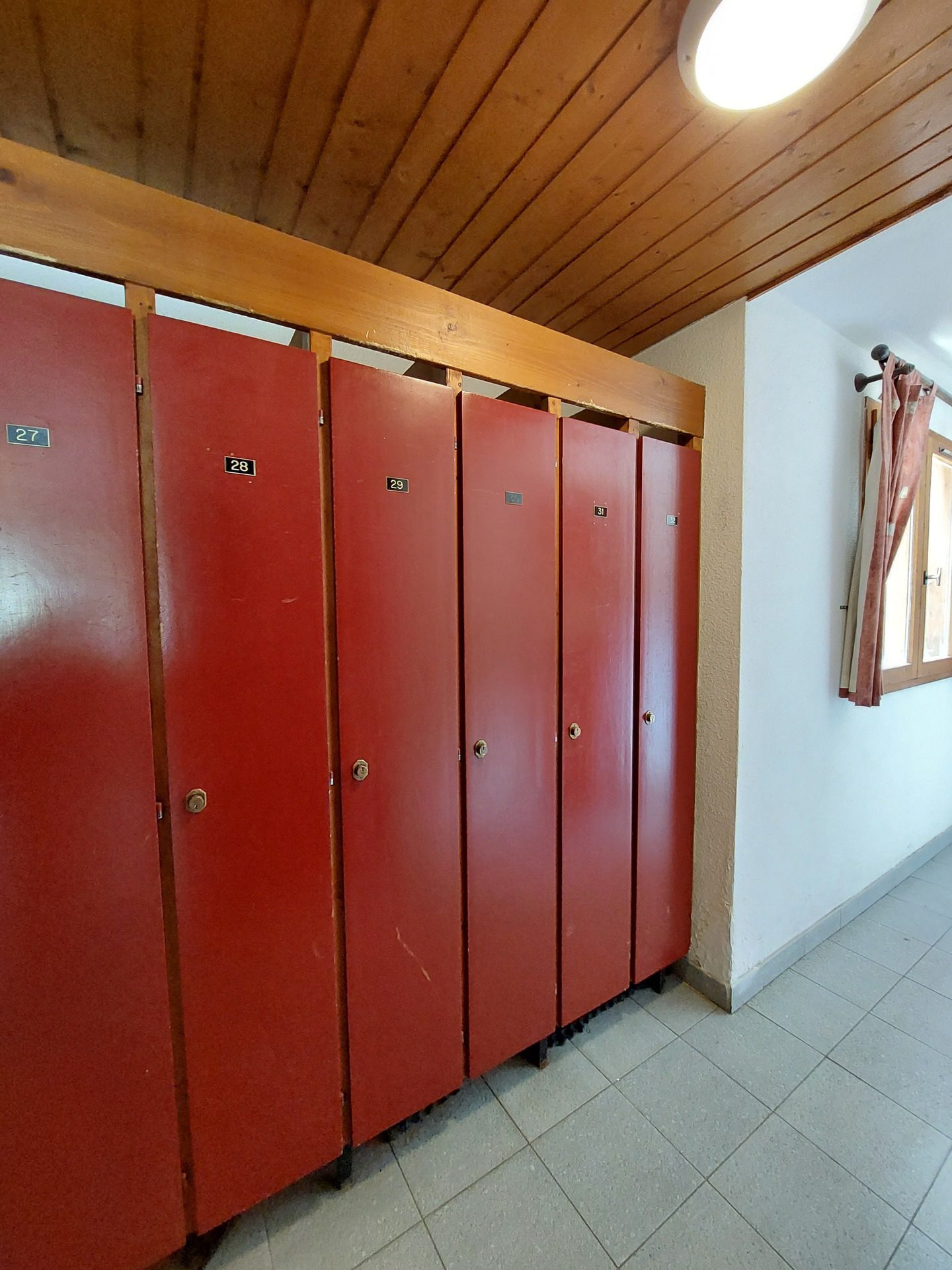 Local à skis au rez-de-chaussée et containers poubelle municipaux dans la rue.