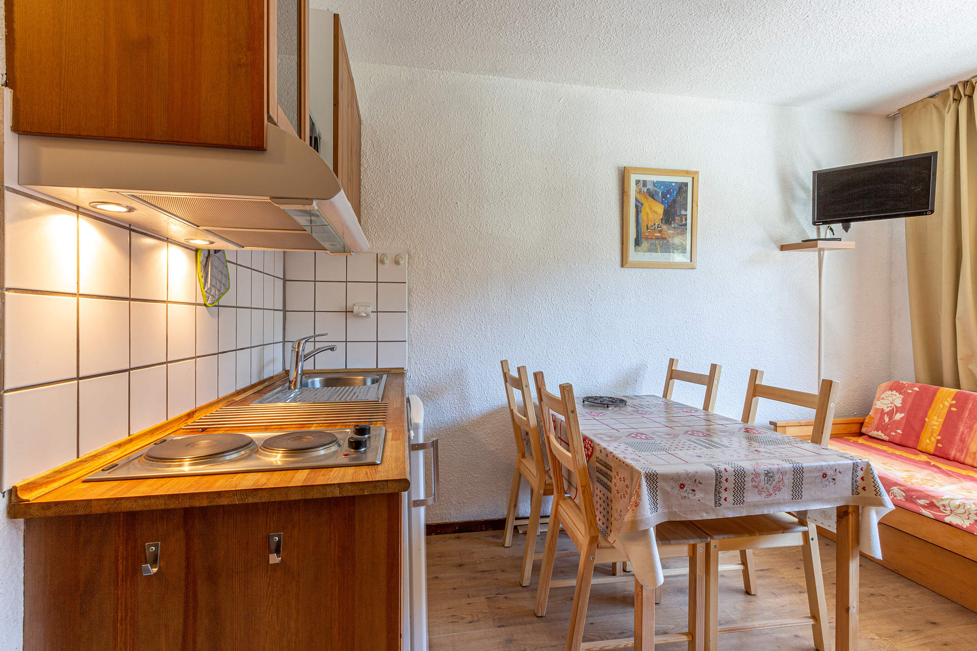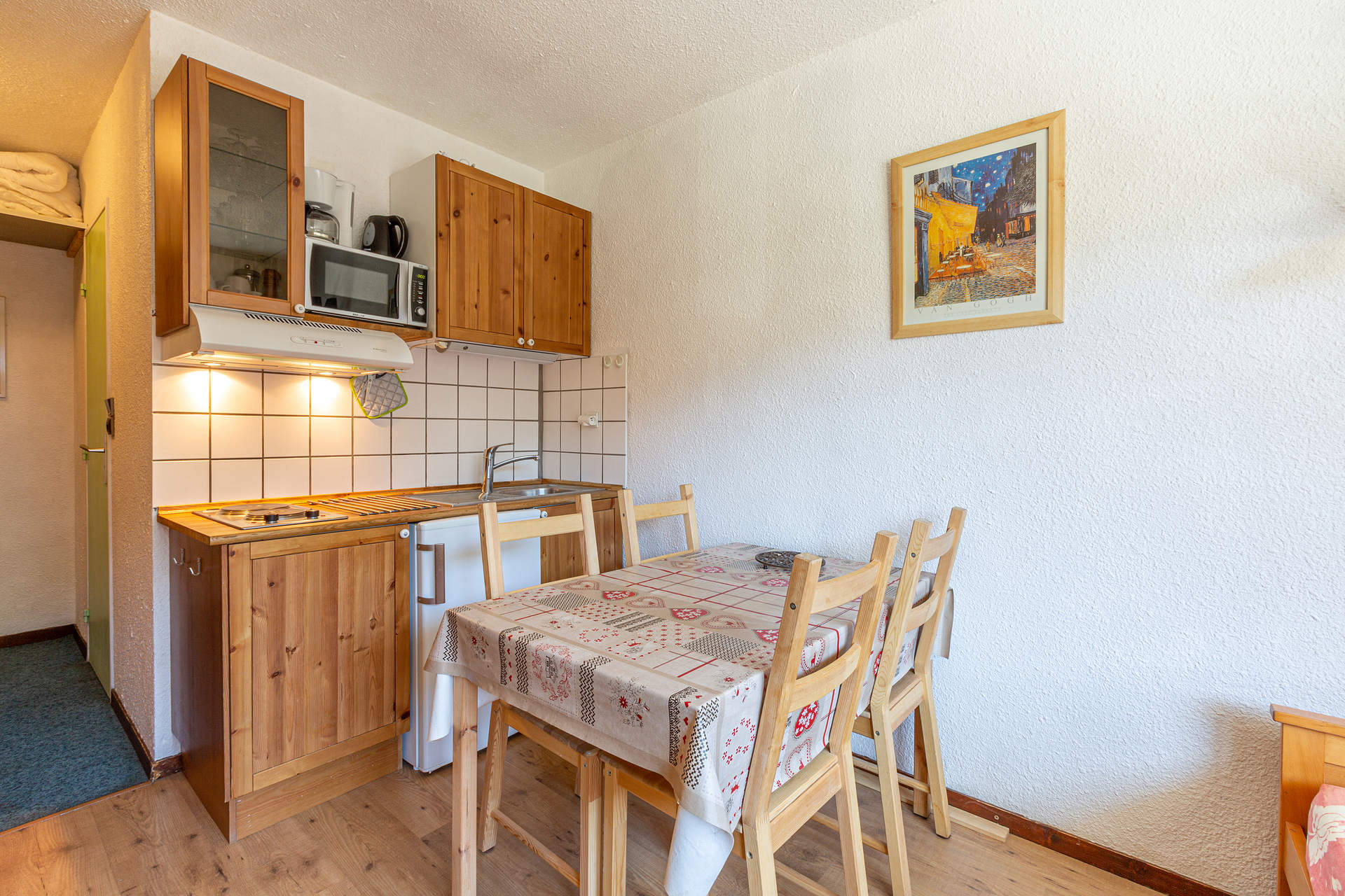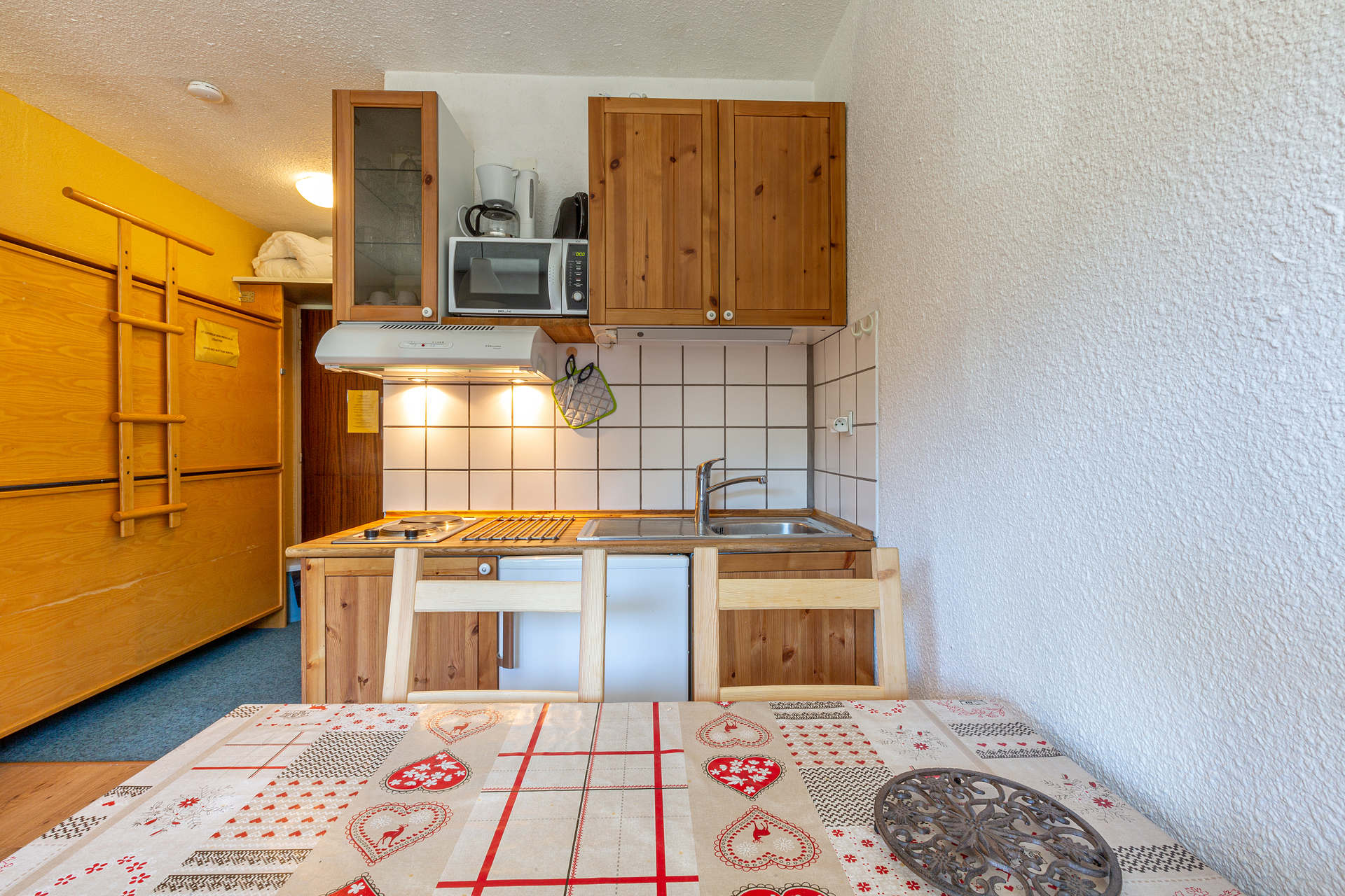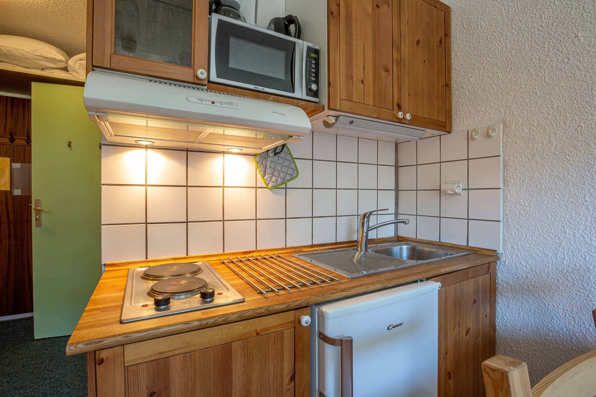 Equipée d'un four micro-ondes, hotte aspirante, réfrigérateur, plaque électrique