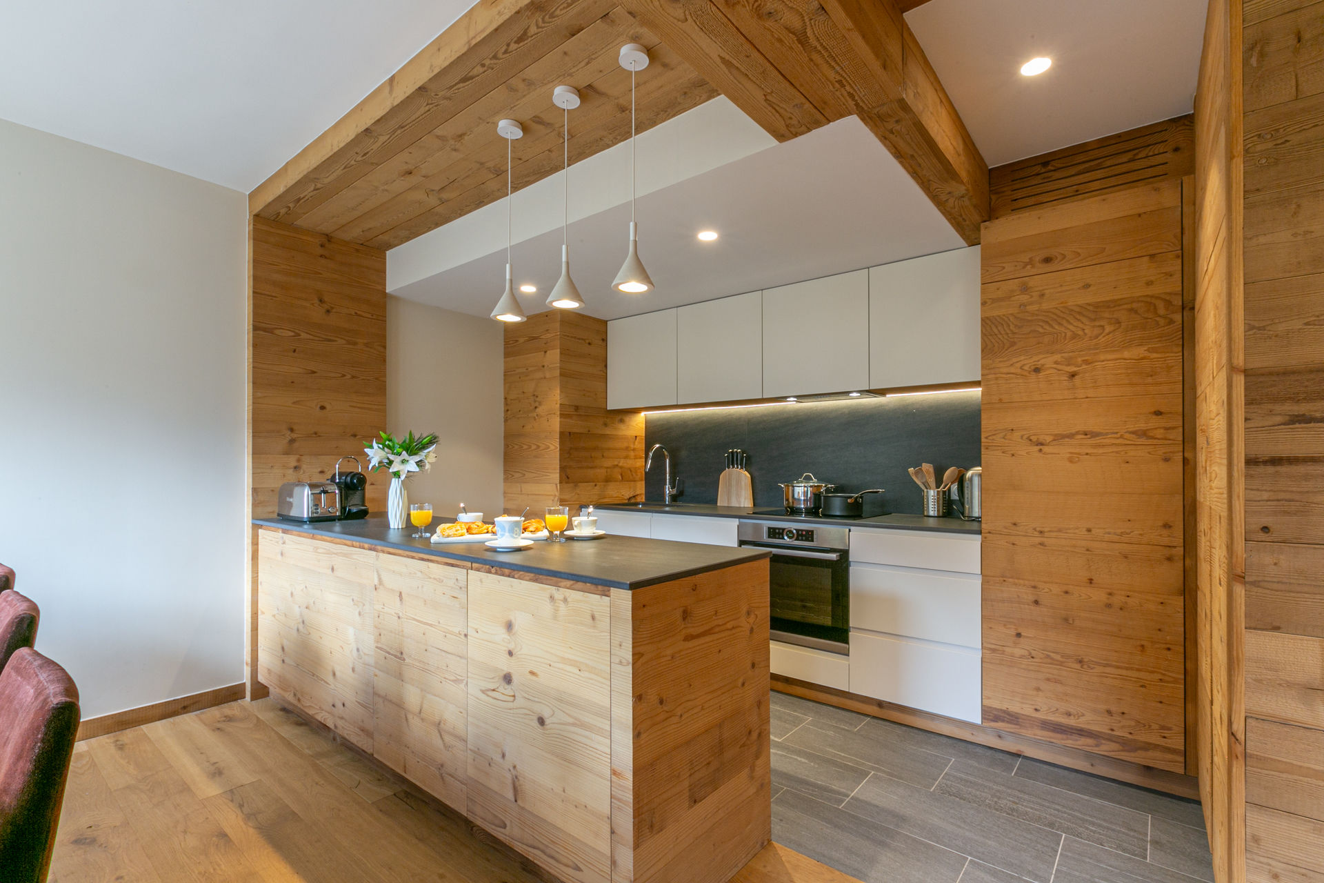Cuisine ouverte équipée d'un four, lave-vaisselle, four micro-ondes, grand réfrigérateur avec compartiment congélation, hotte aspirante, plaque vitrocéramique, cave à vin