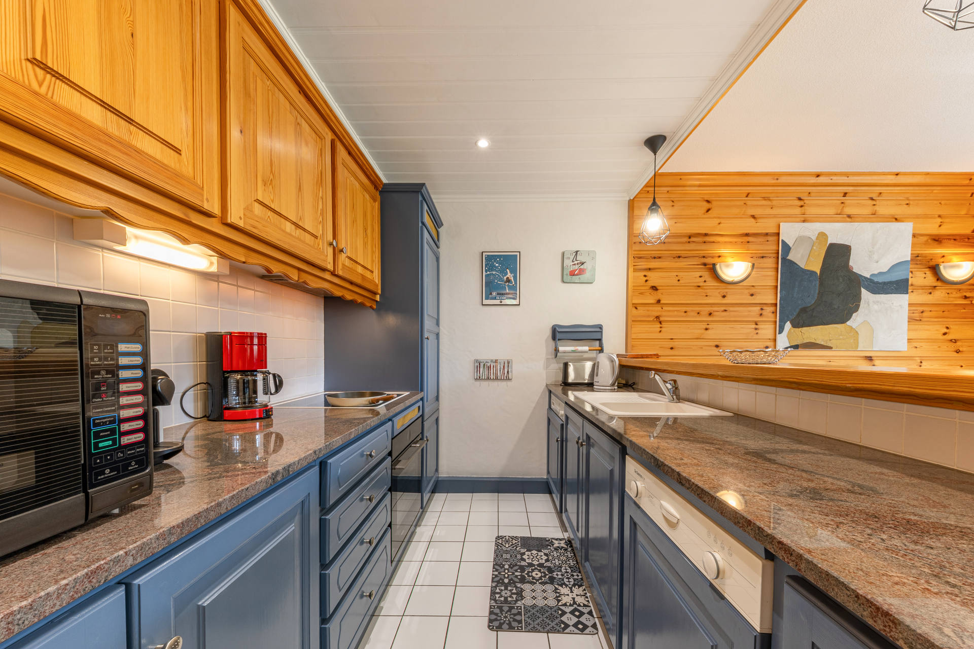 Cuisine américaine équipée d'un four, hotte aspirante, lave-vaisselle, lave-linge séchant, plaque vitrocéramique, réfrigérateur avec congélateur et four micro-ondes