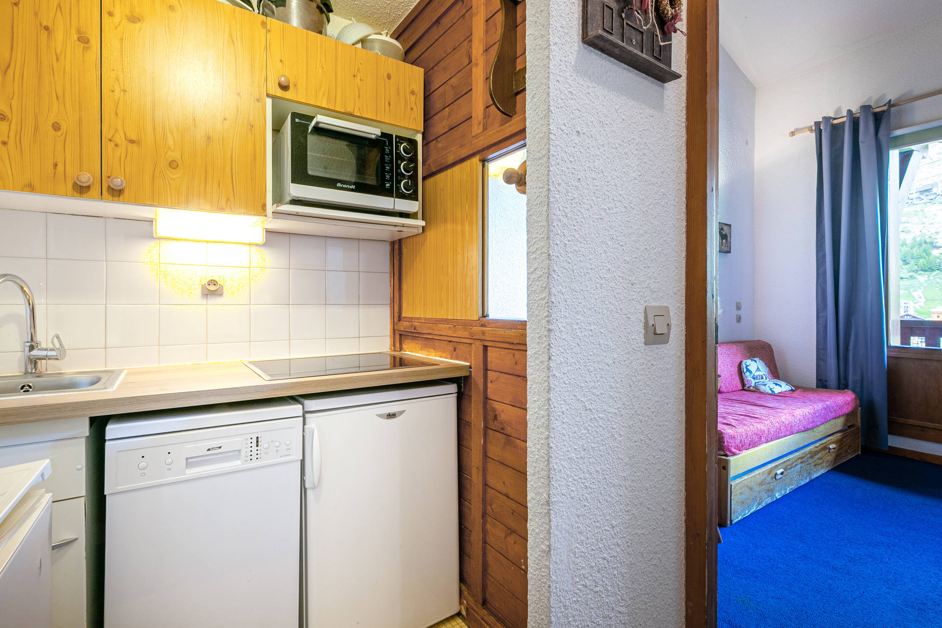 Equipée d'un petit four, lave-vaisselle, lave-linge,réfrigérateur, plaque vitrocéramique (4 feux) et d'un four micro-ondes