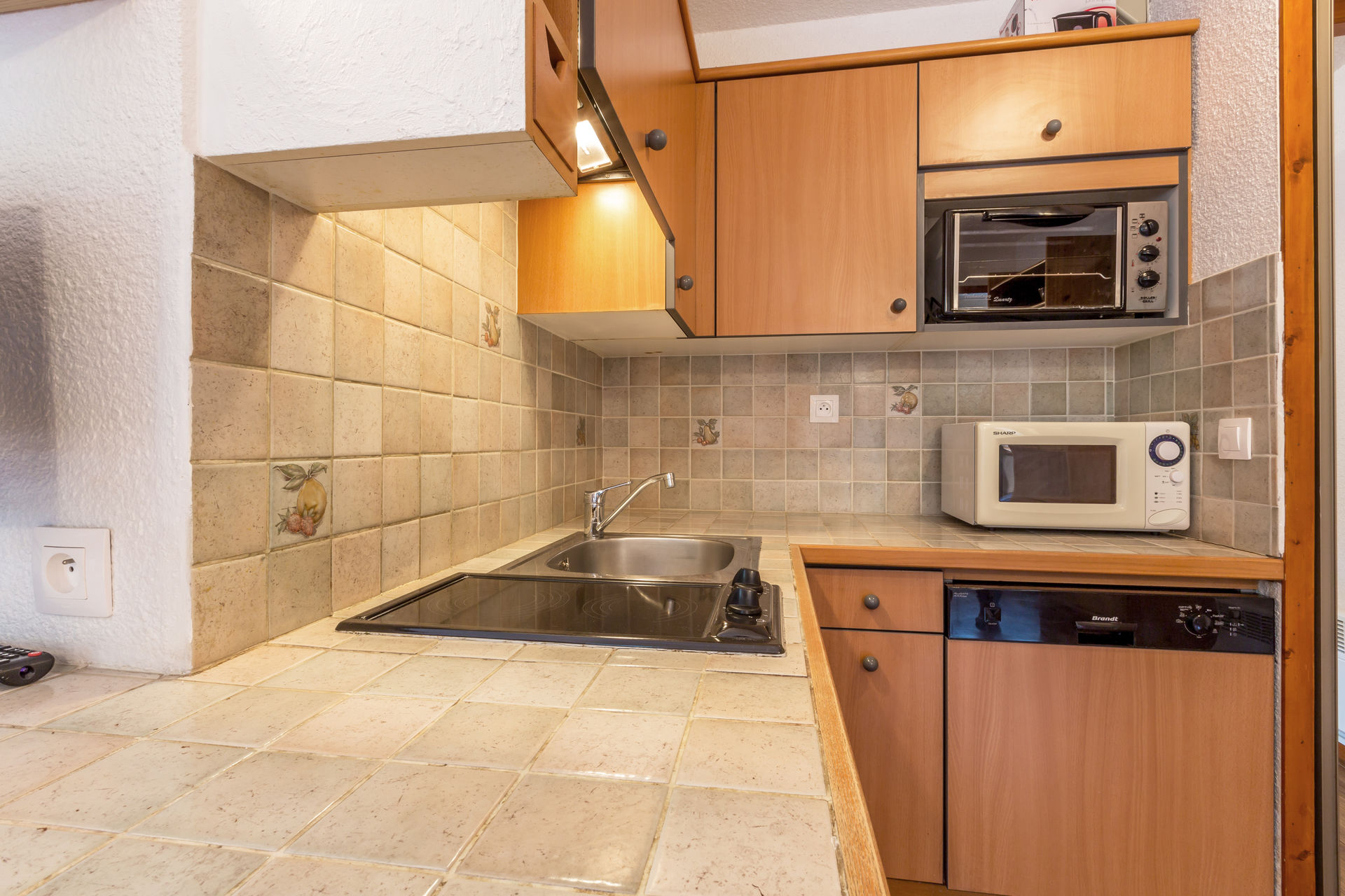 Equipée d'un lave-vaisselle, four micro-ondes, four, réfrigérateur, hotte aspirante et plaque vitrocéramique.