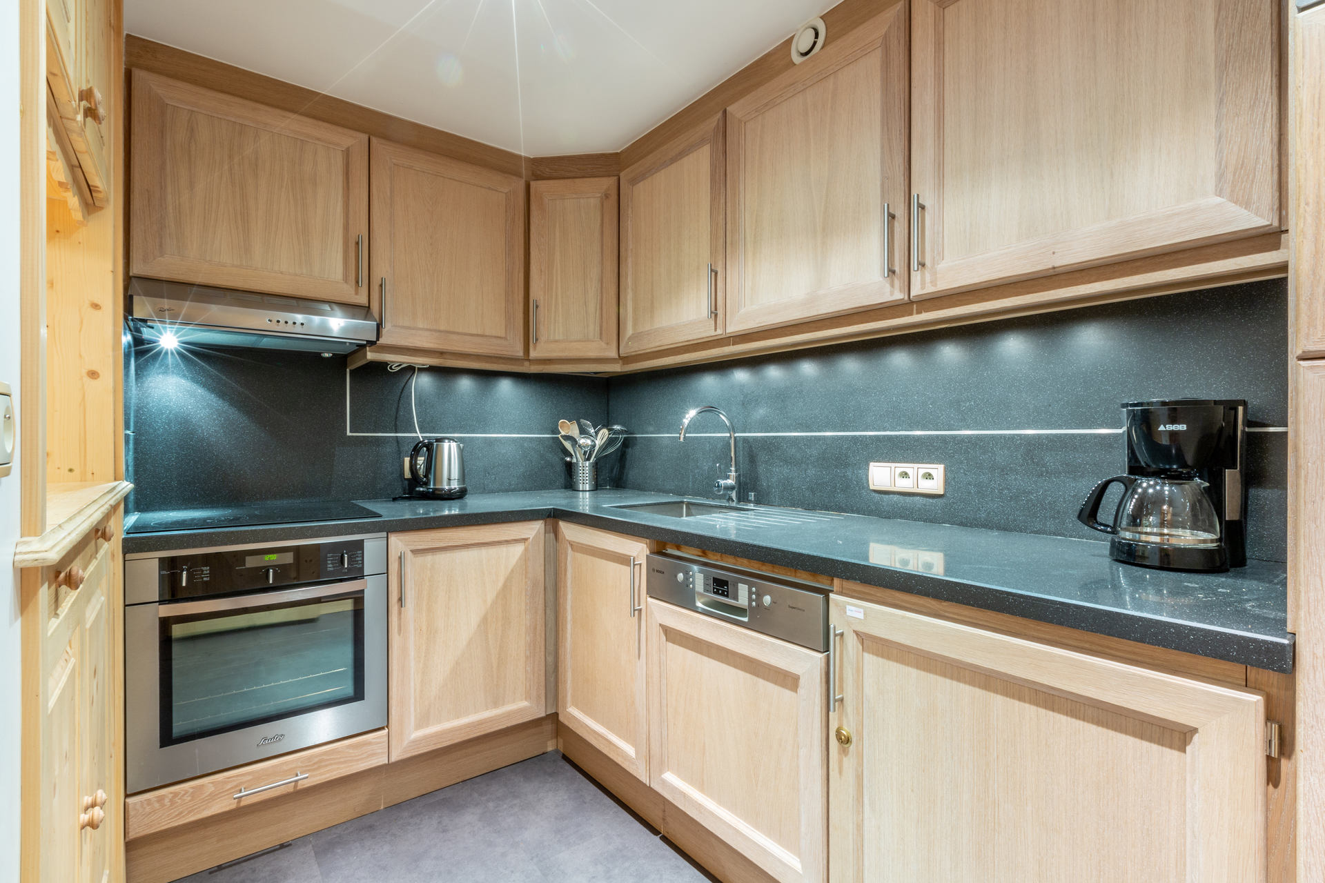 Equipée d'un refrigérateur avec congélateur, lave-vaisselle, four, hotte aspirante, four micro-ondes, plaque vitrocéramique