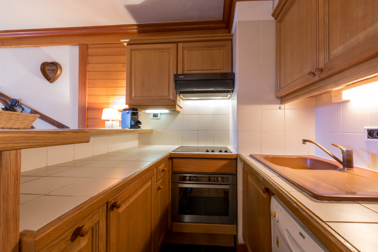 Equipée d'un combi micro-ondes/four, plaque vitrocéramique, réfrigérateur avec congélateur, hotte aspirante et lave-vaisselle