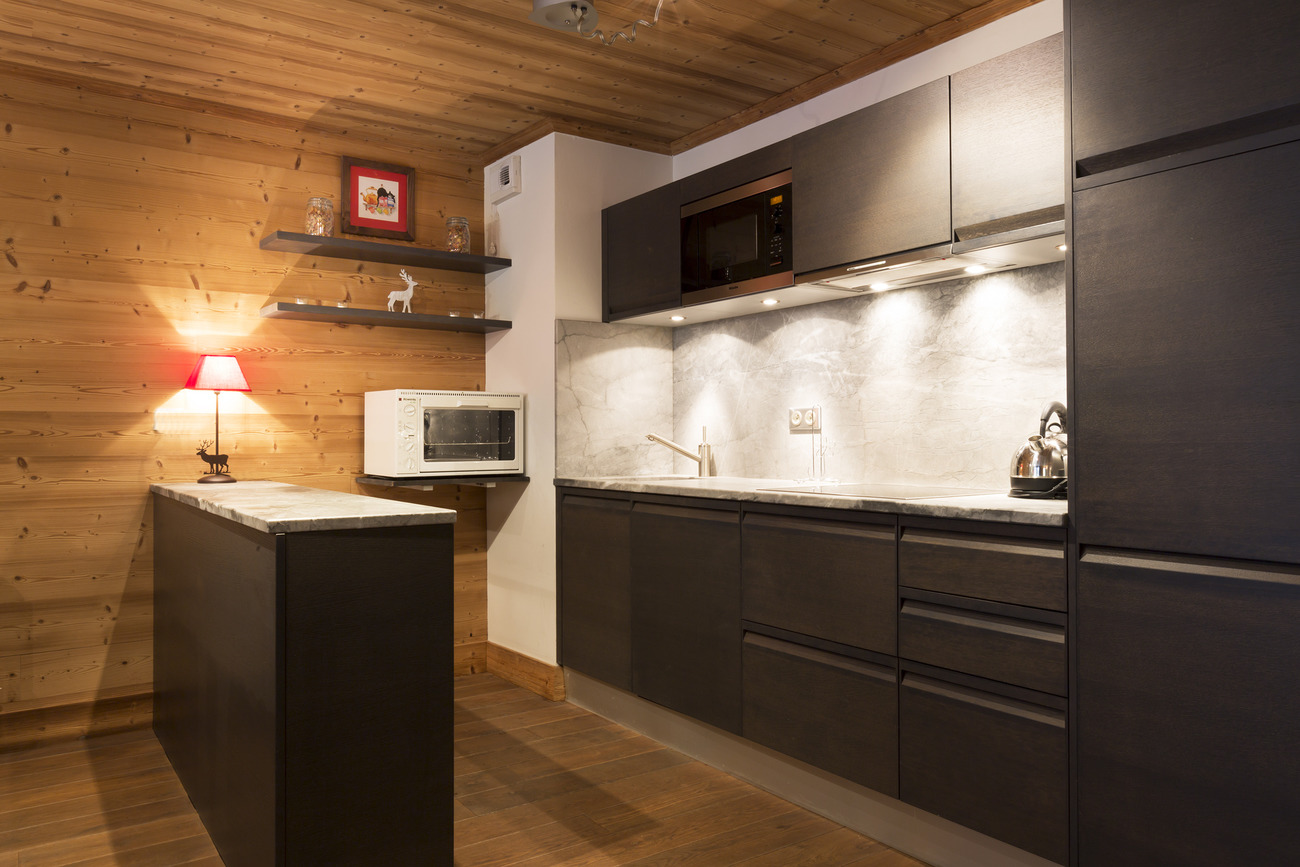 Cuisine américaine equipée d'un lave-vaisselle, four, plaque vitrocéramique, hotte aspirante, four micro-ondes, grand réfrigérateur avec congélateur