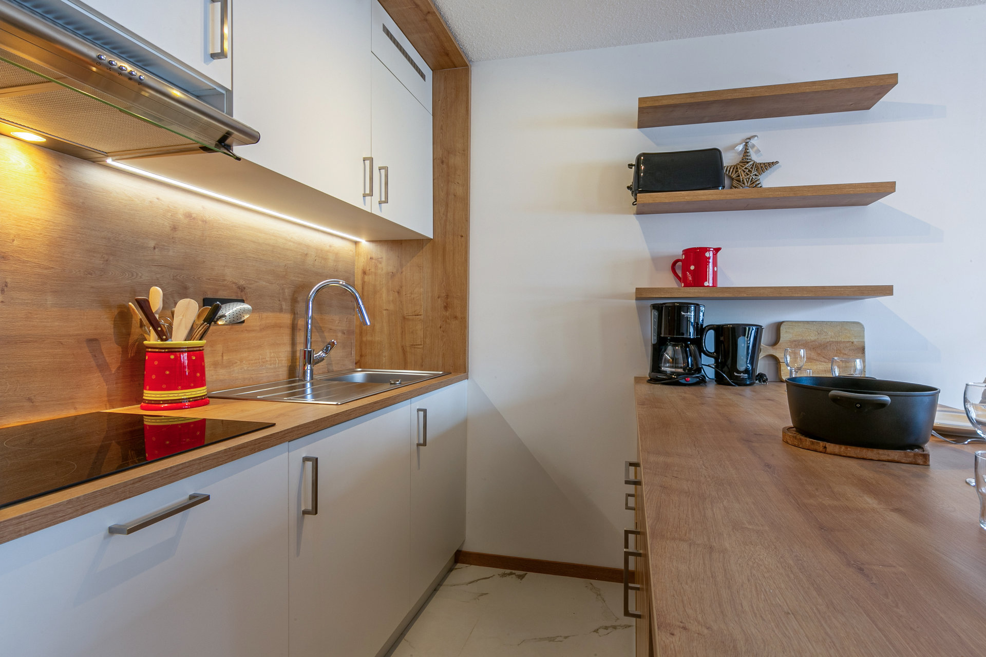 Equipée d'un lave-vaisselle, four micro-ondes avec grill, hotte aspirante, réfrigérateur, plaque induction