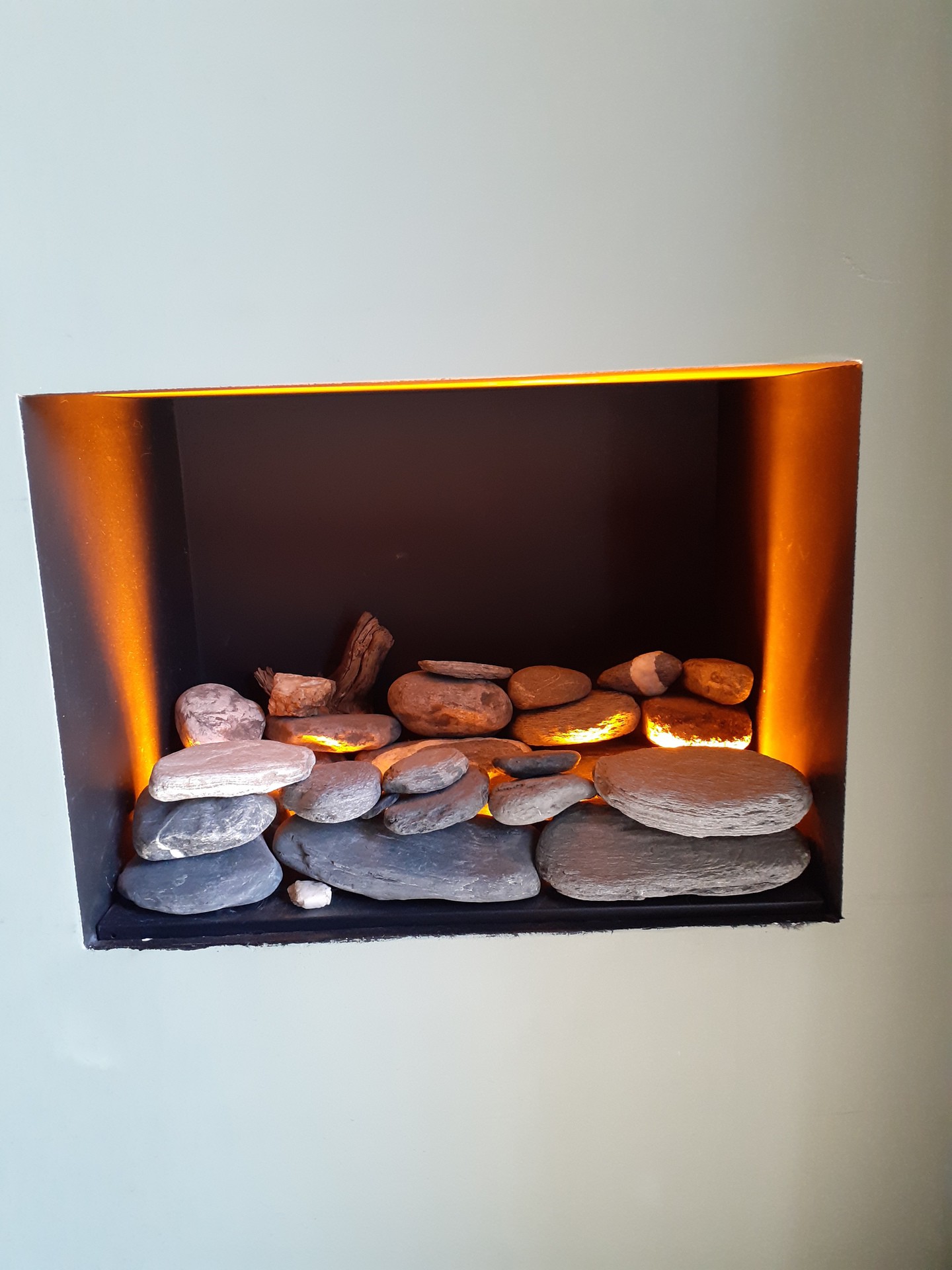 Fausse cheminée avec de la vapeur et lumière orange simulant les flammes et créant une atmosphere chaleureuse