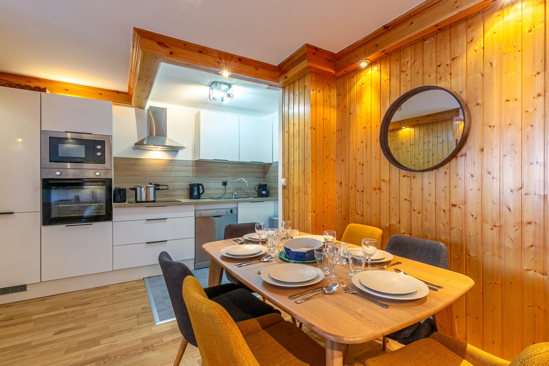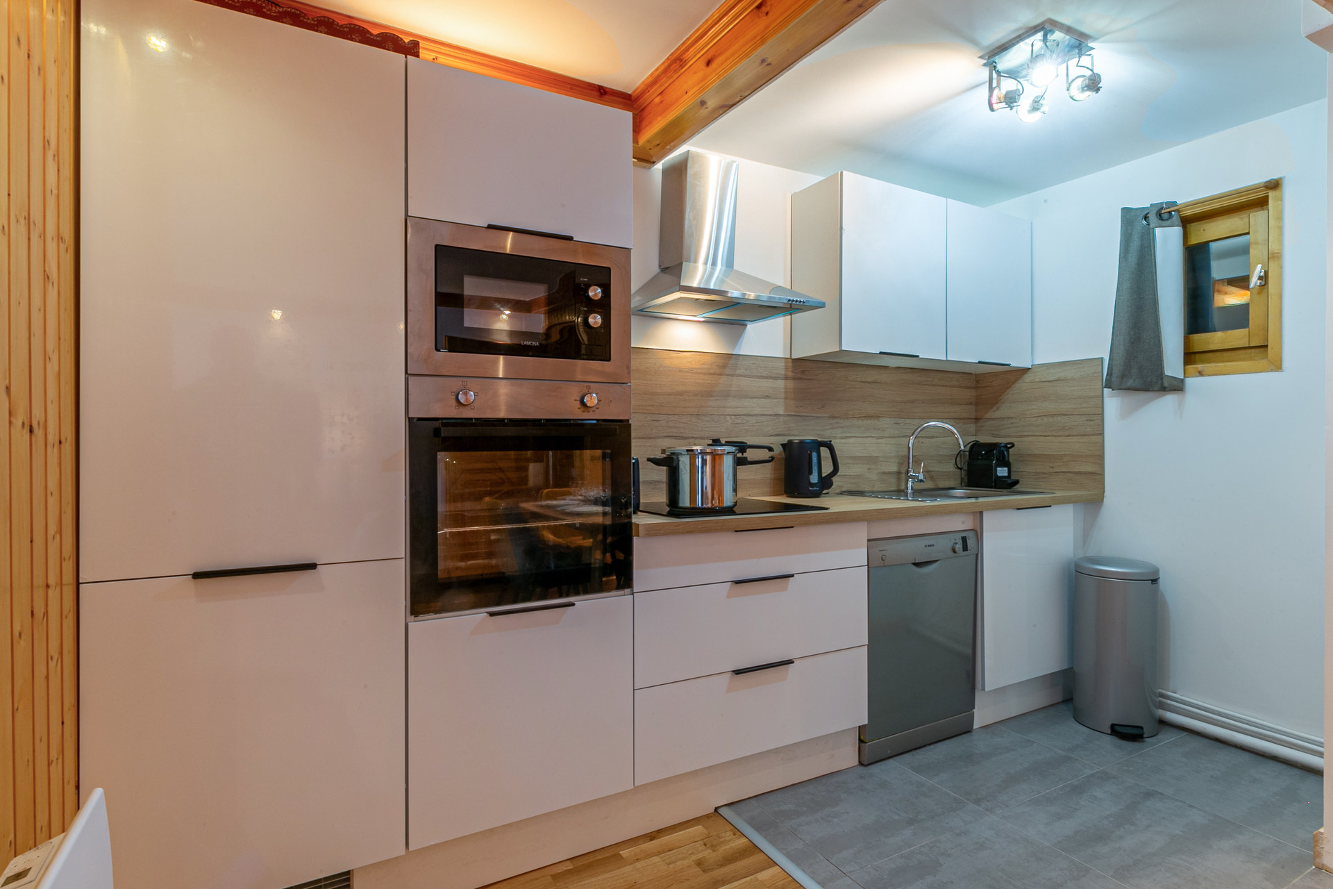 Equipée d'un lave-vaisselle, hotte aspirante, four micro-ondes, four, plaque induction, réfrigérateur avec congélateur
