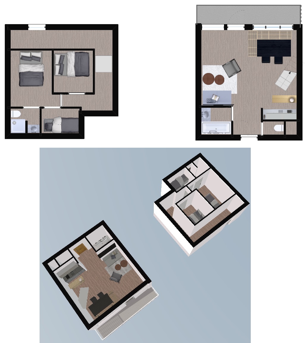 1 lit double 160x200 cm sur socle bois + télévision avec salle de douche/wc attenante
