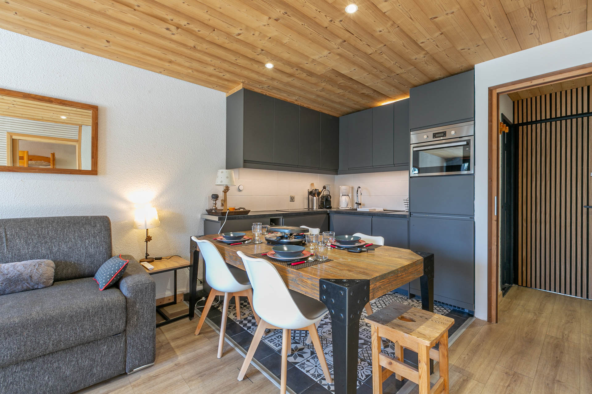 Equipée d'un four micro-ondes combiné, plaque induction, réfrigérateur avec congélateur et lave-vaisselle