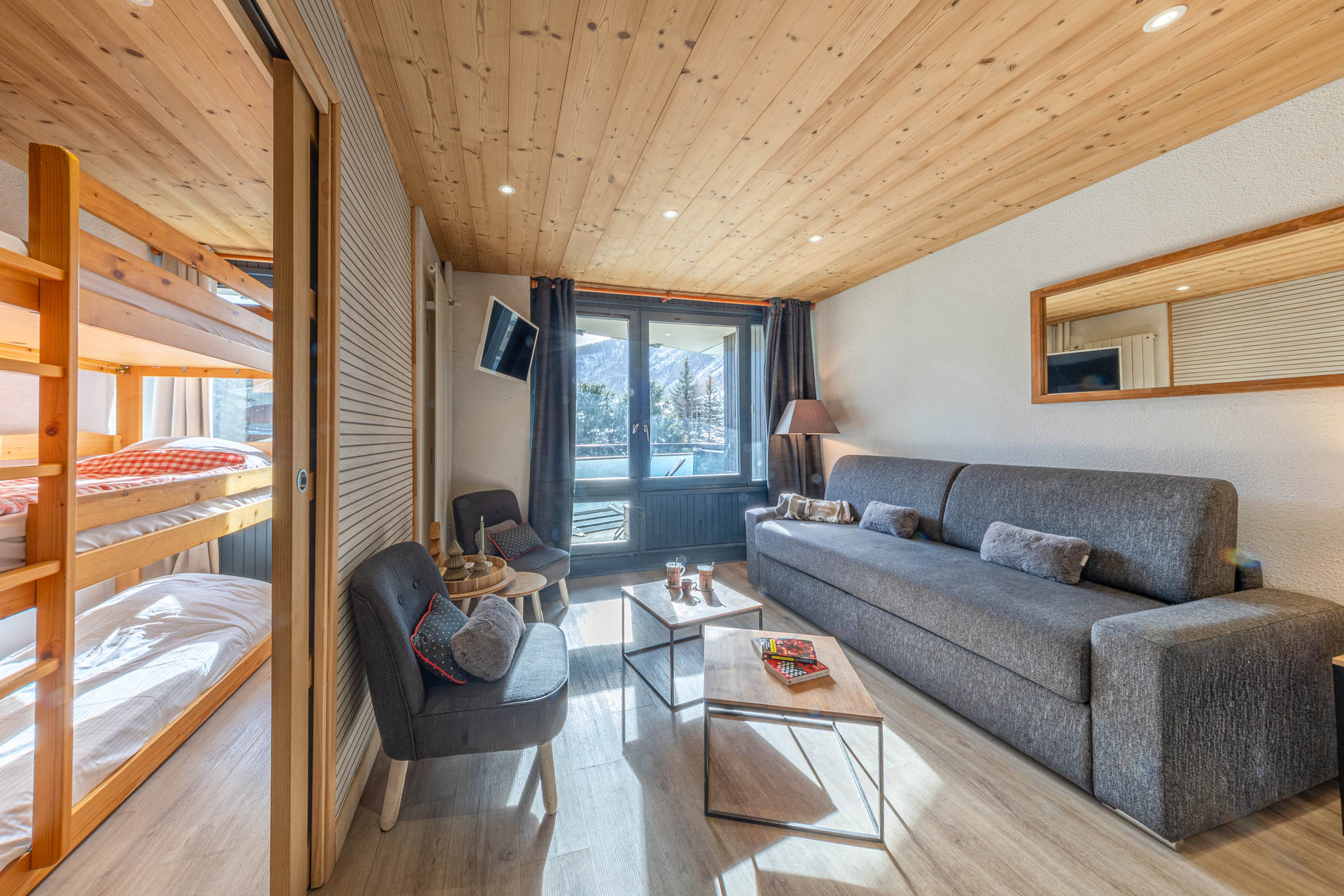 A proximité du centre commercial (commerces, restaurants, location de skis, cours de skis…), accès par galerie couverte.