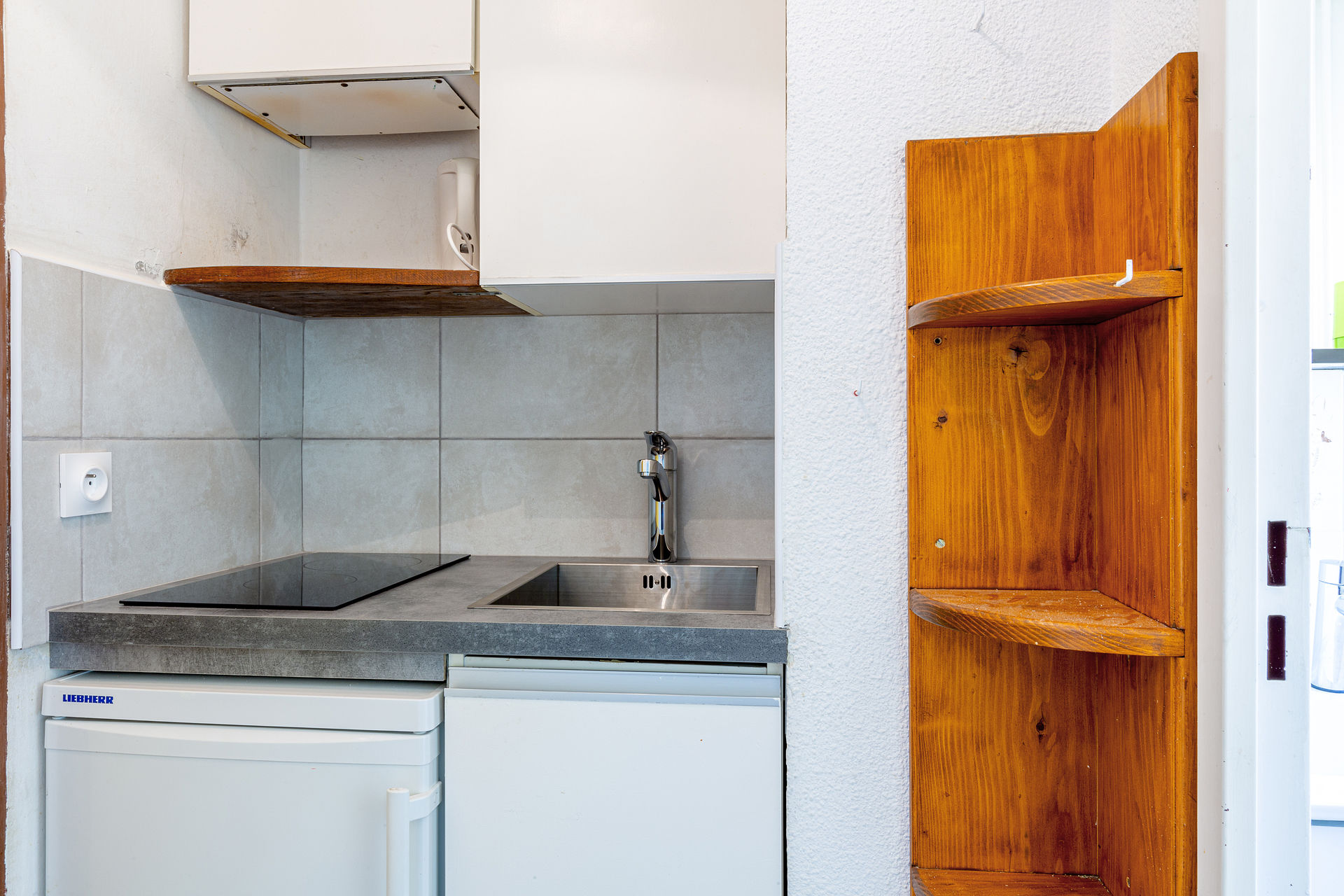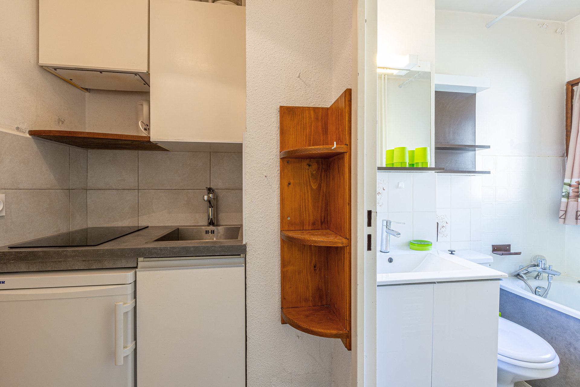Kitchenette équipée d'un petit four, plaque vitrocéramique, hotte aspirante, réfrigérateur, four micro-ondes