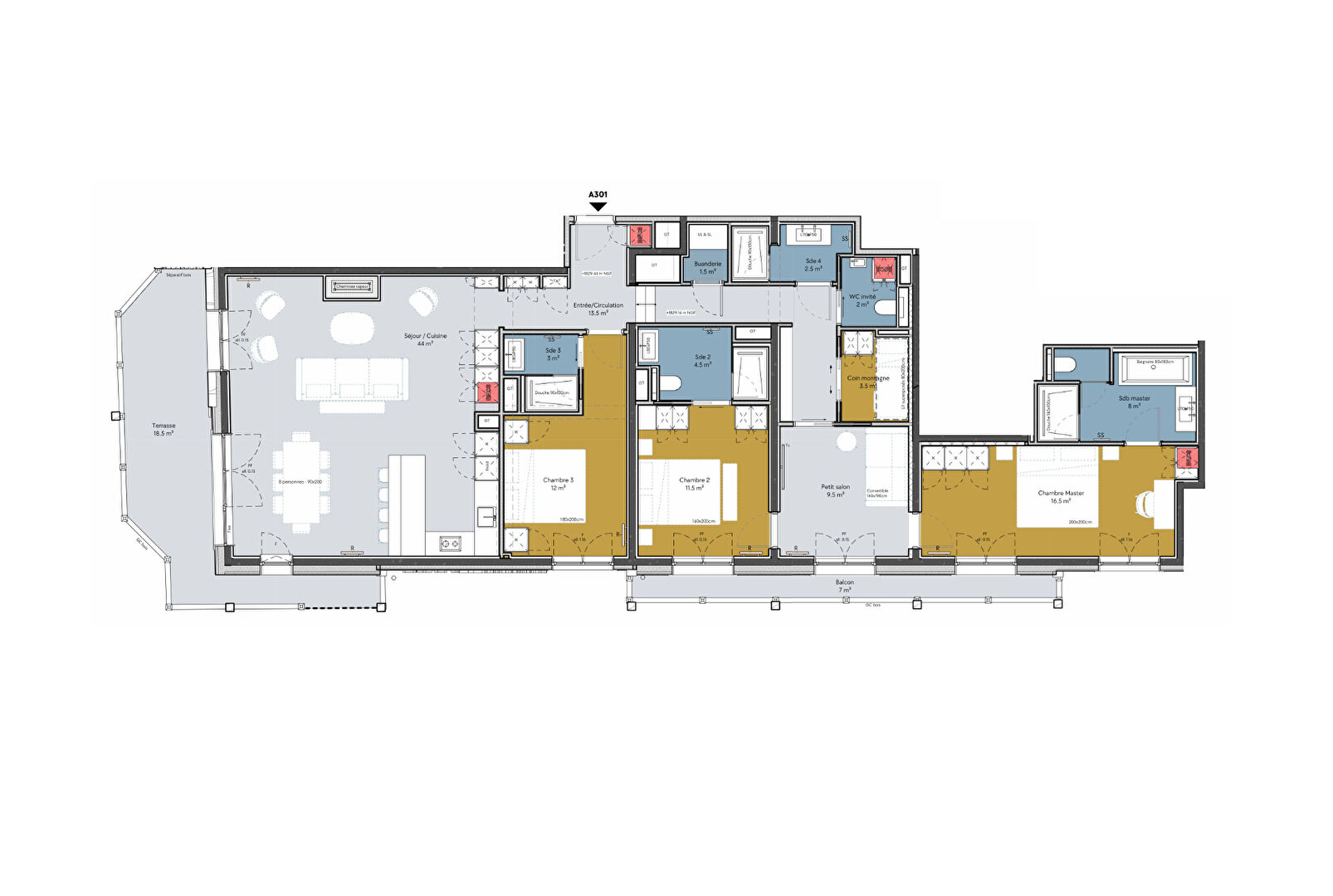 Ce superbe appartement familial aux volumes harmonieux, est situé au 3ème étage d'une résidence haut de gamme au coeur de la station. Il se distingue par une belle pièce de vie baignée de lumière et sublimée par une cheminée qui lui apporte une atmosphère chaleureuse et raffinée. Cet espace s'ouvre sur une agréable terrasse, exposée plein Sud. Coté nuit, vous attendent : une chambre de maître avec salle de bains/douche, deux belles chambres doubles en suite, une cabine avec lit superposés pour les plus jeunes et salle de douche attenante. Un petit séjour propose également un couchage d'appoint. Ce bien est vendu avec un espace de stockage, un casier à skis et deux places de stationnement au sein de la résidence. Livraison Décembre 2027. Copropriété de 11 lots (Pas de procédure en cours).